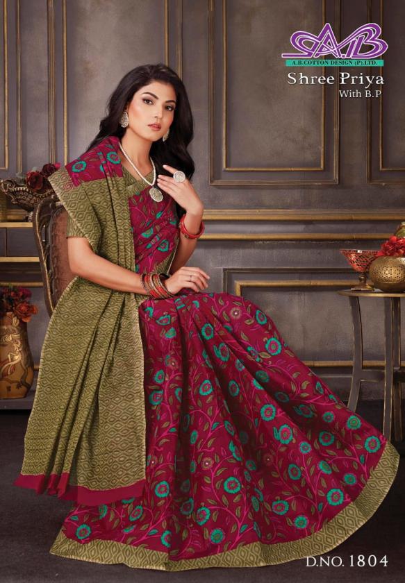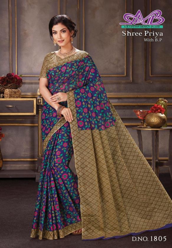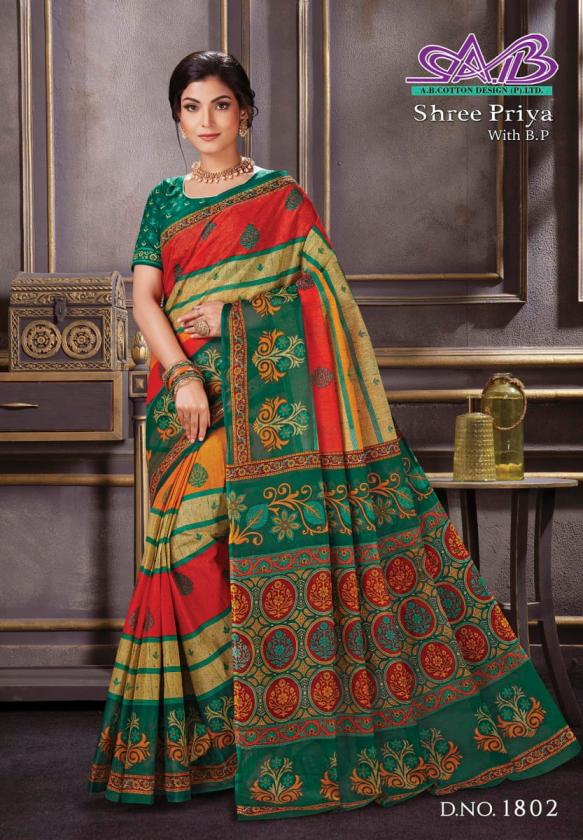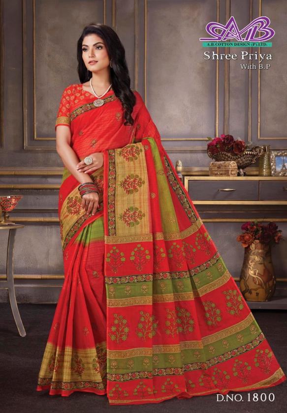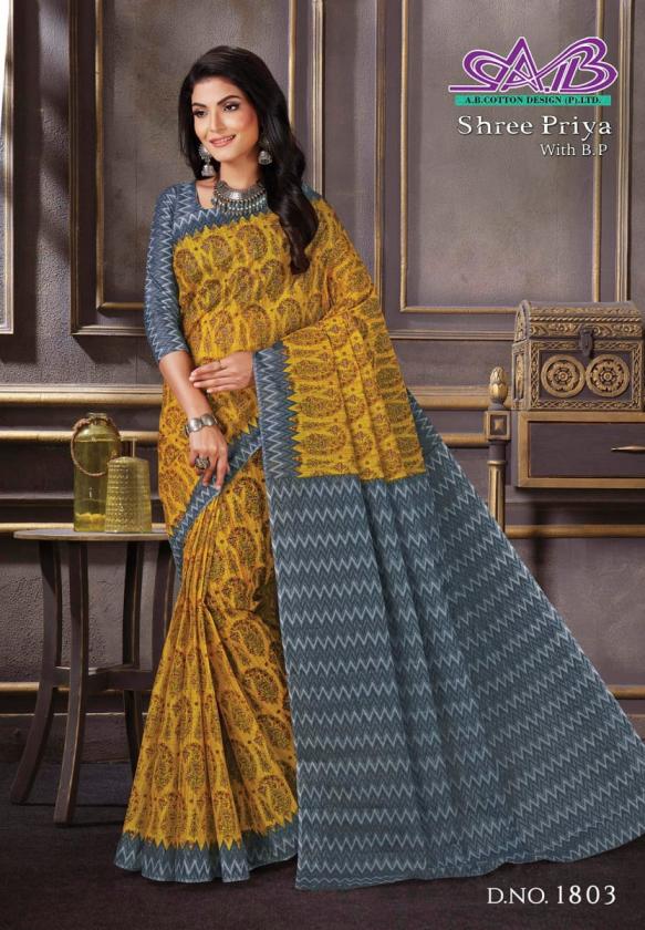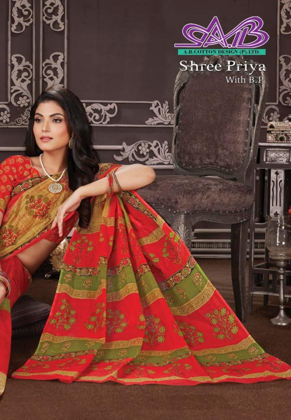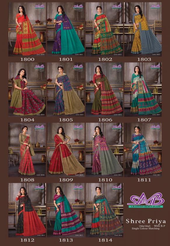 Looking for SHREE PRIYA BY AB MUL MUL COTTON STYLISH SAREES ONLINE Full Catalouge at Best Price? Buy Now SHREE PRIYA BY AB MUL MUL COTTON STYLISH SAREES ONLINE at Wholesale Rate of Rs 8025 with Total 15 Pcs from authroized dealer and supplier of A B Cotton Design Brand. Cost of Each piece is just only Rs 535 which is very low and affordable price to resale the product in your retail store. rrgandhi is Surat based Wholesale Supplier & Dealer of A B Cotton Design Brand. Click on Brand name to Know more about Brand's products.