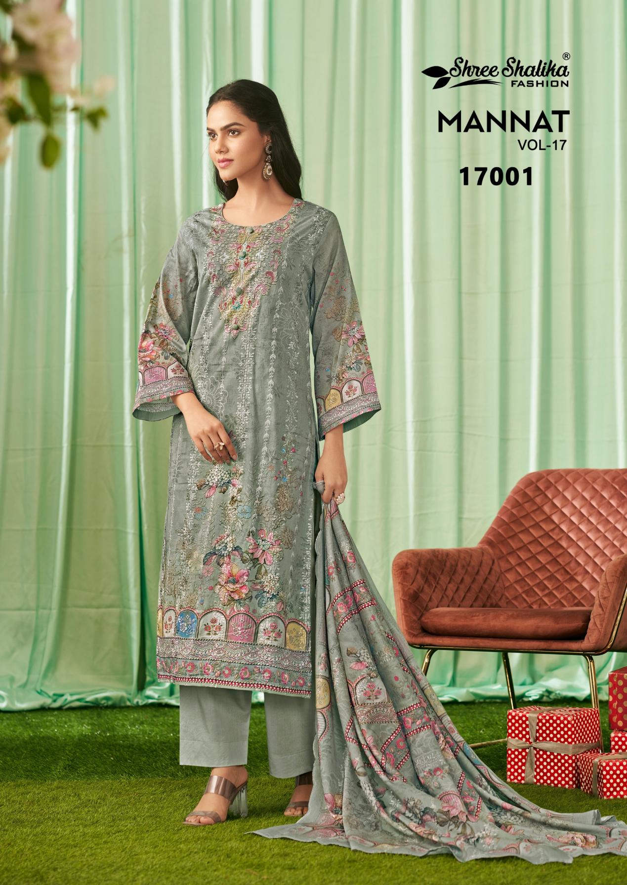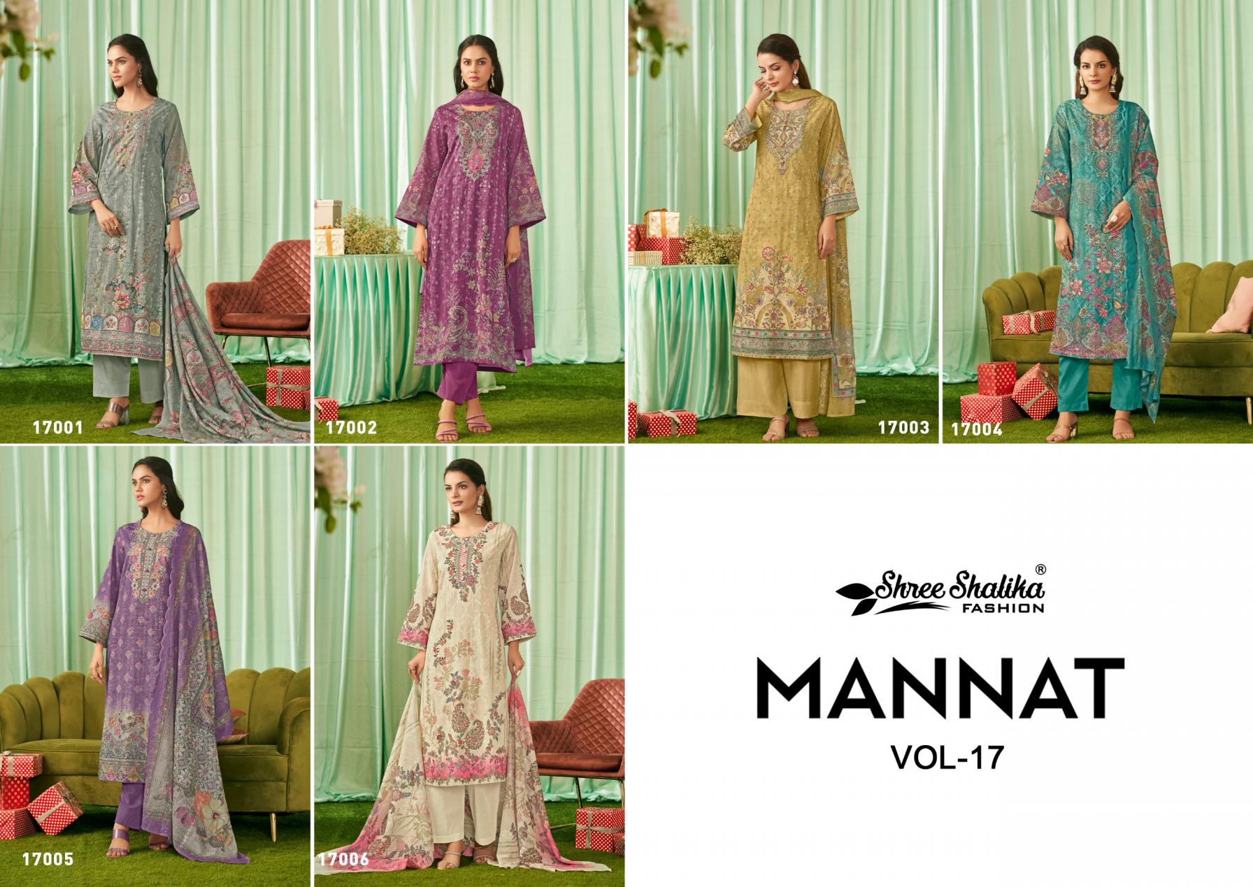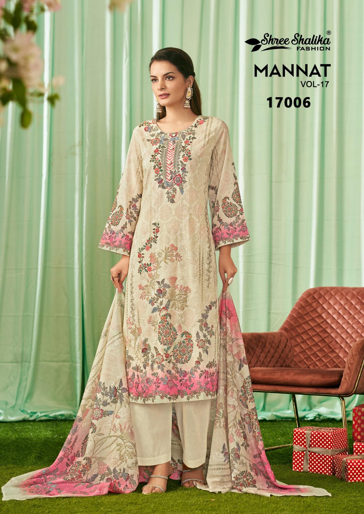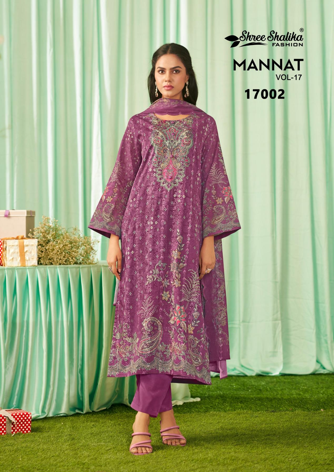 Looking for SHREE SHALIKA FASHION MANNAT VOL 17 COTTON LAWN UNSTITCH SUITS Full Catalouge at Best Price? Buy Now SHREE SHALIKA FASHION MANNAT VOL 17 COTTON LAWN UNSTITCH SUITS at Wholesale Rate of Rs 11970 with Total 6 Pcs from authroized dealer and supplier of Shree Shalika Fashion Brand. Cost of Each piece is just only Rs 1995 which is very low and affordable price to resale the product in your retail store. rrgandhi is Surat based Wholesale Supplier & Dealer of Shree Shalika Fashion Brand. Click on Brand name to Know more about Brand's products.