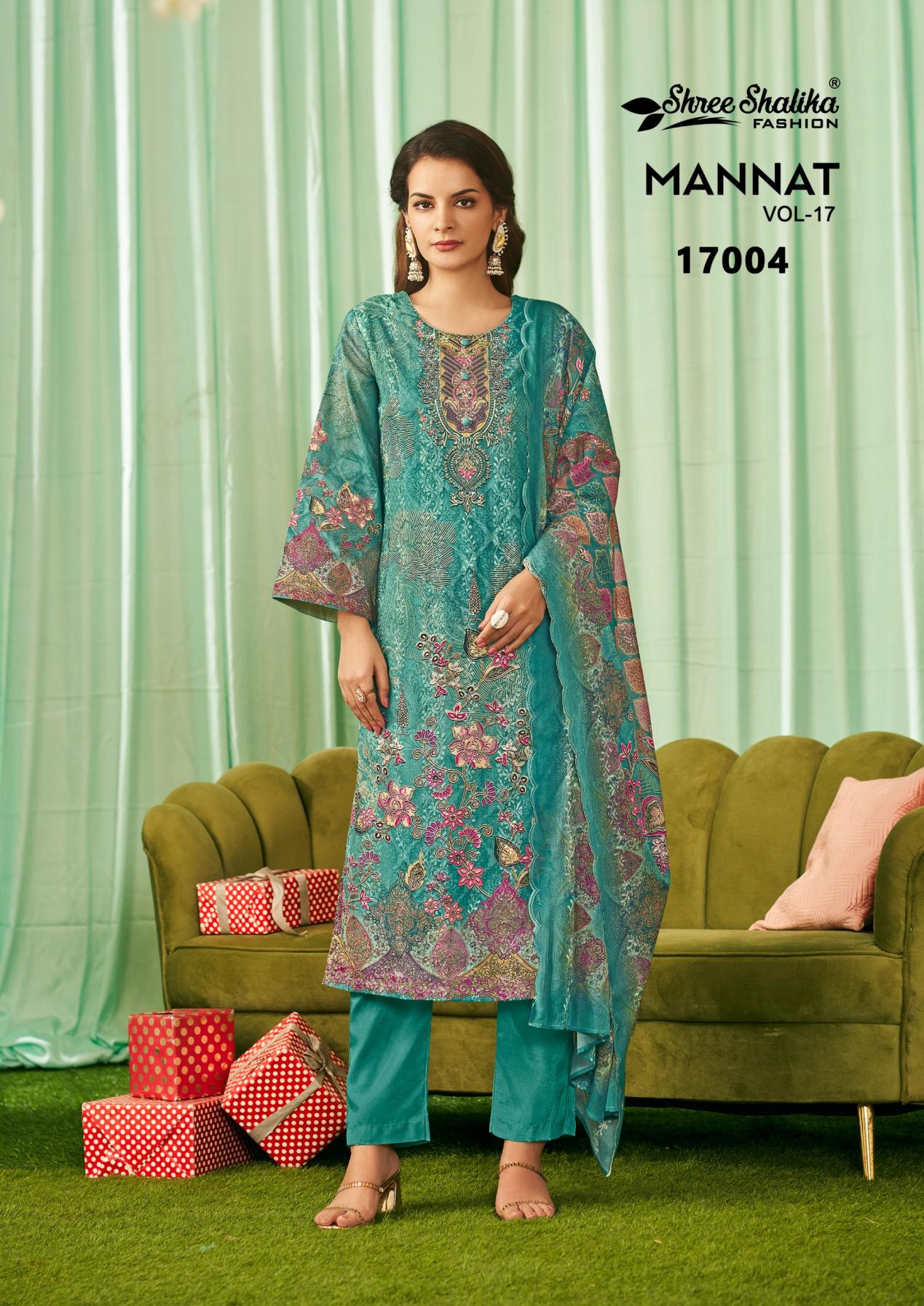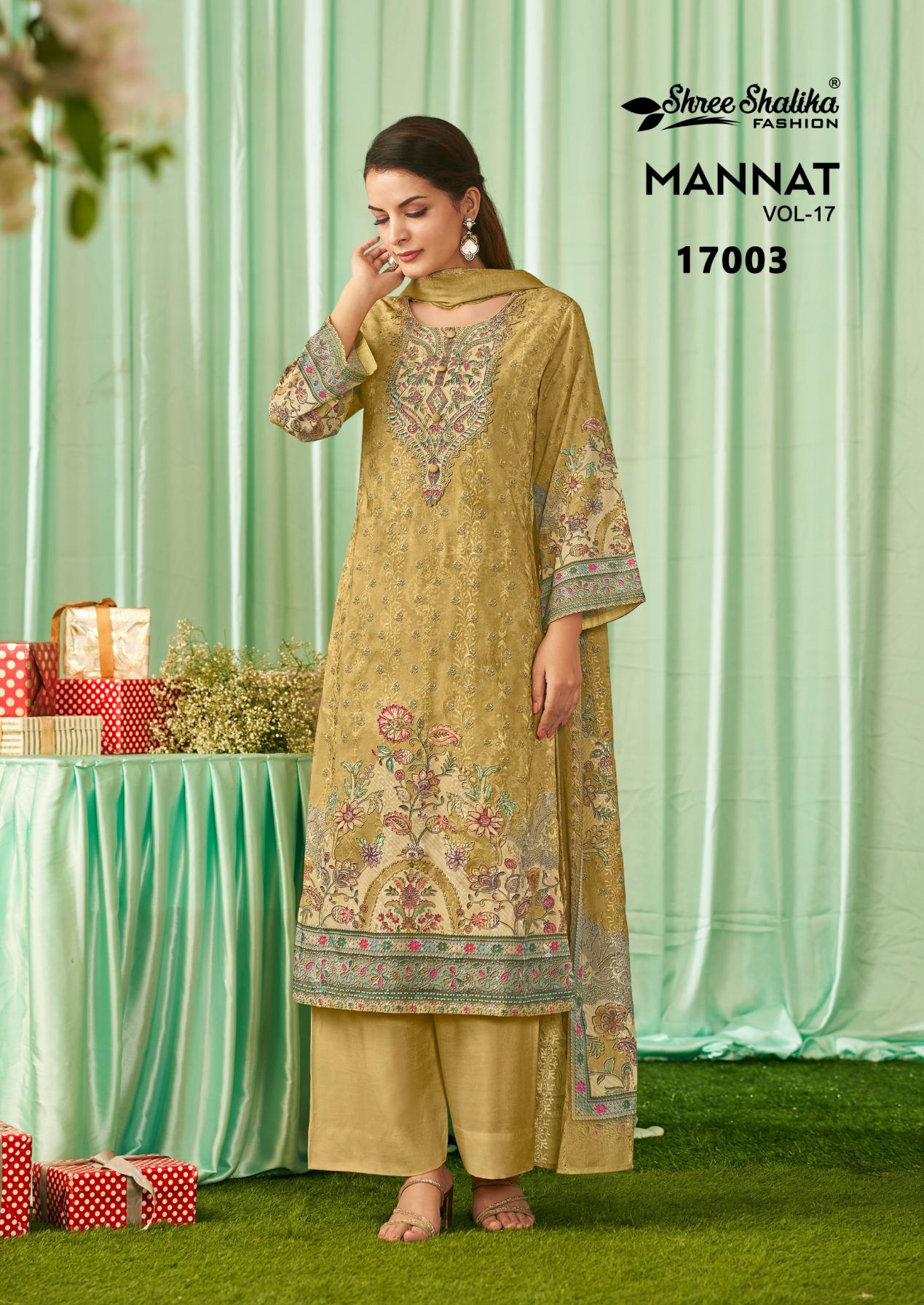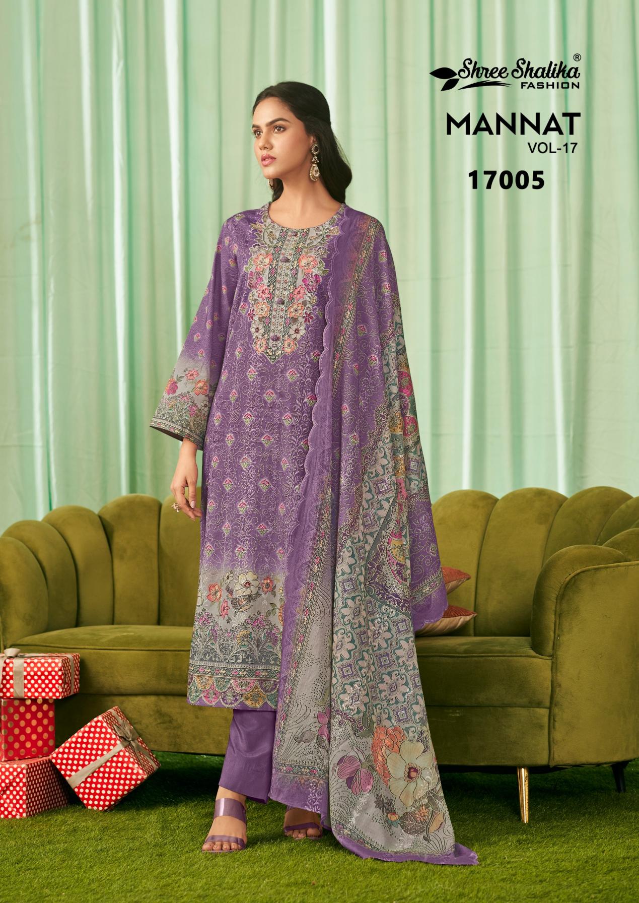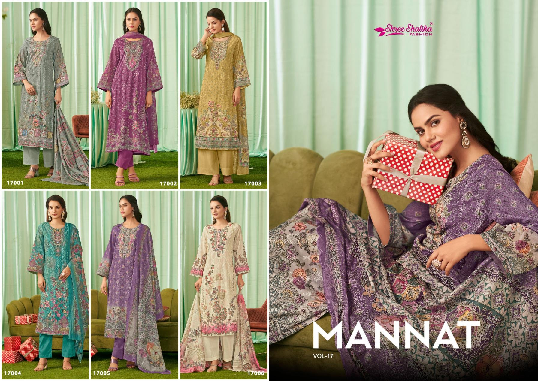 Looking for SHREE SHALIKA FASHION MANNAT VOL 17 COTTON LAWN UNSTITCH SUITS Full Catalouge at Best Price? Buy Now SHREE SHALIKA FASHION MANNAT VOL 17 COTTON LAWN UNSTITCH SUITS at Wholesale Rate of Rs 11970 with Total 6 Pcs from authroized dealer and supplier of Shree Shalika Fashion Brand. Cost of Each piece is just only Rs 1995 which is very low and affordable price to resale the product in your retail store. rrgandhi is Surat based Wholesale Supplier & Dealer of Shree Shalika Fashion Brand. Click on Brand name to Know more about Brand's products.