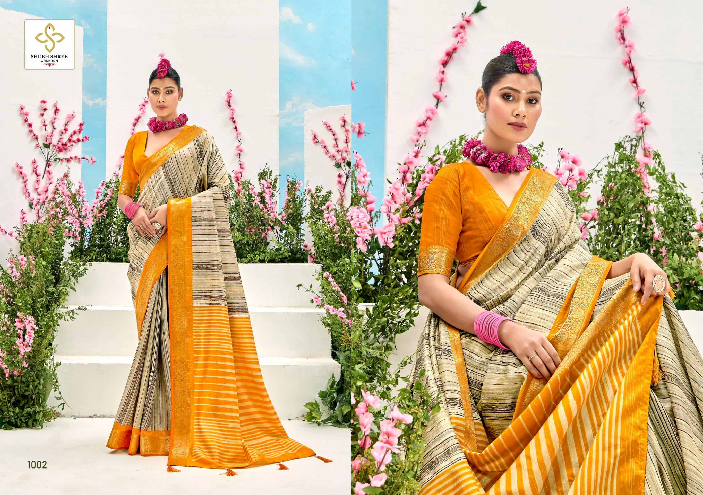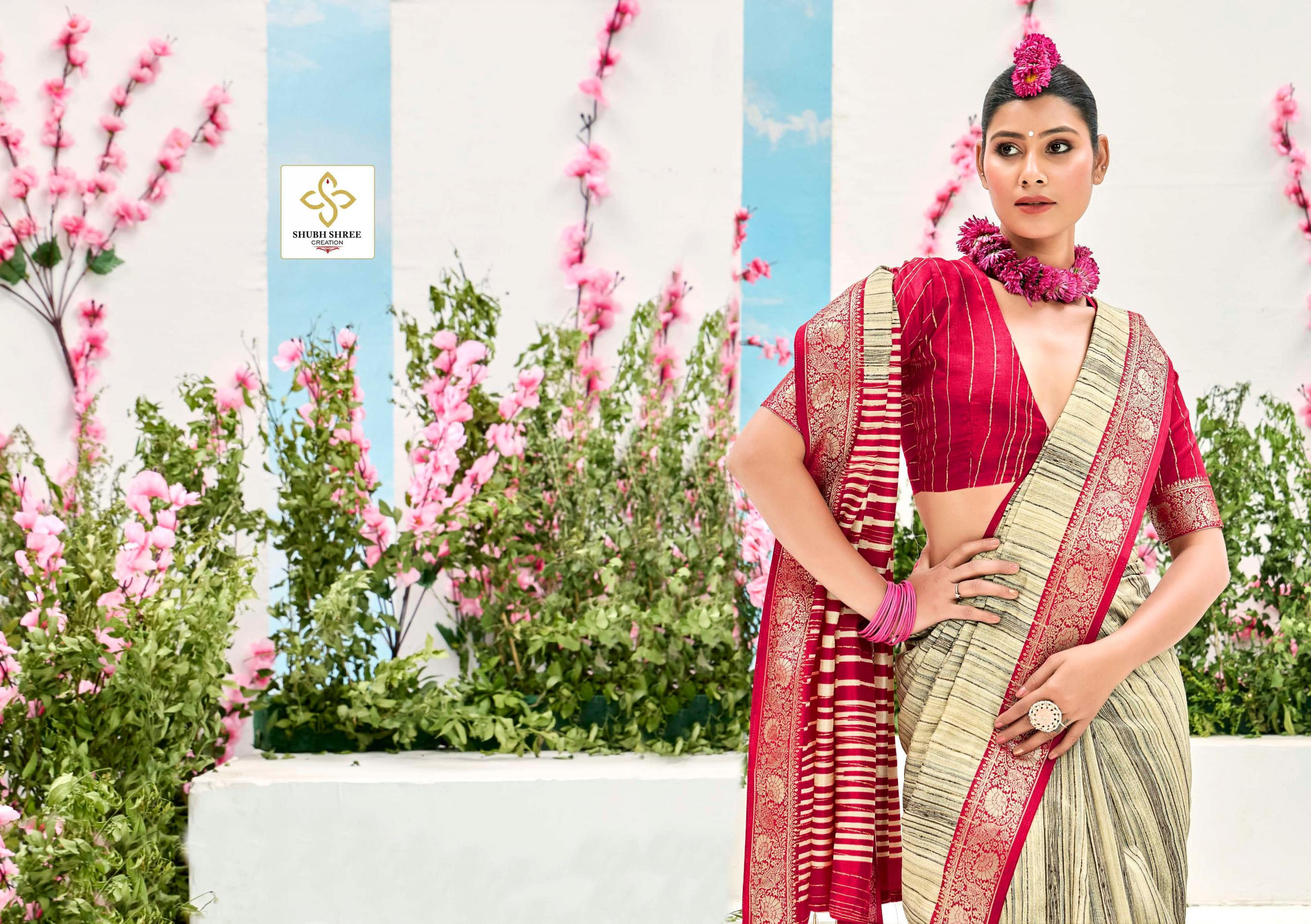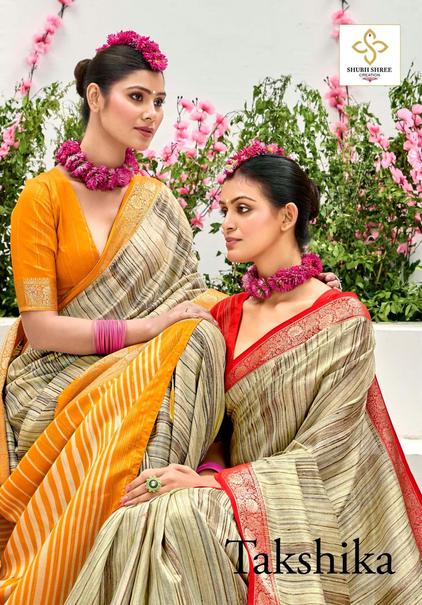 Looking for SHUBH SHREE CREATION TAKSHIKA KHADI KASAB JACQUARD UNIQUE SAREES Full Catalouge at Best Price? Buy Now SHUBH SHREE CREATION TAKSHIKA KHADI KASAB JACQUARD UNIQUE SAREES at Wholesale Rate of Rs 5250 with Total 6 Pcs from authroized dealer and supplier of Shubh Shree Creation Brand. Cost of Each piece is just only Rs 875 which is very low and affordable price to resale the product in your retail store. rrgandhi is Surat based Wholesale Supplier & Dealer of Shubh Shree Creation Brand. Click on Brand name to Know more about Brand's products.