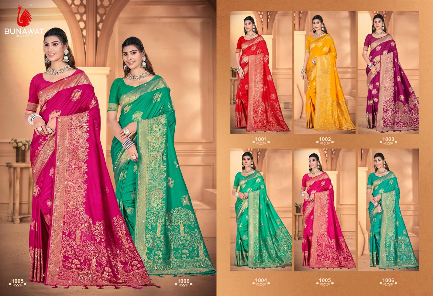 Looking for Shubhshree Vol-3 By Bunawat Wedding Wear New Designer Silk Sarees Collection Full Catalouge at Best Price? Buy Now Shubhshree Vol-3 By Bunawat Wedding Wear New Designer Silk Sarees Collection at Wholesale Rate of Rs 8394 with Total 6 Pcs from authroized dealer and supplier of Bunawat Brand. Cost of Each piece is just only Rs 1399 which is very low and affordable price to resale the product in your retail store. rrgandhi is Surat based Wholesale Supplier & Dealer of Bunawat Brand. Click on Brand name to Know more about Brand's products.