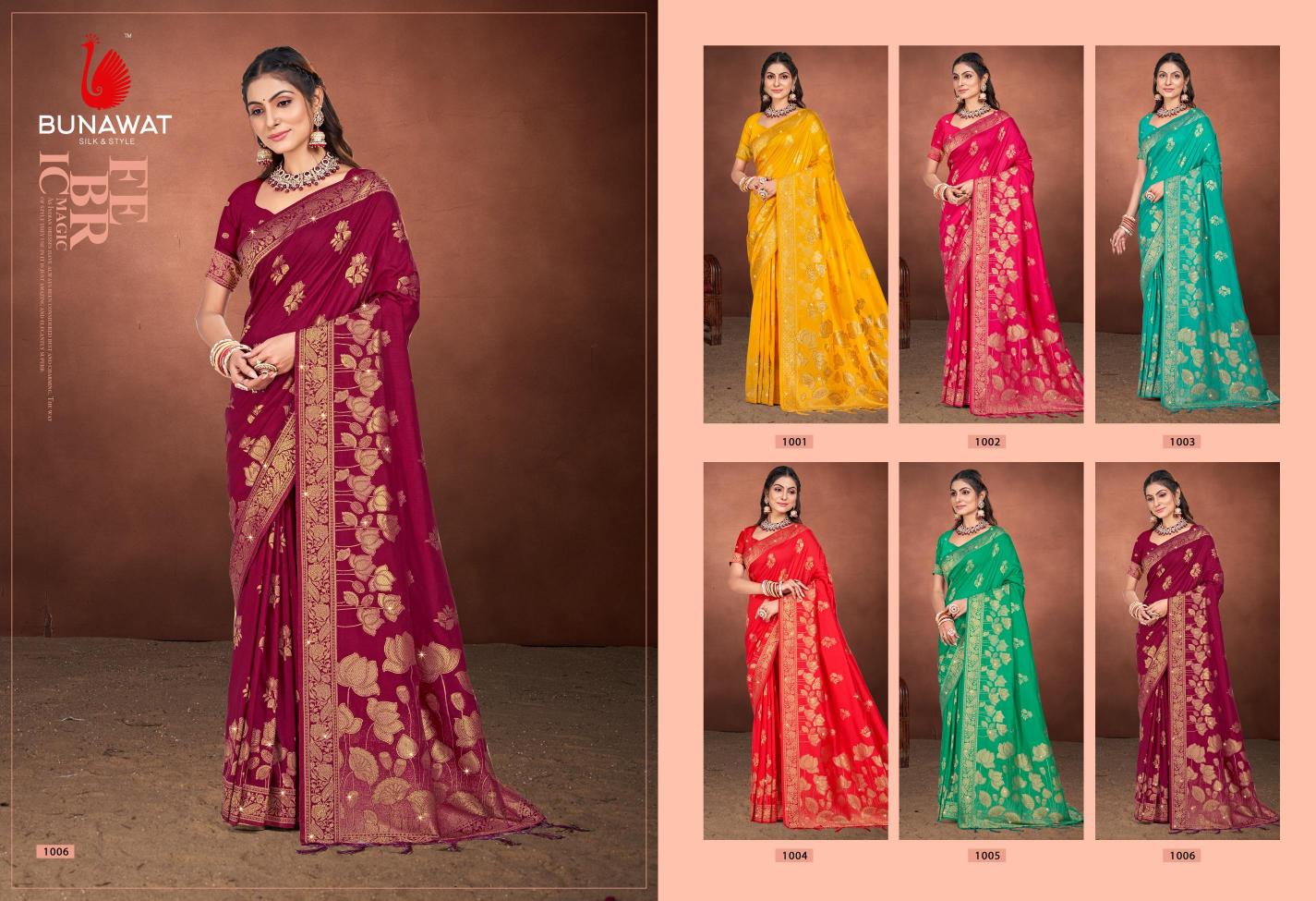 Looking for Shubhshree Vol-5 Party Wear New Designer Fancy Silk Sarees Collection Full Catalouge at Best Price? Buy Now Shubhshree Vol-5 Party Wear New Designer Fancy Silk Sarees Collection at Wholesale Rate of Rs 8394 with Total 6 Pcs from authroized dealer and supplier of Bunawat Brand. Cost of Each piece is just only Rs 1399 which is very low and affordable price to resale the product in your retail store. rrgandhi is Surat based Wholesale Supplier & Dealer of Bunawat Brand. Click on Brand name to Know more about Brand's products.
