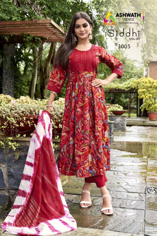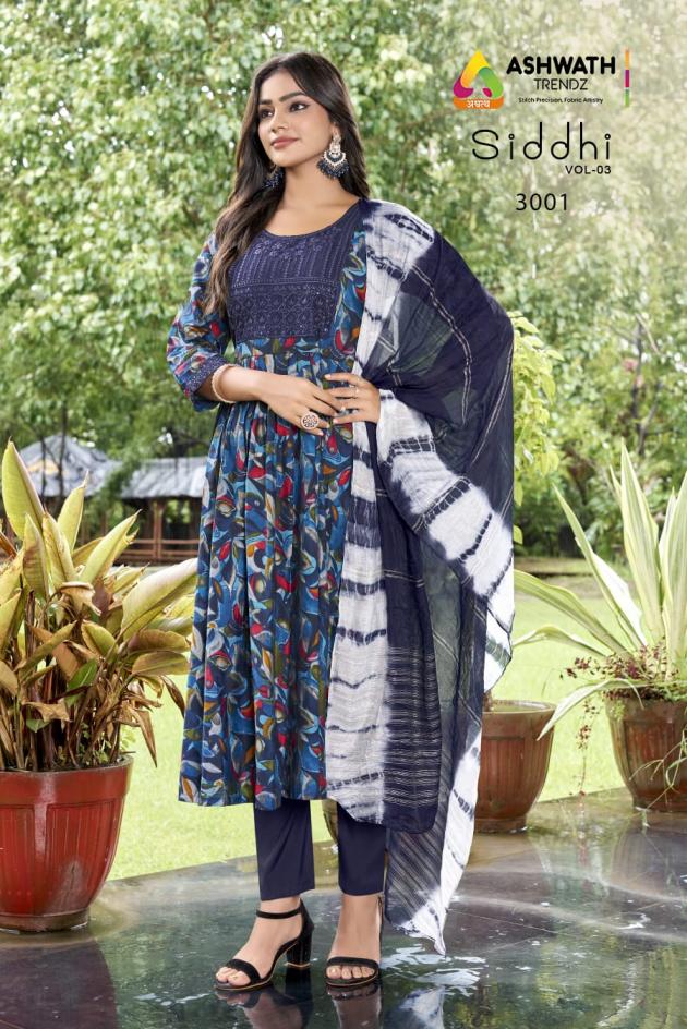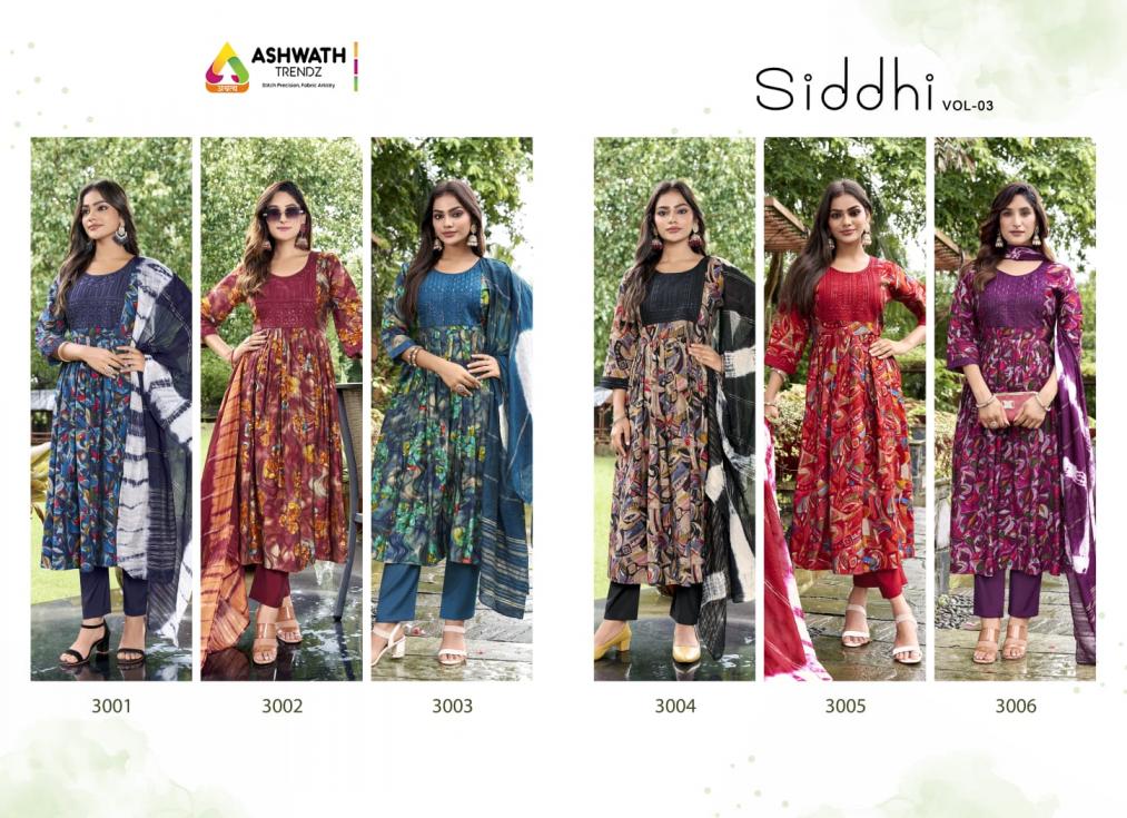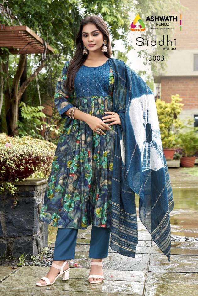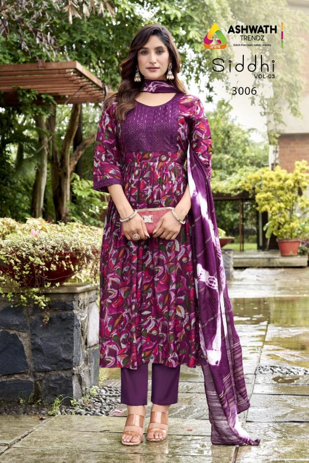 Looking for SIDDHI VOL 3 BY ASHWATH TRENDZ READYMADE ROMAN PRINT COMBO SUITS Full Catalouge at Best Price? Buy Now SIDDHI VOL 3 BY ASHWATH TRENDZ READYMADE ROMAN PRINT COMBO SUITS at Wholesale Rate of Rs 14760 with Total 24 Pcs from authroized dealer and supplier of Ashwath Trendz Brand. Cost of Each piece is just only Rs 615 which is very low and affordable price to resale the product in your retail store. rrgandhi is Surat based Wholesale Supplier & Dealer of Ashwath Trendz Brand. Click on Brand name to Know more about Brand's products.
