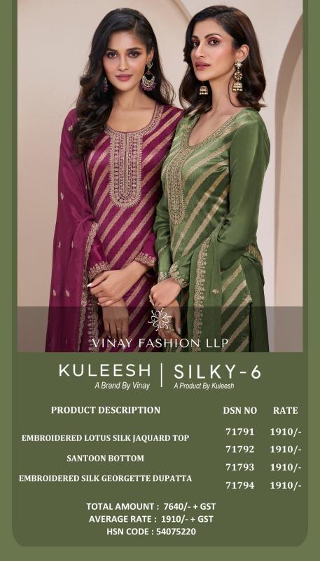 Looking for silky vol 6 by vinay kuleesh lotus silk jacquard luxurious 3pcs dress for women Full Catalouge at Best Price? Buy Now silky vol 6 by vinay kuleesh lotus silk jacquard luxurious 3pcs dress for women at Wholesale Rate of Rs 7640 with Total 4 Pcs from authroized dealer and supplier of Vinay Fashion Brand. Cost of Each piece is just only Rs 1910 which is very low and affordable price to resale the product in your retail store. rrgandhi is Surat based Wholesale Supplier & Dealer of Vinay Fashion Brand. Click on Brand name to Know more about Brand's products.