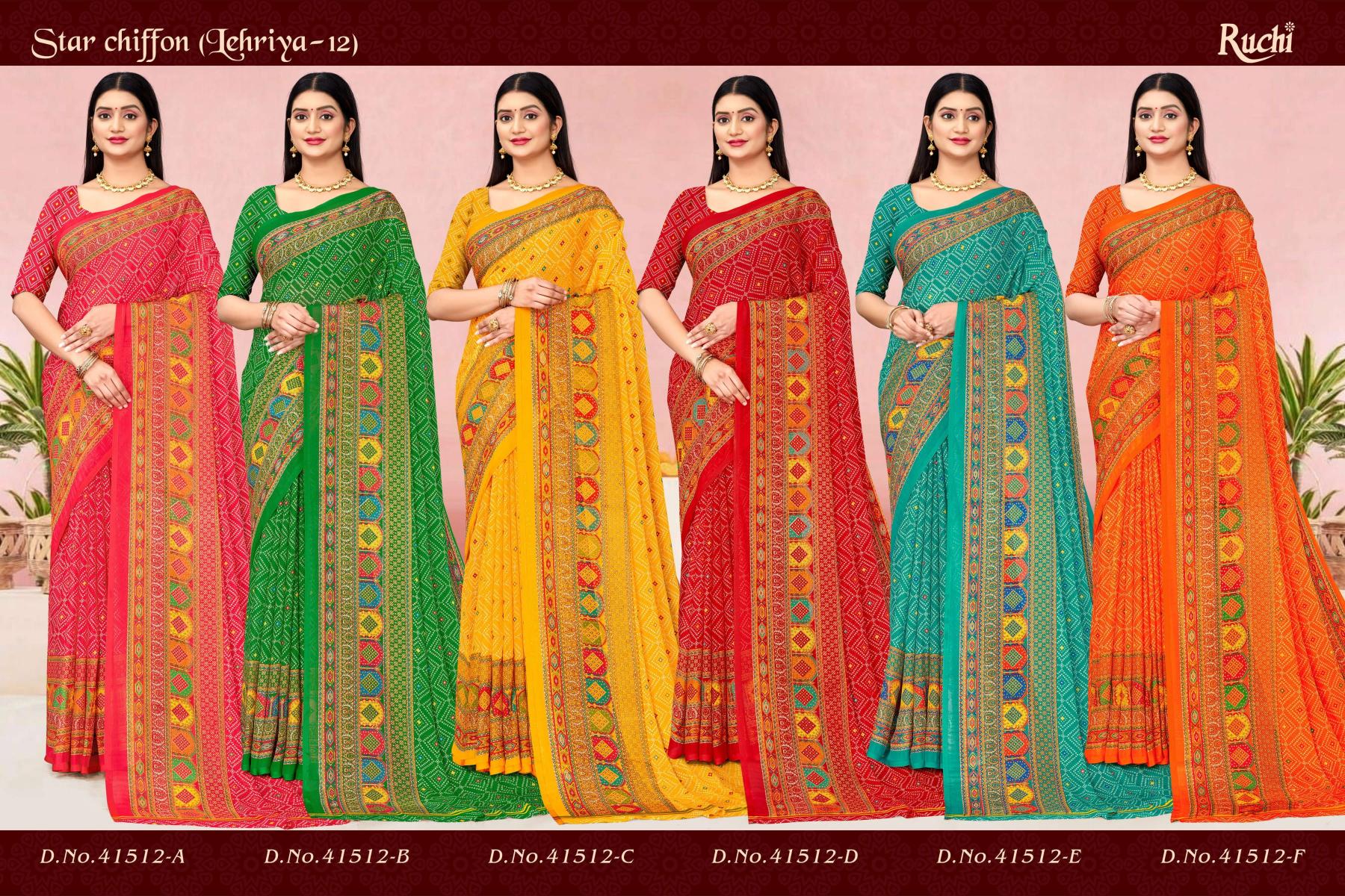 Looking for star chiffon lehriya vol 12 by ruchi hit design chiffon sarees Full Catalouge at Best Price? Buy Now star chiffon lehriya vol 12 by ruchi hit design chiffon sarees at Wholesale Rate of Rs 2502 with Total 6 Pcs from authroized dealer and supplier of Ruchi Brand. Cost of Each piece is just only Rs 417 which is very low and affordable price to resale the product in your retail store. rrgandhi is Surat based Wholesale Supplier & Dealer of Ruchi Brand. Click on Brand name to Know more about Brand's products.