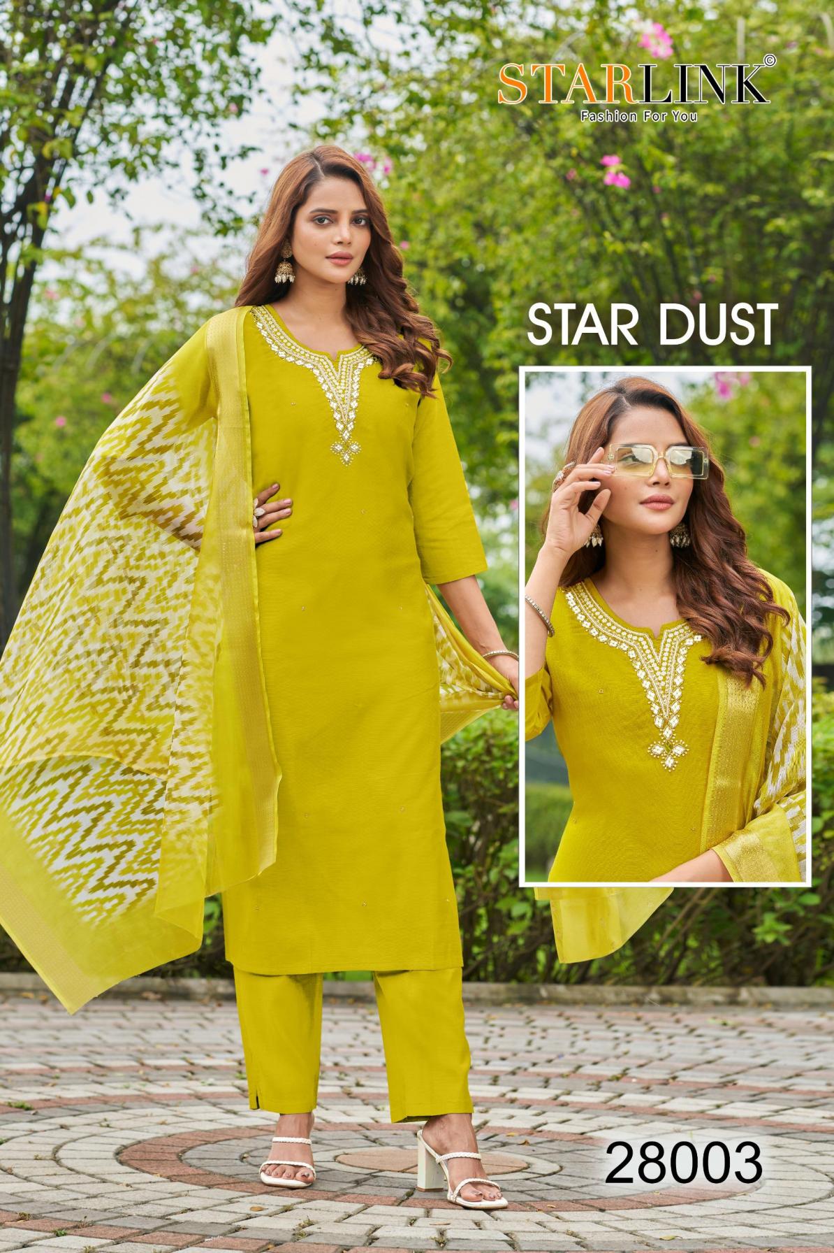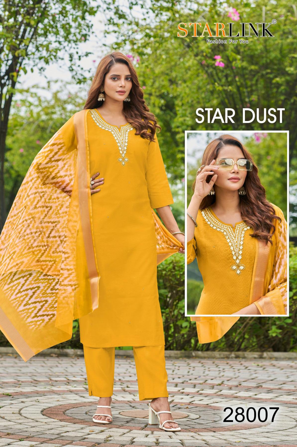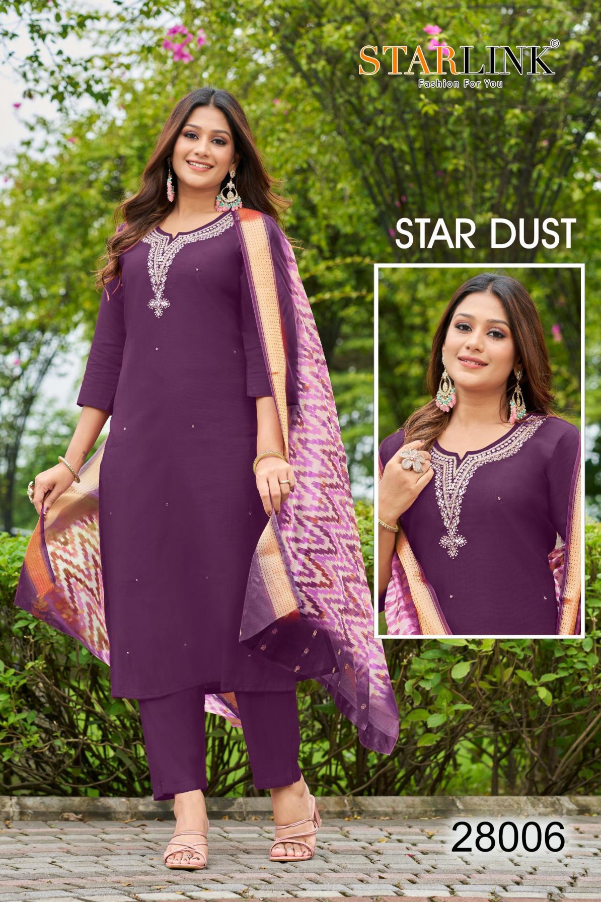 Looking for STARLINK STAR DUST VATRICAN DYED FULLY STITCH CLASSIC COMBO SUITS Full Catalouge at Best Price? Buy Now STARLINK STAR DUST VATRICAN DYED FULLY STITCH CLASSIC COMBO SUITS at Wholesale Rate of Rs 48250 with Total 50 Pcs from authroized dealer and supplier of Starlink Brand. Cost of Each piece is just only Rs 965 which is very low and affordable price to resale the product in your retail store. rrgandhi is Surat based Wholesale Supplier & Dealer of Starlink Brand. Click on Brand name to Know more about Brand's products.