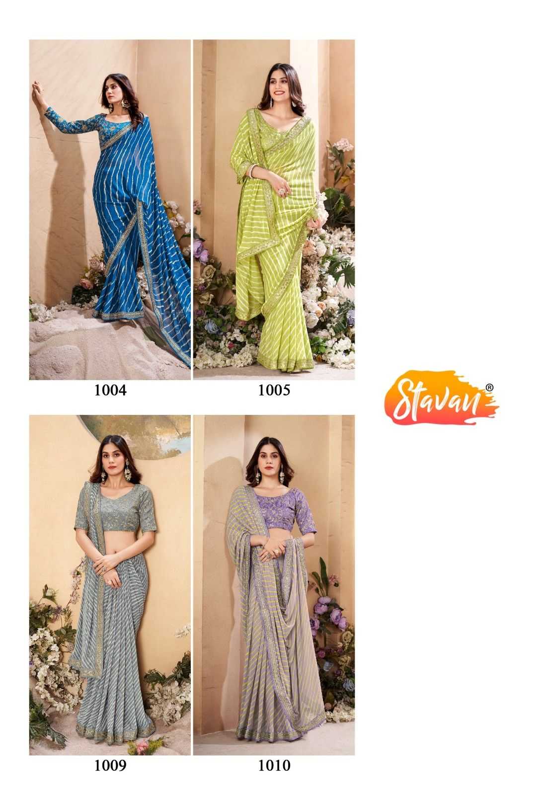 Looking for stavan veena weightless in leheriya unique colours saree with blouse Full Catalouge at Best Price? Buy Now stavan veena weightless in leheriya unique colours saree with blouse at Wholesale Rate of Rs 7250 with Total 10 Pcs from authroized dealer and supplier of Brand. Cost of Each piece is just only Rs 725 which is very low and affordable price to resale the product in your retail store. rrgandhi is Surat based Wholesale Supplier & Dealer of Brand. Click on Brand name to Know more about Brand's products.