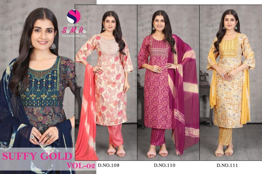 Looking for SUFFY GOLD VOL 2 BY SAMARA CAPSULE PRINT REGULAR WEAR SALWAR KAMEEZ Full Catalouge at Best Price? Buy Now SUFFY GOLD VOL 2 BY SAMARA CAPSULE PRINT REGULAR WEAR SALWAR KAMEEZ at Wholesale Rate of Rs 2375 with Total 5 Pcs from authroized dealer and supplier of samara Brand. Cost of Each piece is just only Rs 475 which is very low and affordable price to resale the product in your retail store. rrgandhi is Surat based Wholesale Supplier & Dealer of samara Brand. Click on Brand name to Know more about Brand's products.