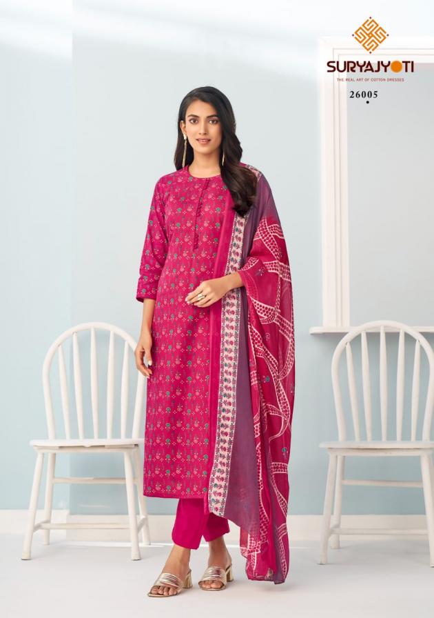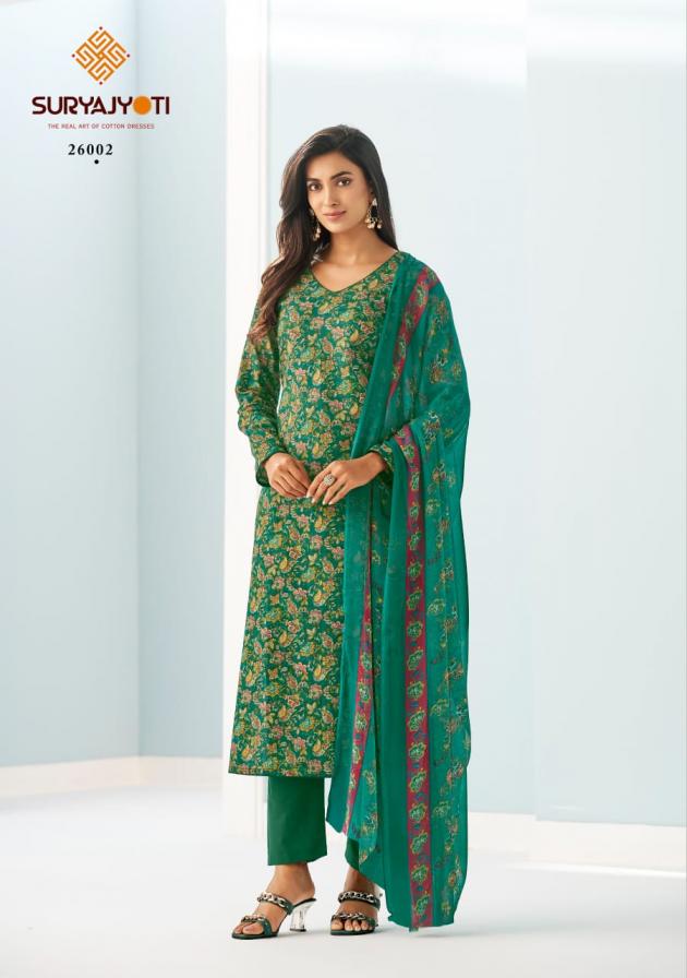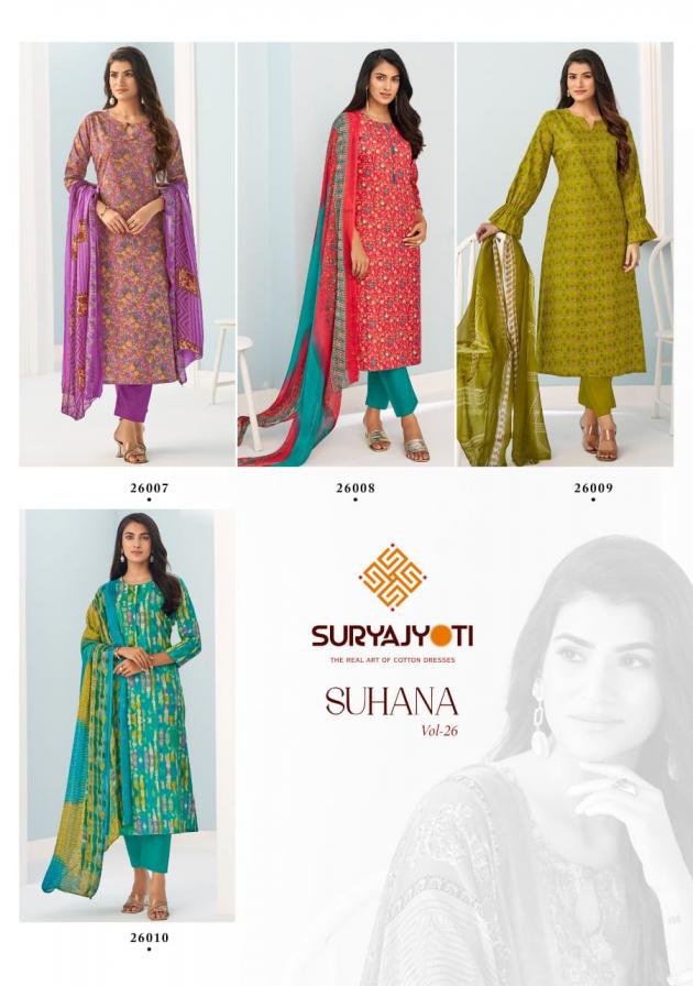 Looking for SUHANA VOL 26 BY SURYAJYOTI CAMBRIC COTTON DRESS MATERIALS Full Catalouge at Best Price? Buy Now SUHANA VOL 26 BY SURYAJYOTI CAMBRIC COTTON DRESS MATERIALS at Wholesale Rate of Rs 5050 with Total 10 Pcs from authroized dealer and supplier of Suryajyoti Cotton Brand. Cost of Each piece is just only Rs 505 which is very low and affordable price to resale the product in your retail store. rrgandhi is Surat based Wholesale Supplier & Dealer of Suryajyoti Cotton Brand. Click on Brand name to Know more about Brand's products.