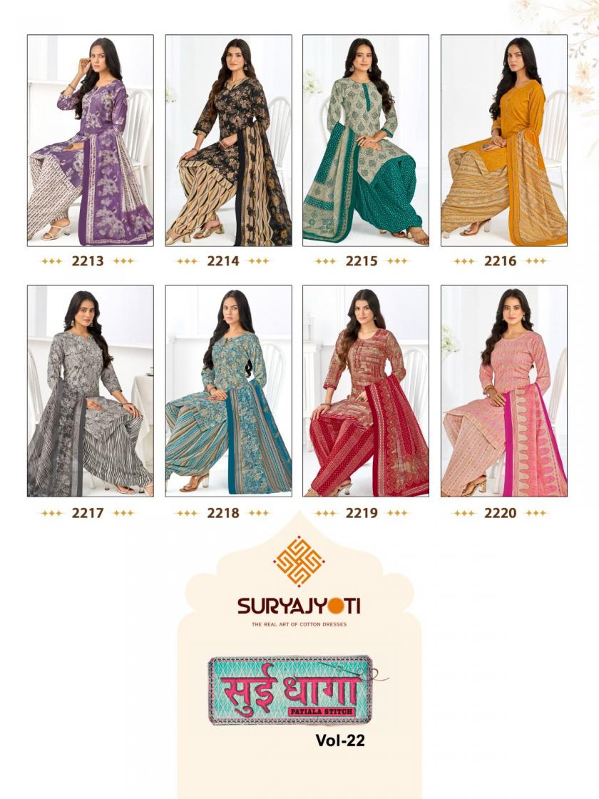 Looking for SUI DHAGA VOL 22 BY SURYAJYOTI COTTON PATIYALA STYLE FULL STITCH BIG SIZE SUITS Full Catalouge at Best Price? Buy Now SUI DHAGA VOL 22 BY SURYAJYOTI COTTON PATIYALA STYLE FULL STITCH BIG SIZE SUITS at Wholesale Rate of Rs 10500 with Total 20 Pcs from authroized dealer and supplier of Suryajyoti Cotton Brand. Cost of Each piece is just only Rs 525 which is very low and affordable price to resale the product in your retail store. rrgandhi is Surat based Wholesale Supplier & Dealer of Suryajyoti Cotton Brand. Click on Brand name to Know more about Brand's products.