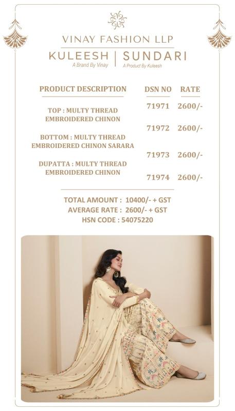 Looking for sundari by vinay kuleesh luxurious multy thread 3pcs dress for women Full Catalouge at Best Price? Buy Now sundari by vinay kuleesh luxurious multy thread 3pcs dress for women at Wholesale Rate of Rs 10400 with Total 4 Pcs from authroized dealer and supplier of Vinay Fashion Brand. Cost of Each piece is just only Rs 2600 which is very low and affordable price to resale the product in your retail store. rrgandhi is Surat based Wholesale Supplier & Dealer of Vinay Fashion Brand. Click on Brand name to Know more about Brand's products.