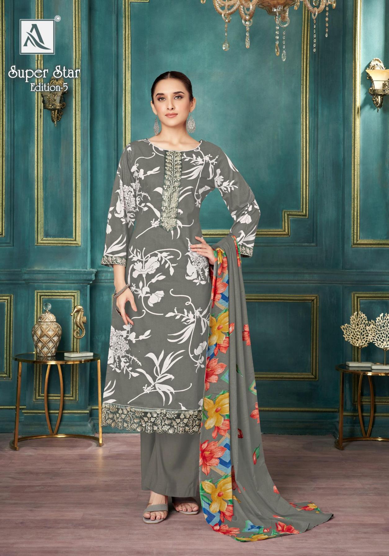 Looking for SUPER STAR VOL 5 BY ALOK CAMBRIC PRINT PAKISTANI SUIT FOR WOMENS Full Catalouge at Best Price? Buy Now SUPER STAR VOL 5 BY ALOK CAMBRIC PRINT PAKISTANI SUIT FOR WOMENS at Wholesale Rate of Rs 3720 with Total 6 Pcs from authroized dealer and supplier of Alok Suit Brand. Cost of Each piece is just only Rs 620 which is very low and affordable price to resale the product in your retail store. rrgandhi is Surat based Wholesale Supplier & Dealer of Alok Suit Brand. Click on Brand name to Know more about Brand's products.