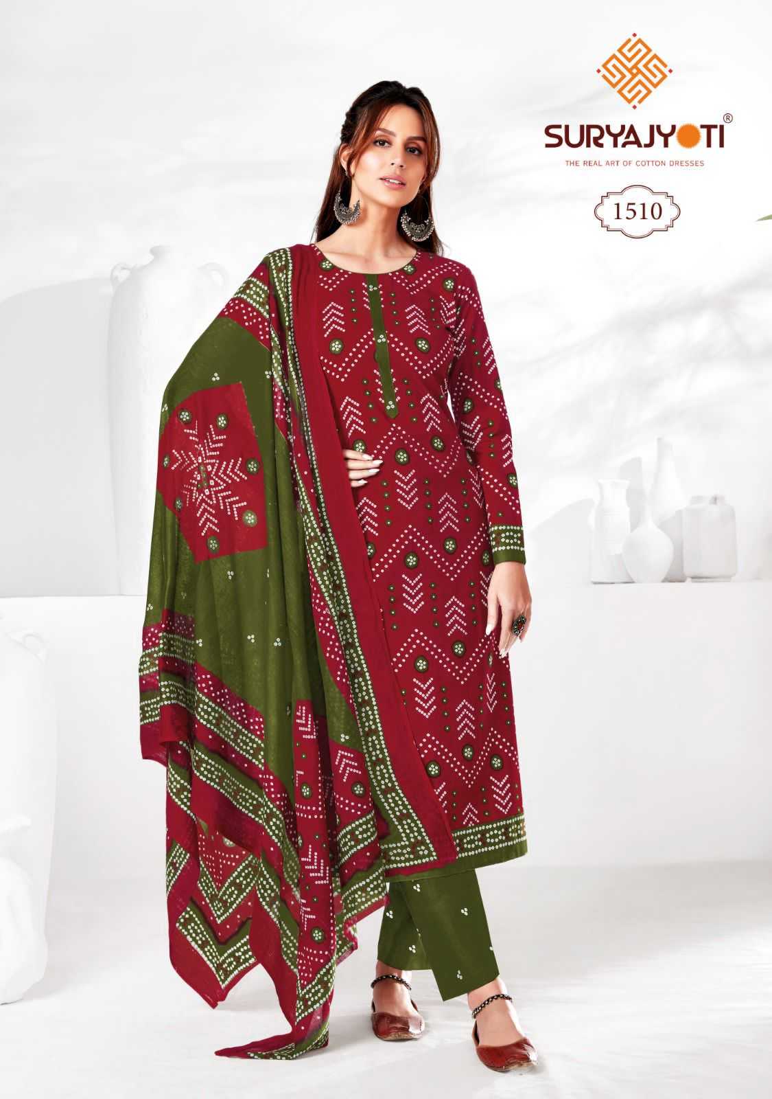 Looking for suryajyoti bandhani special vol 15 launch fancy cotton readymade salwar kameez Full Catalouge at Best Price? Buy Now suryajyoti bandhani special vol 15 launch fancy cotton readymade salwar kameez at Wholesale Rate of Rs 5500 with Total 10 Pcs from authroized dealer and supplier of Suryajyoti Cotton Brand. Cost of Each piece is just only Rs 550 which is very low and affordable price to resale the product in your retail store. rrgandhi is Surat based Wholesale Supplier & Dealer of Suryajyoti Cotton Brand. Click on Brand name to Know more about Brand's products.