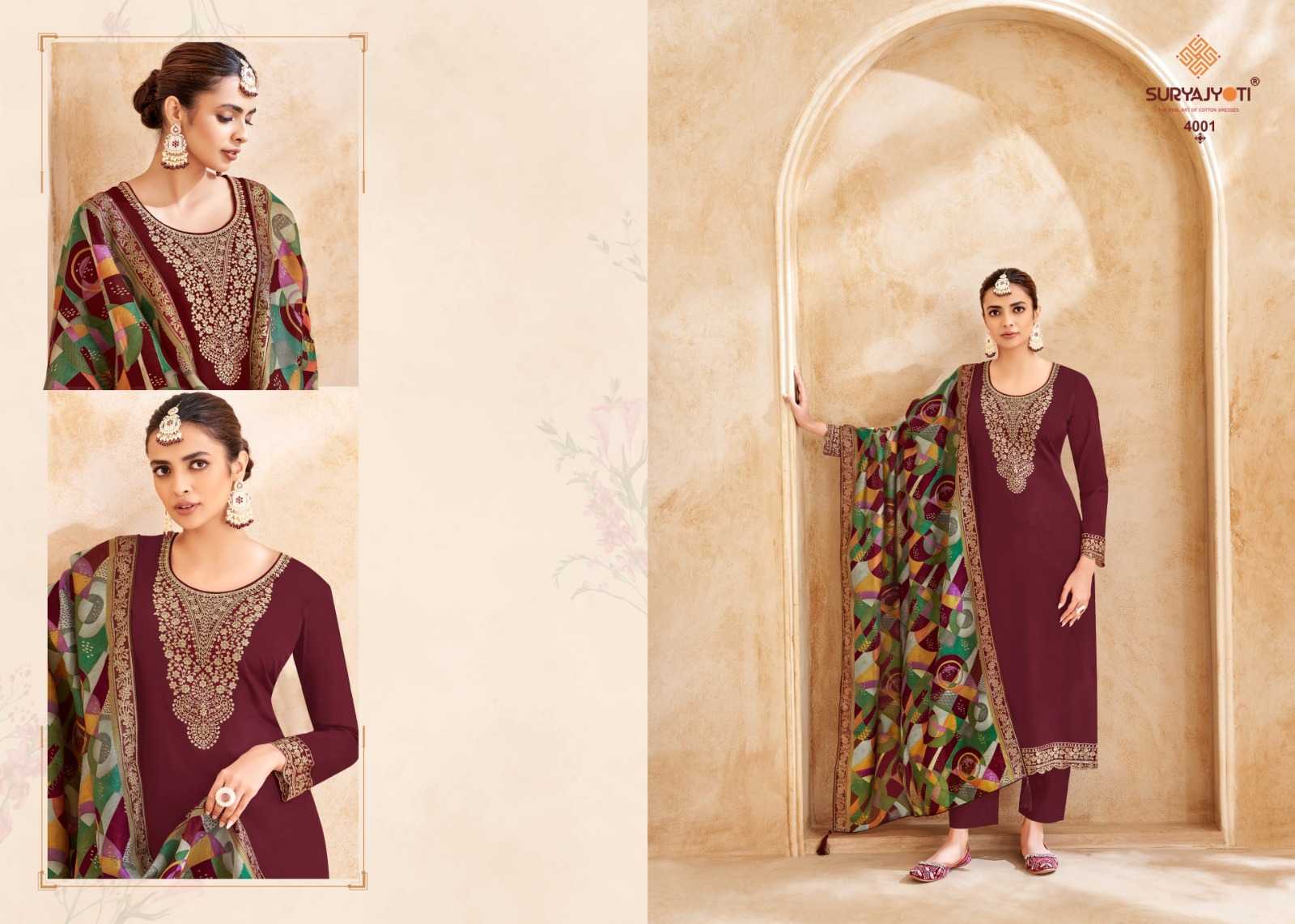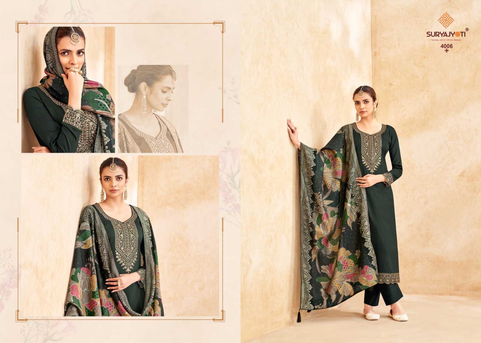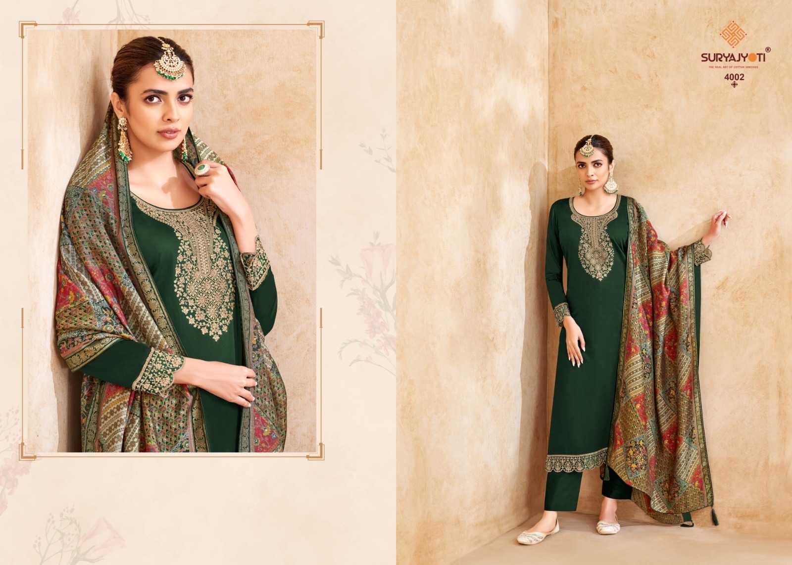 Looking for suryajyoti pashan vol 4 embroidery unique jam satin 3pcs dress Full Catalouge at Best Price? Buy Now suryajyoti pashan vol 4 embroidery unique jam satin 3pcs dress at Wholesale Rate of Rs 3420 with Total 4 Pcs from authroized dealer and supplier of Suryajyoti Cotton Brand. Cost of Each piece is just only Rs 855 which is very low and affordable price to resale the product in your retail store. rrgandhi is Surat based Wholesale Supplier & Dealer of Suryajyoti Cotton Brand. Click on Brand name to Know more about Brand's products.