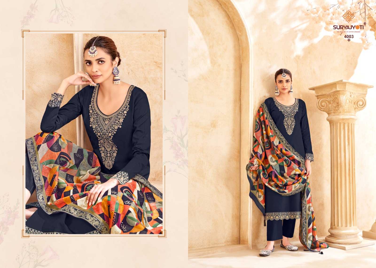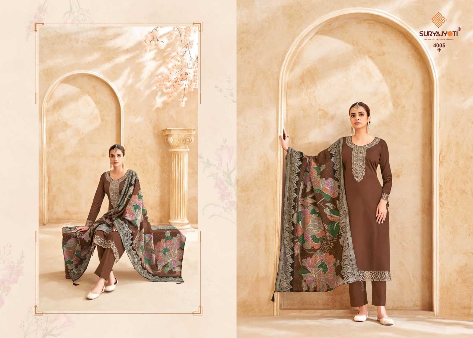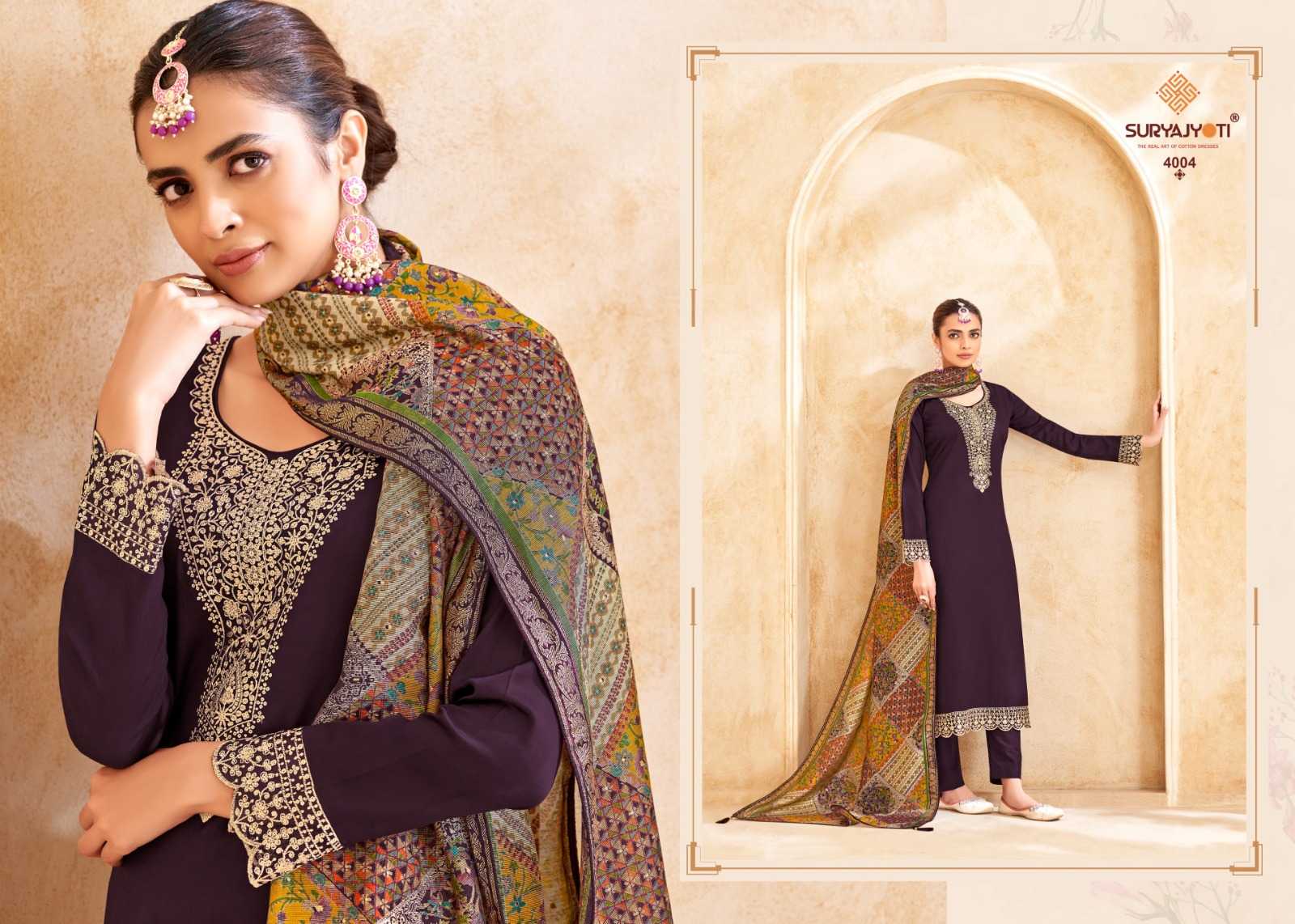 Looking for suryajyoti pashan vol 4 embroidery unique jam satin 3pcs dress Full Catalouge at Best Price? Buy Now suryajyoti pashan vol 4 embroidery unique jam satin 3pcs dress at Wholesale Rate of Rs 3420 with Total 4 Pcs from authroized dealer and supplier of Suryajyoti Cotton Brand. Cost of Each piece is just only Rs 855 which is very low and affordable price to resale the product in your retail store. rrgandhi is Surat based Wholesale Supplier & Dealer of Suryajyoti Cotton Brand. Click on Brand name to Know more about Brand's products.