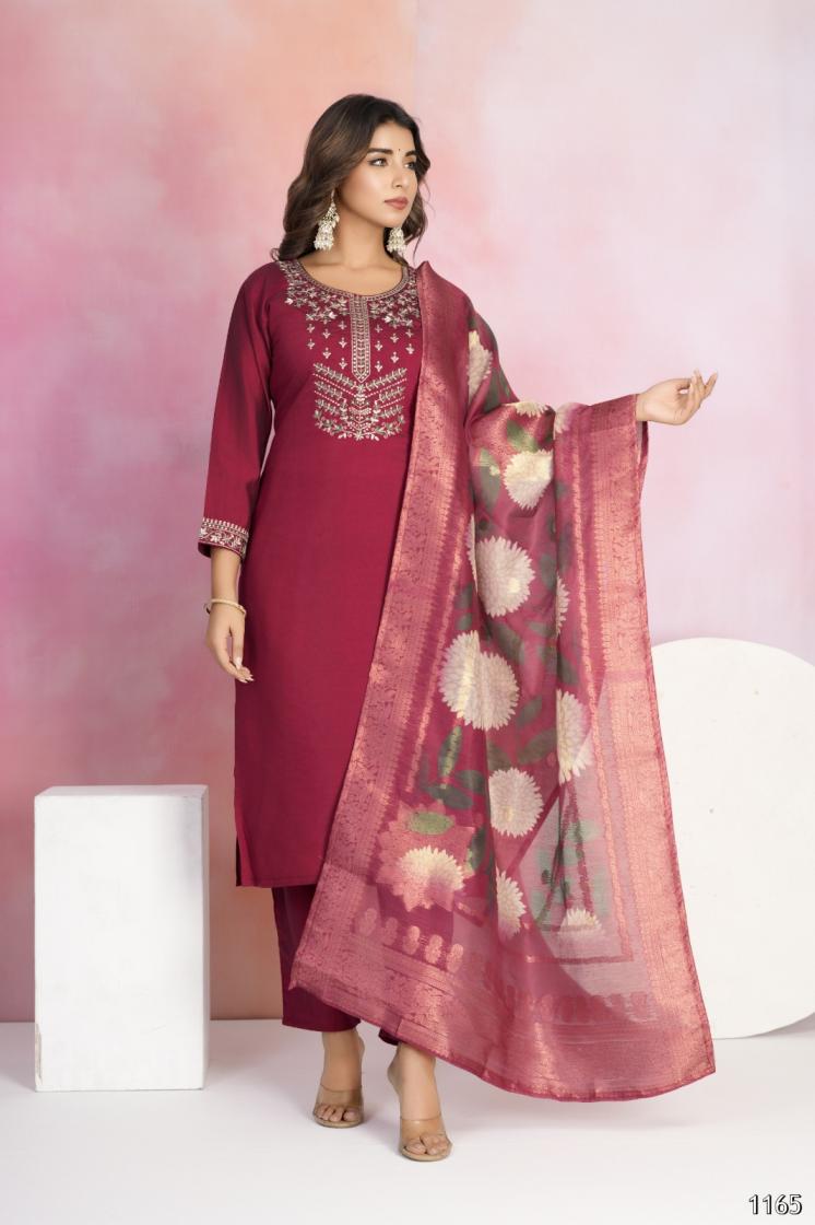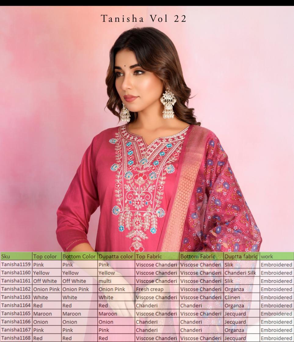 Looking for tanisha vol 22 unique colours viscose chanderi full stitch ladies suit Full Catalouge at Best Price? Buy Now tanisha vol 22 unique colours viscose chanderi full stitch ladies suit at Wholesale Rate of Rs 11300 with Total 10 Pcs from authroized dealer and supplier of Taniksh Brand. Cost of Each piece is just only Rs 1130 which is very low and affordable price to resale the product in your retail store. rrgandhi is Surat based Wholesale Supplier & Dealer of Taniksh Brand. Click on Brand name to Know more about Brand's products.