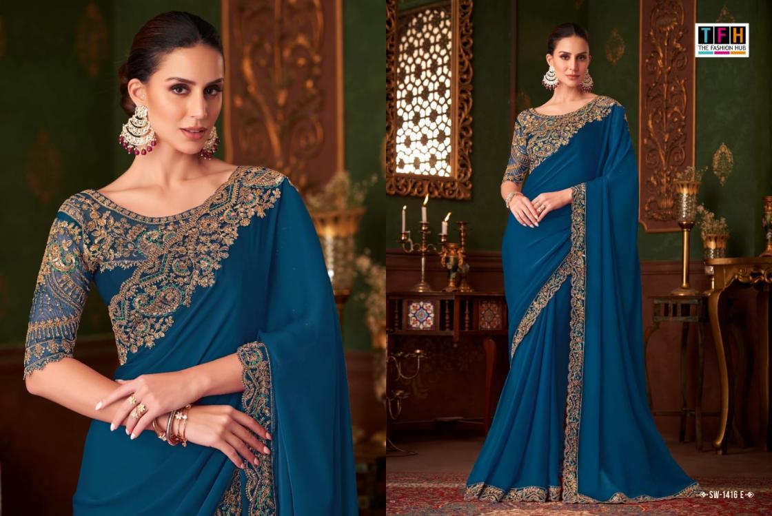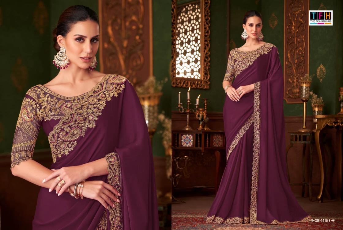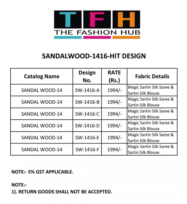 Looking for TFH LAUNCH SANDALWOOD 1416 DESIGNER MAGIC SARTIN SILK BEST SAREES Full Catalouge at Best Price? Buy Now TFH LAUNCH SANDALWOOD 1416 DESIGNER MAGIC SARTIN SILK BEST SAREES at Wholesale Rate of Rs 11964 with Total 6 Pcs from authroized dealer and supplier of TFH Brand. Cost of Each piece is just only Rs 1994 which is very low and affordable price to resale the product in your retail store. rrgandhi is Surat based Wholesale Supplier & Dealer of TFH Brand. Click on Brand name to Know more about Brand's products.
