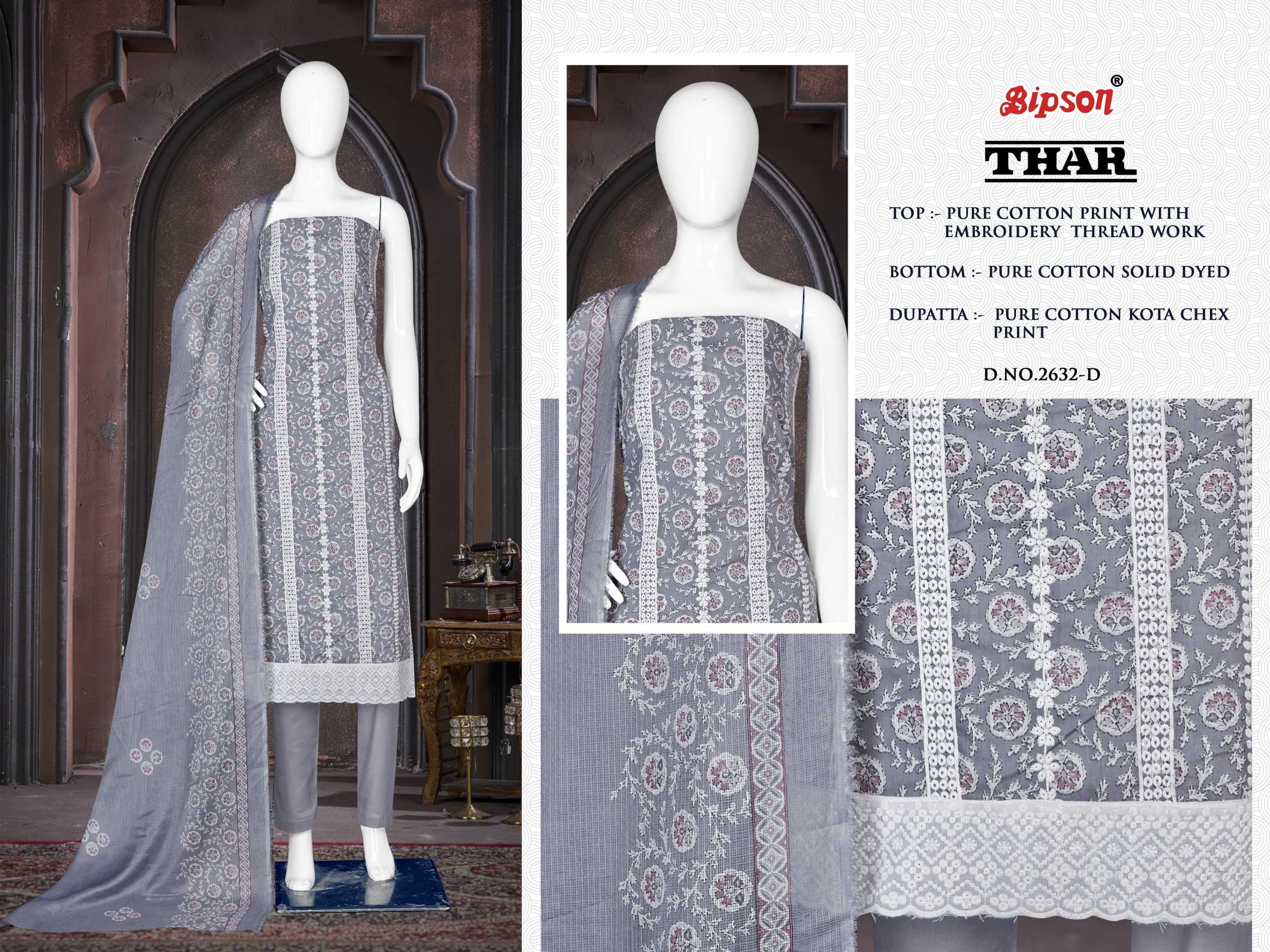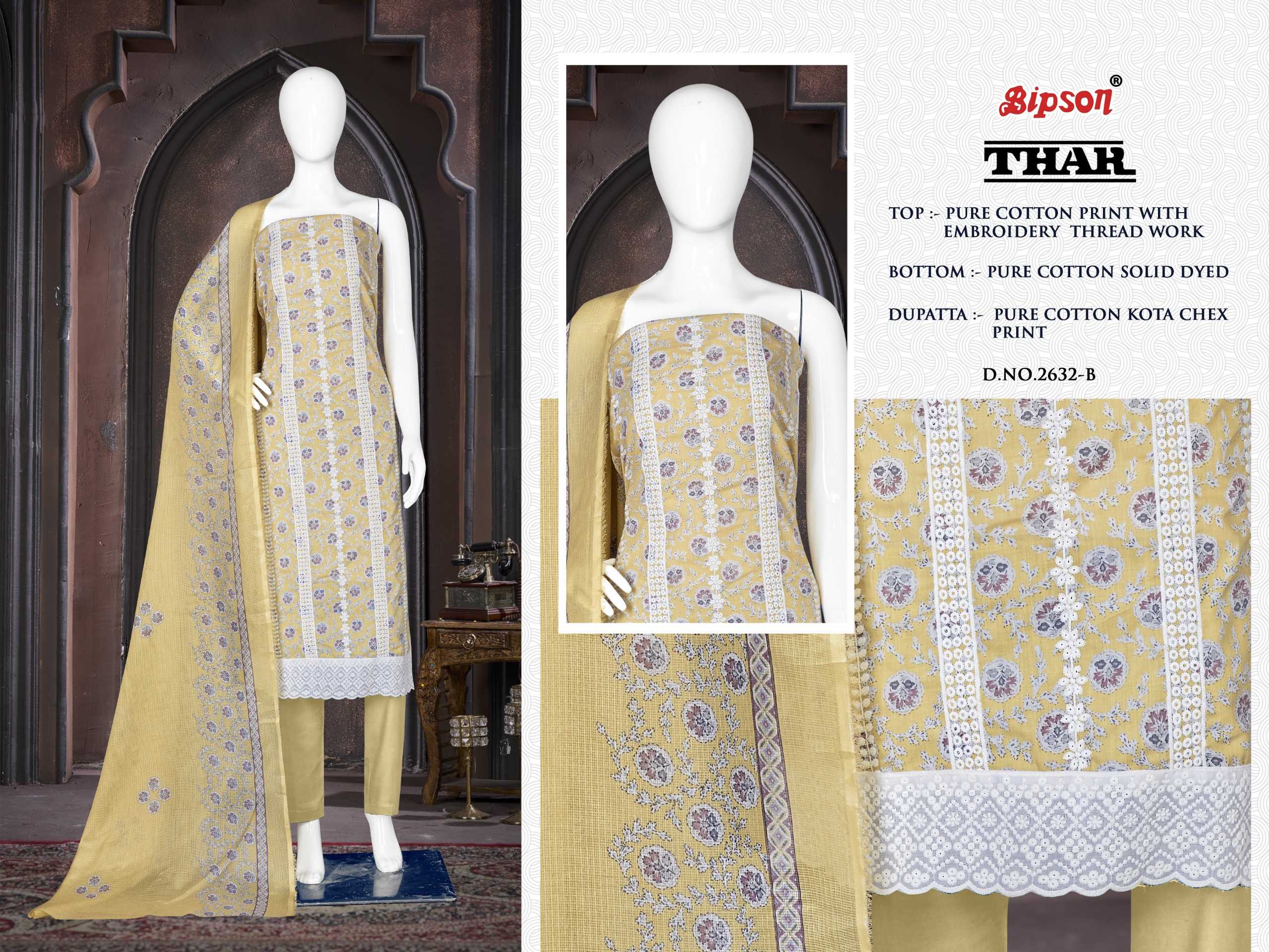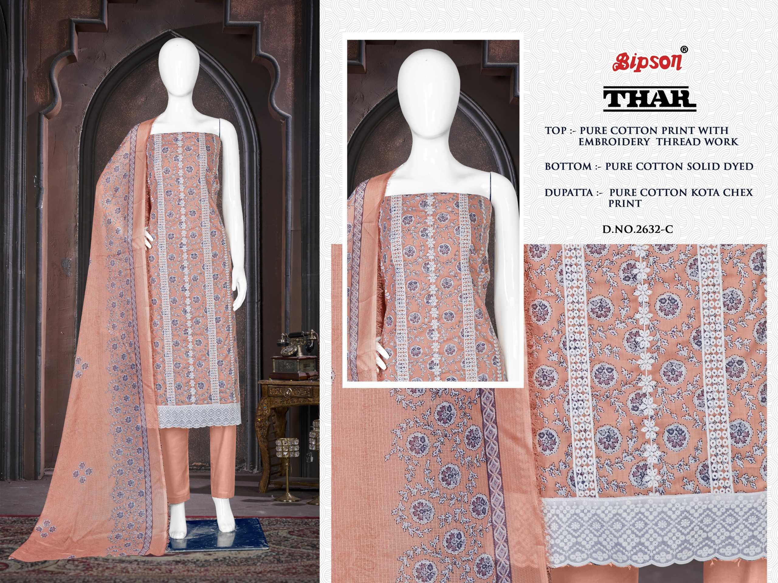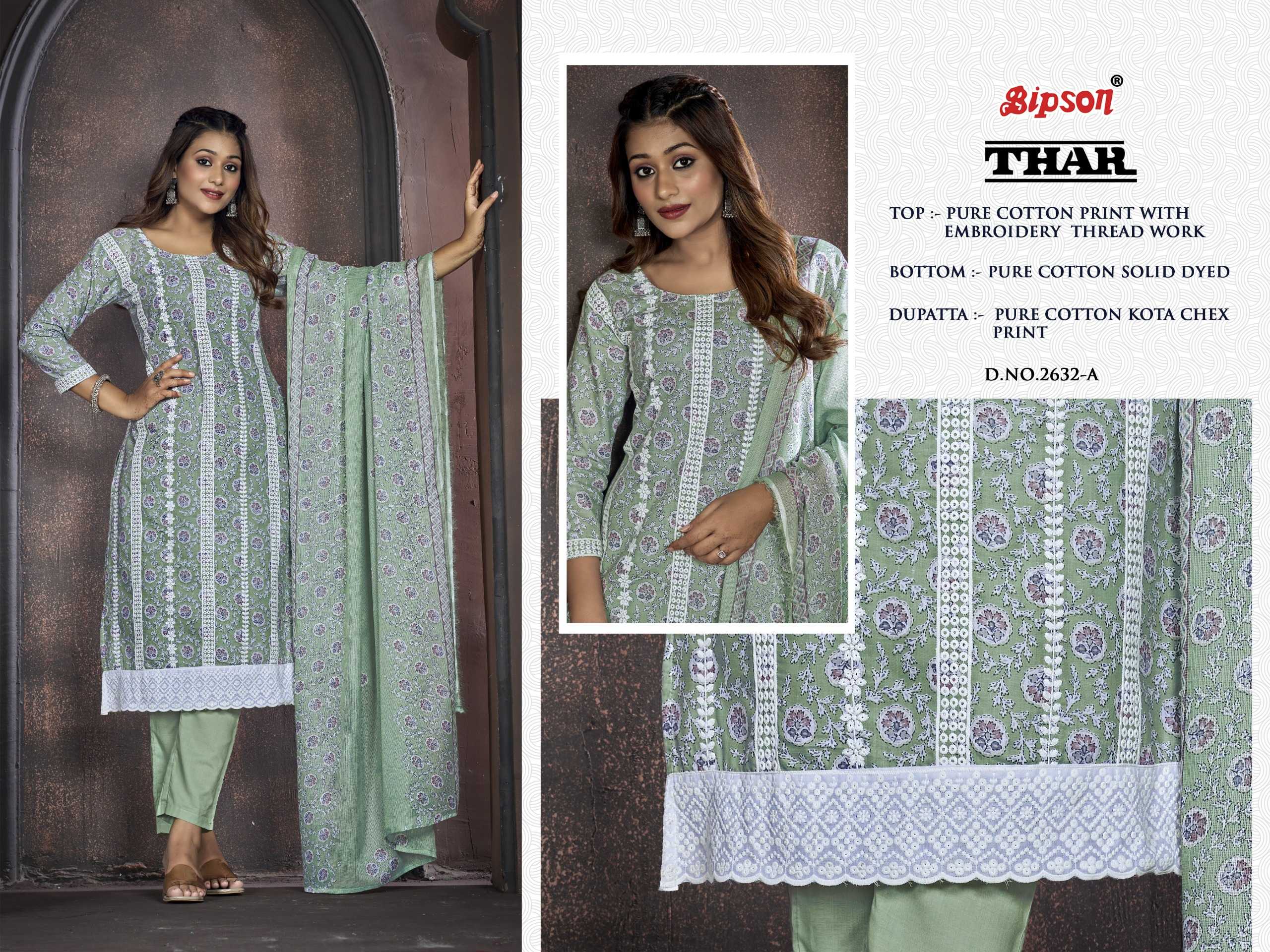 Looking for thar 2632 by bipson prints launch fancy cotton print unstitch salwar kameez Full Catalouge at Best Price? Buy Now thar 2632 by bipson prints launch fancy cotton print unstitch salwar kameez at Wholesale Rate of Rs 2220 with Total 4 Pcs from authroized dealer and supplier of Bipson Fashion Brand. Cost of Each piece is just only Rs 555 which is very low and affordable price to resale the product in your retail store. rrgandhi is Surat based Wholesale Supplier & Dealer of Bipson Fashion Brand. Click on Brand name to Know more about Brand's products.