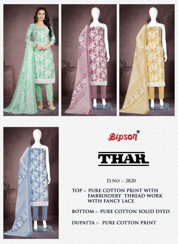 Looking for thar 2820 by bipson prints cotton comfortable unstitch suit online Full Catalouge at Best Price? Buy Now thar 2820 by bipson prints cotton comfortable unstitch suit online at Wholesale Rate of Rs 2140 with Total 4 Pcs from authroized dealer and supplier of Bipson Fashion Brand. Cost of Each piece is just only Rs 535 which is very low and affordable price to resale the product in your retail store. rrgandhi is Surat based Wholesale Supplier & Dealer of Bipson Fashion Brand. Click on Brand name to Know more about Brand's products.