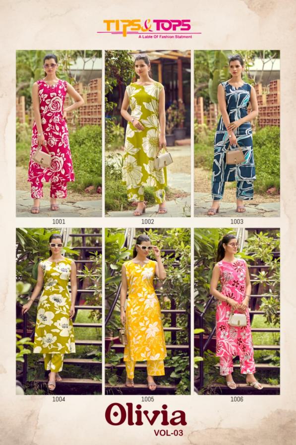 Looking for TIPS & TOPS OLIVIA VOL 3 READYMADE RAYON SHOP TRENDY KURTI WITH PAIR Full Catalouge at Best Price? Buy Now TIPS & TOPS OLIVIA VOL 3 READYMADE RAYON SHOP TRENDY KURTI WITH PAIR at Wholesale Rate of Rs 2790 with Total 6 Pcs from authroized dealer and supplier of Tips and Tops Brand. Cost of Each piece is just only Rs 465 which is very low and affordable price to resale the product in your retail store. rrgandhi is Surat based Wholesale Supplier & Dealer of Tips and Tops Brand. Click on Brand name to Know more about Brand's products.