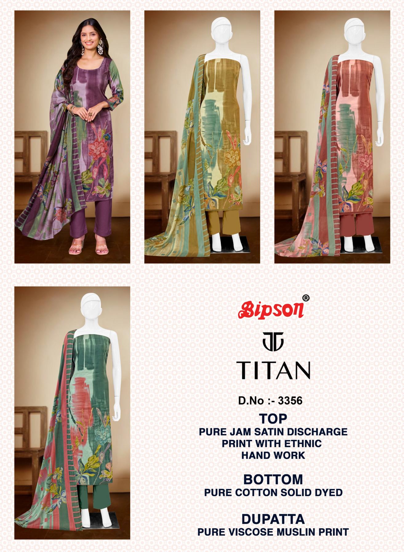 Looking for TITAN 3356 BY BIPSON PRINTS JAM SATIN UNSTITCH SUITS ONLINE Full Catalouge at Best Price? Buy Now TITAN 3356 BY BIPSON PRINTS JAM SATIN UNSTITCH SUITS ONLINE at Wholesale Rate of Rs 3244 with Total 4 Pcs from authroized dealer and supplier of Bipson Fashion Brand. Cost of Each piece is just only Rs 811 which is very low and affordable price to resale the product in your retail store. rrgandhi is Surat based Wholesale Supplier & Dealer of Bipson Fashion Brand. Click on Brand name to Know more about Brand's products.