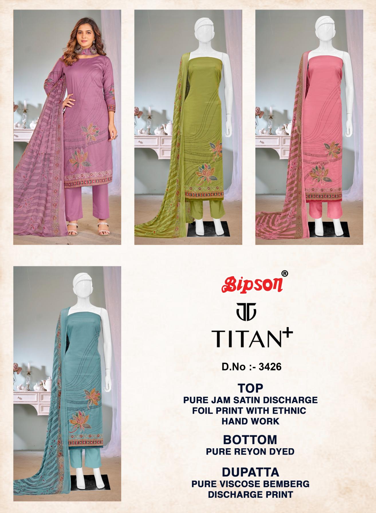 Looking for TITAN 3426 BY BIPSON PRINTS JAM SATIN PRETTY SALWAR KAMEEZ Full Catalouge at Best Price? Buy Now TITAN 3426 BY BIPSON PRINTS JAM SATIN PRETTY SALWAR KAMEEZ at Wholesale Rate of Rs 3244 with Total 4 Pcs from authroized dealer and supplier of Bipson Fashion Brand. Cost of Each piece is just only Rs 811 which is very low and affordable price to resale the product in your retail store. rrgandhi is Surat based Wholesale Supplier & Dealer of Bipson Fashion Brand. Click on Brand name to Know more about Brand's products.