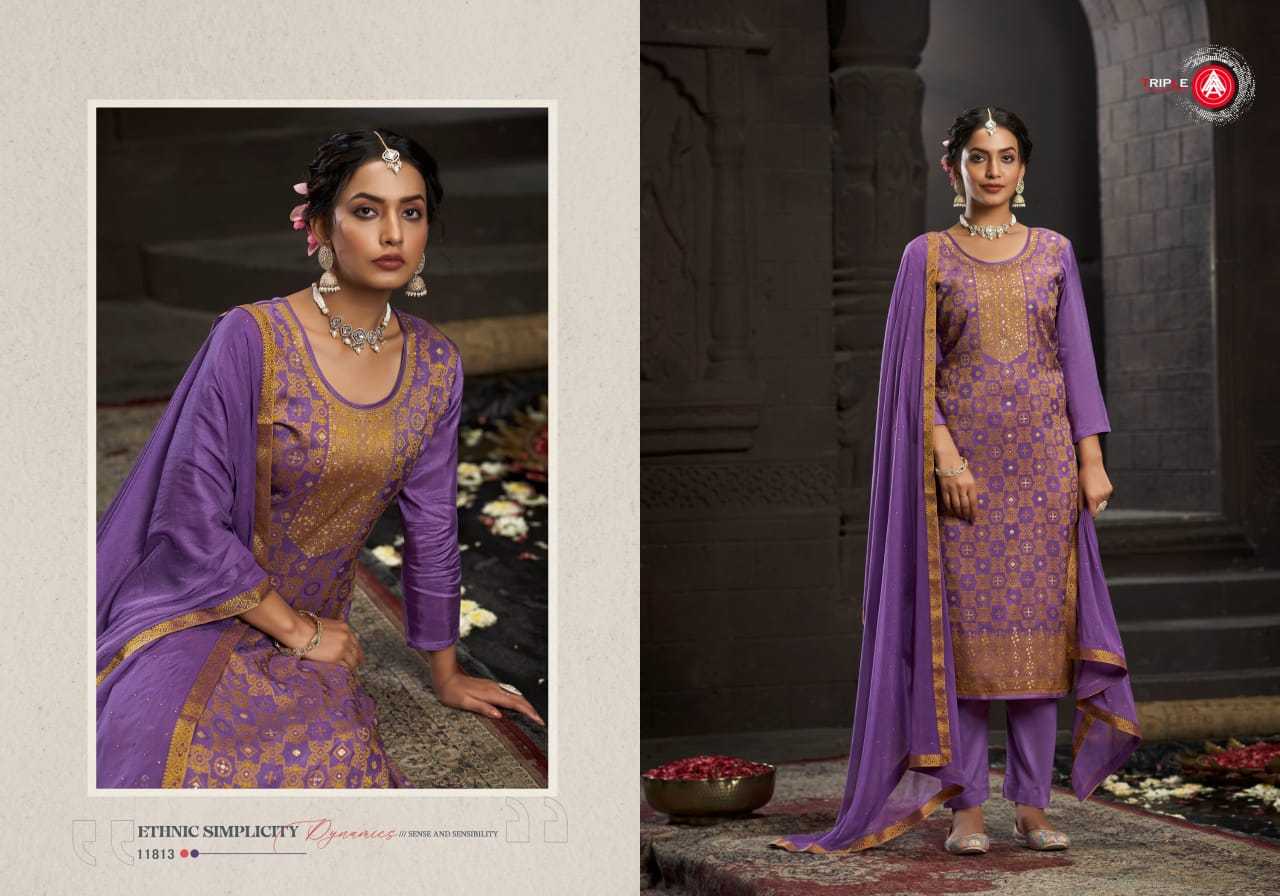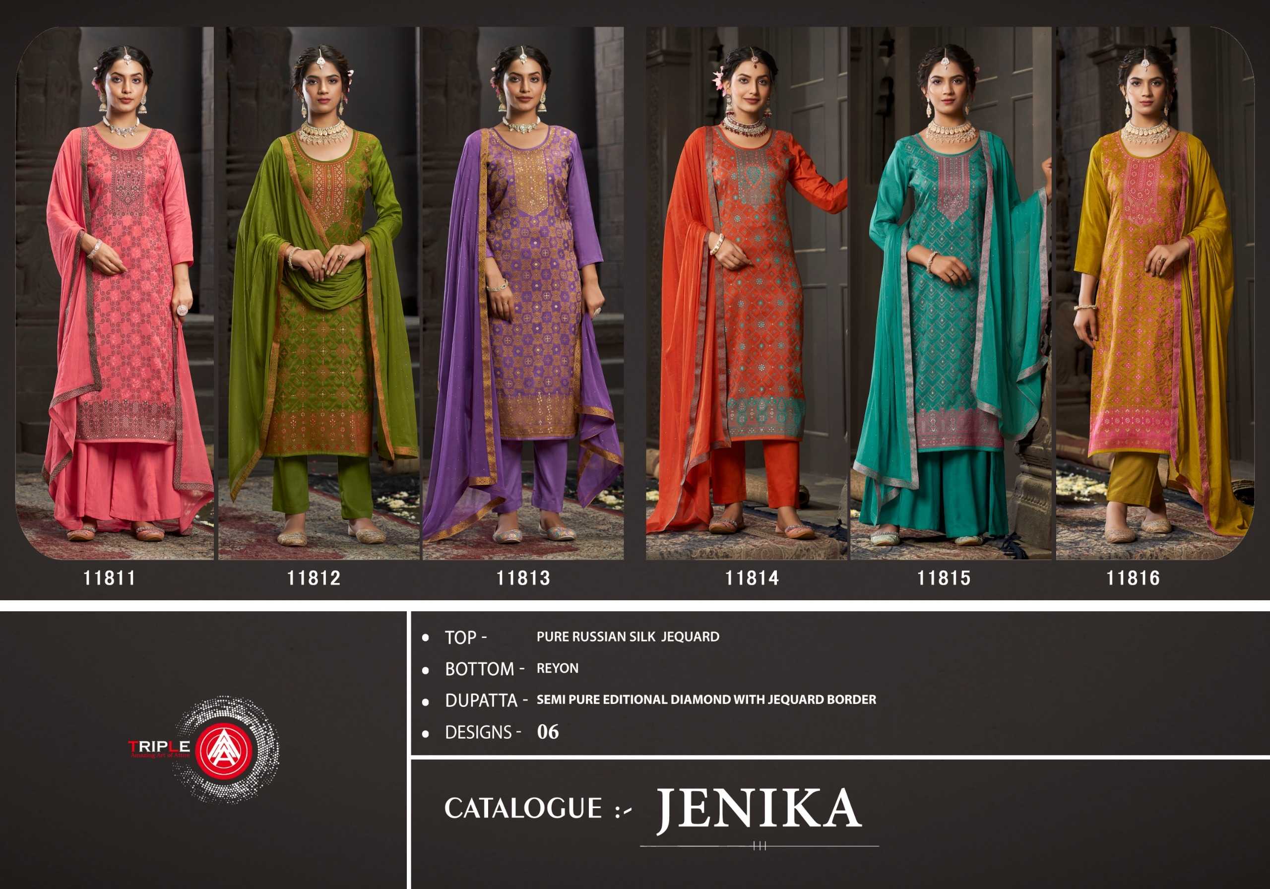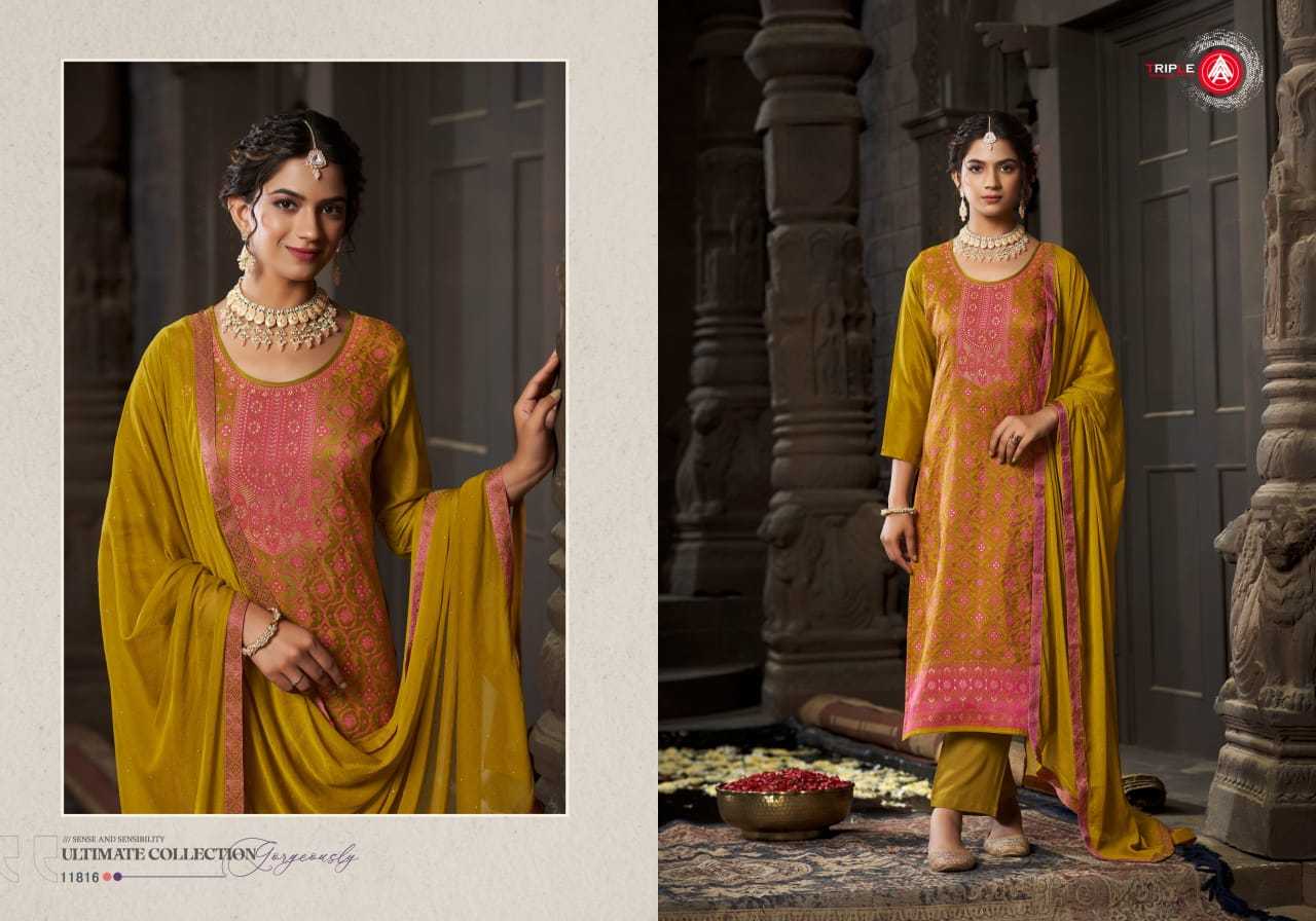 Looking for triple a jenika russian silk traditional wear unstitch 3pcs dress Full Catalouge at Best Price? Buy Now triple a jenika russian silk traditional wear unstitch 3pcs dress at Wholesale Rate of Rs 5094 with Total 6 Pcs from authroized dealer and supplier of Triple A Brand. Cost of Each piece is just only Rs 849 which is very low and affordable price to resale the product in your retail store. rrgandhi is Surat based Wholesale Supplier & Dealer of Triple A Brand. Click on Brand name to Know more about Brand's products.