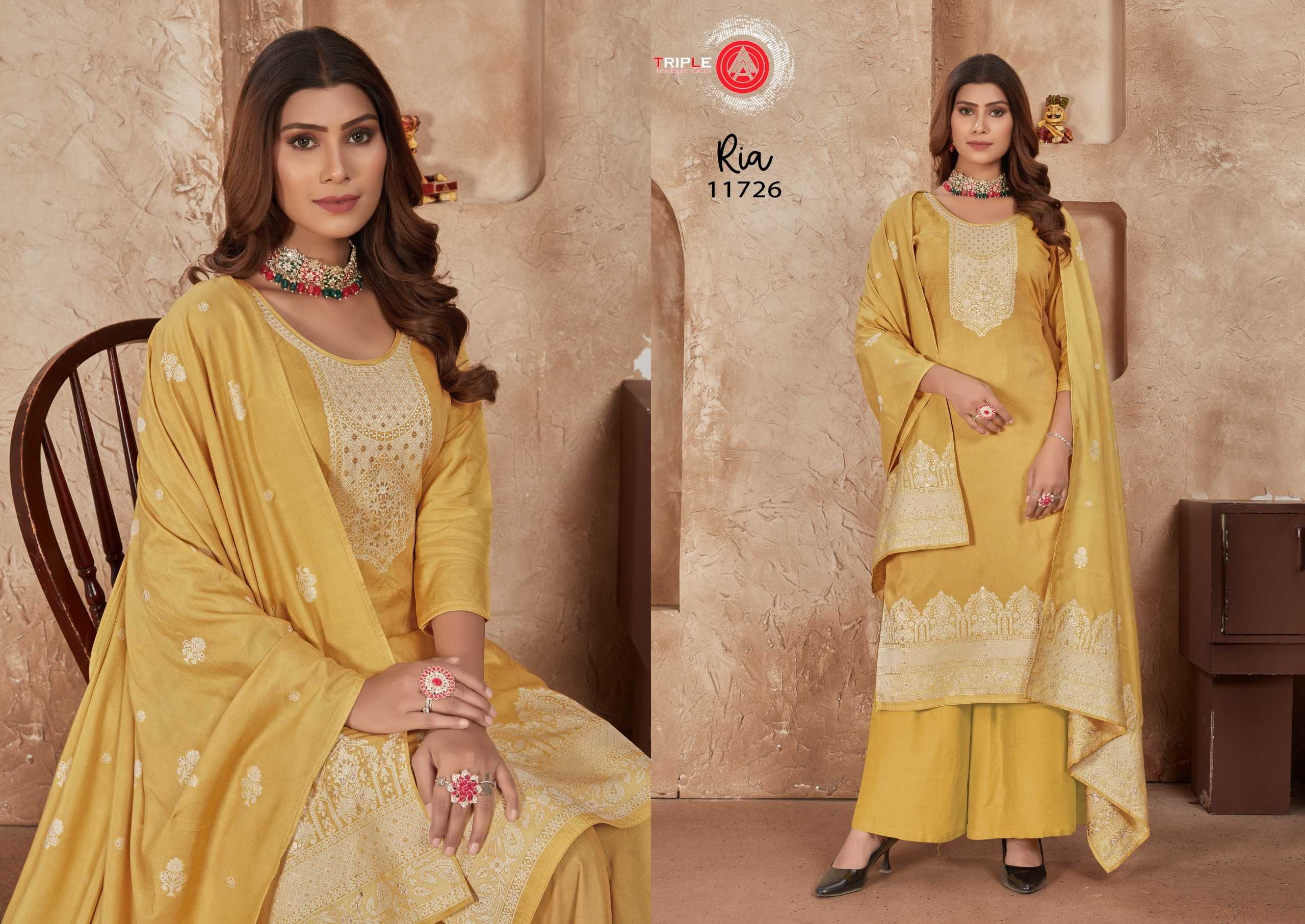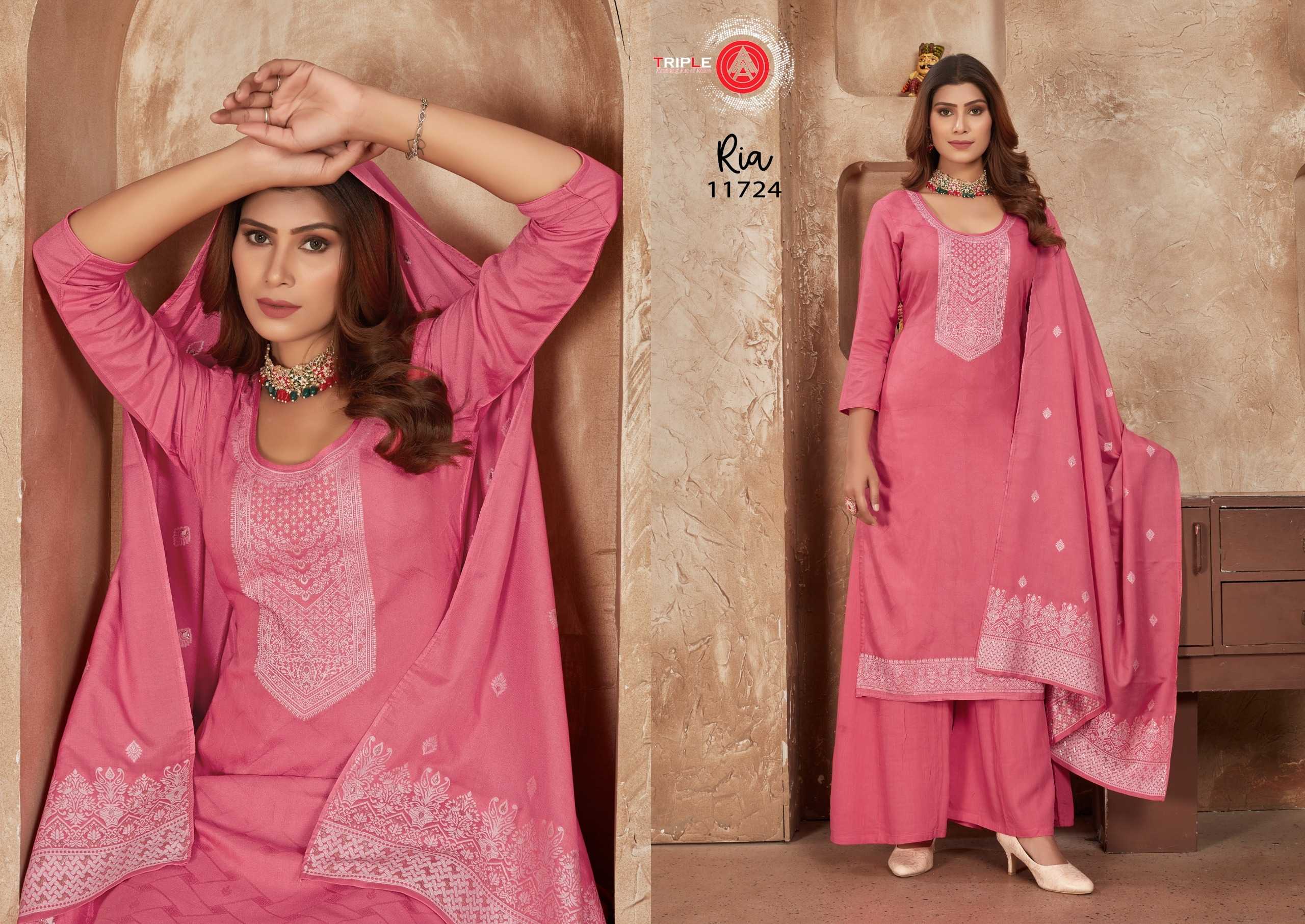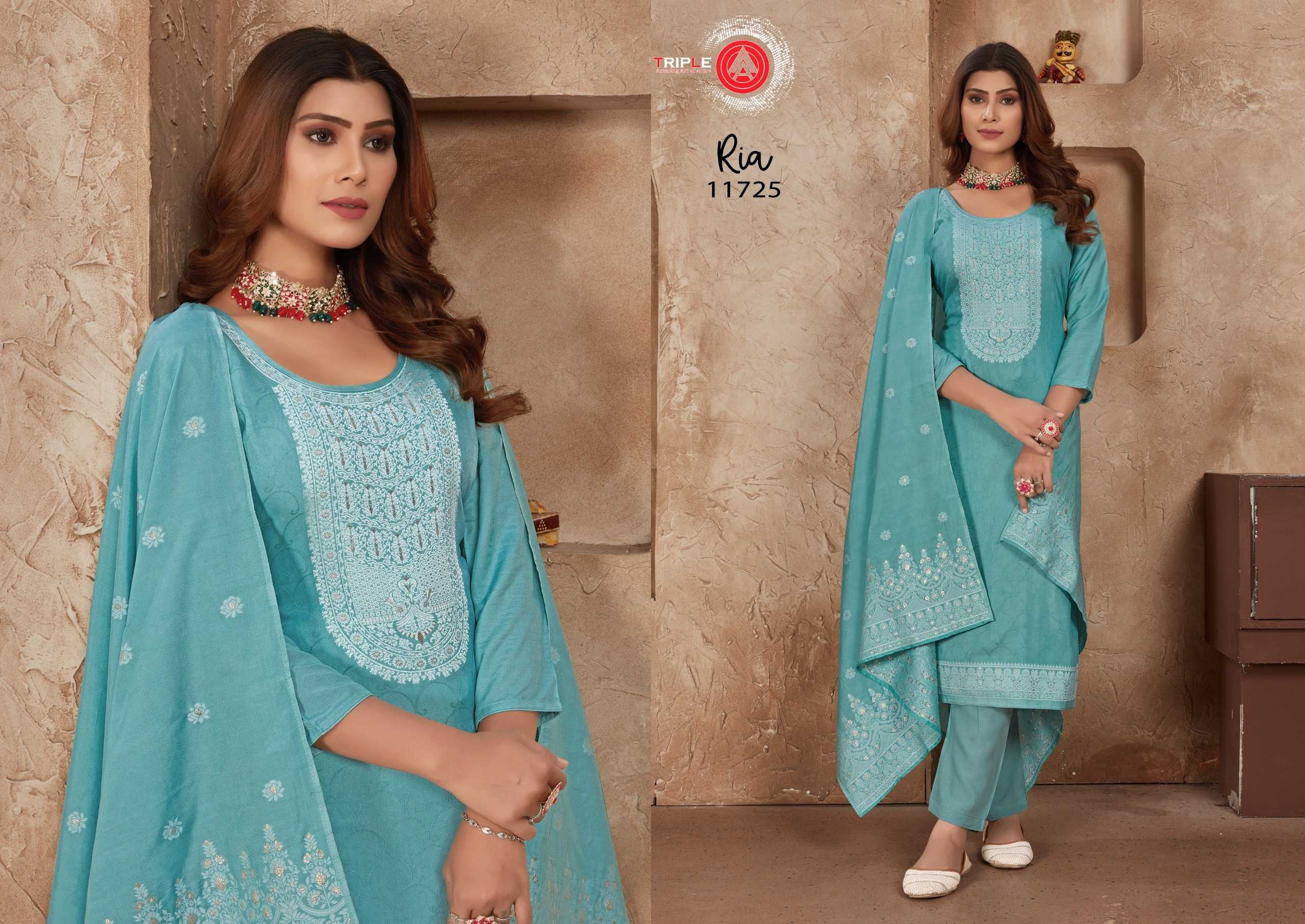 Looking for triple a presents ria fancy muslin lakhnavi jacquard traditional wear salwar suit dress material Full Catalouge at Best Price? Buy Now triple a presents ria fancy muslin lakhnavi jacquard traditional wear salwar suit dress material at Wholesale Rate of Rs 4194 with Total 6 Pcs from authroized dealer and supplier of Triple A Brand. Cost of Each piece is just only Rs 699 which is very low and affordable price to resale the product in your retail store. rrgandhi is Surat based Wholesale Supplier & Dealer of Triple A Brand. Click on Brand name to Know more about Brand's products.