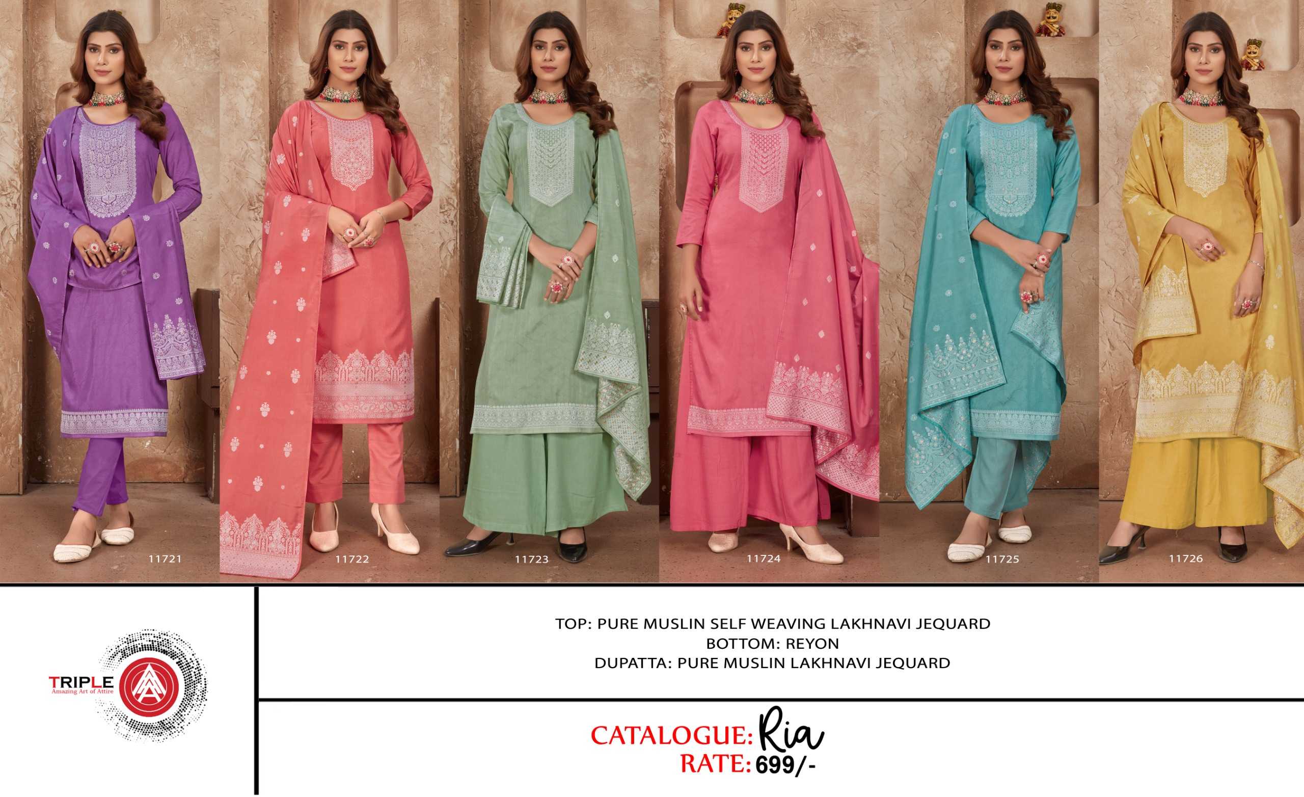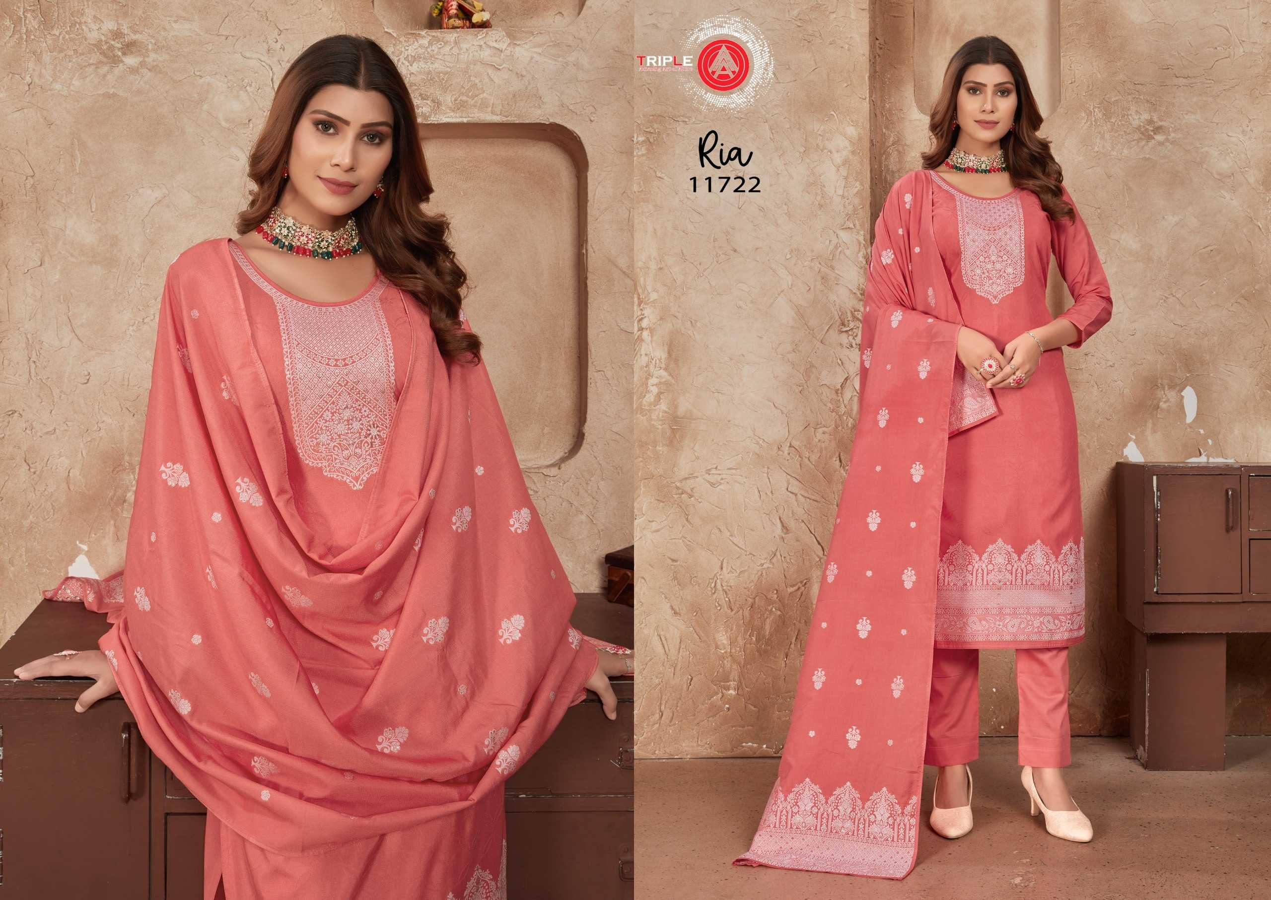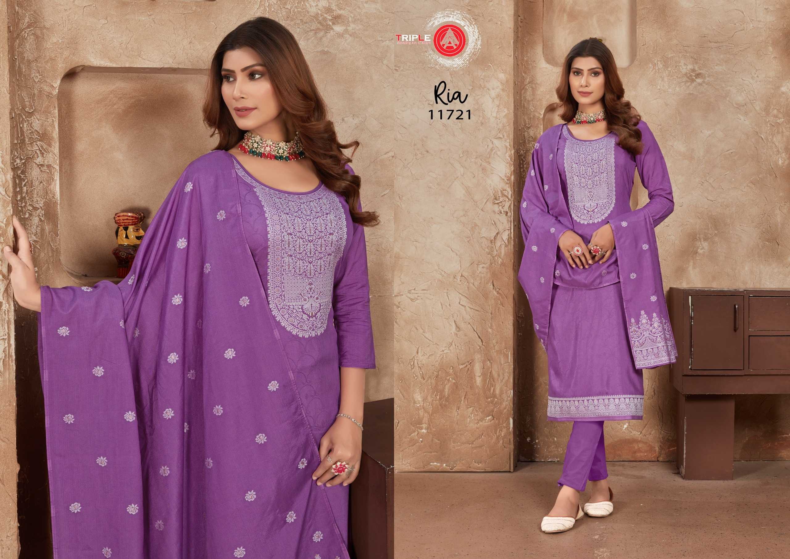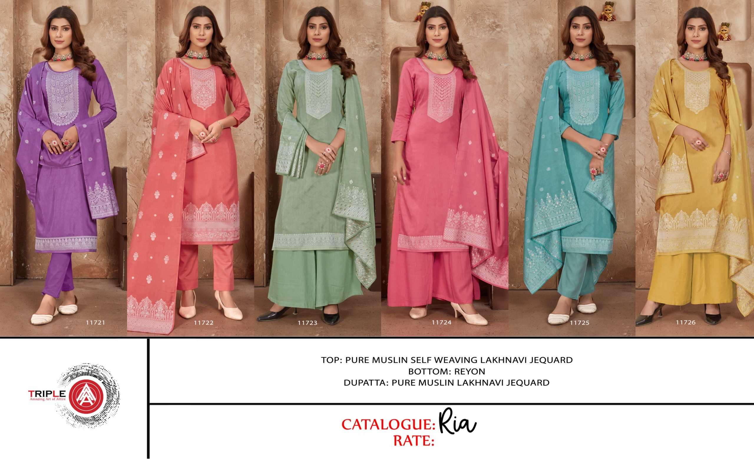 Looking for triple a presents ria fancy muslin lakhnavi jacquard traditional wear salwar suit dress material Full Catalouge at Best Price? Buy Now triple a presents ria fancy muslin lakhnavi jacquard traditional wear salwar suit dress material at Wholesale Rate of Rs 4194 with Total 6 Pcs from authroized dealer and supplier of Triple A Brand. Cost of Each piece is just only Rs 699 which is very low and affordable price to resale the product in your retail store. rrgandhi is Surat based Wholesale Supplier & Dealer of Triple A Brand. Click on Brand name to Know more about Brand's products.
