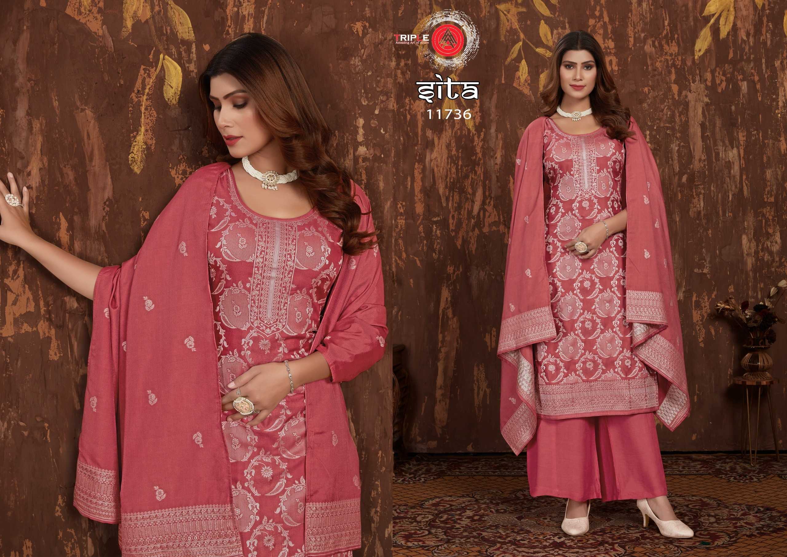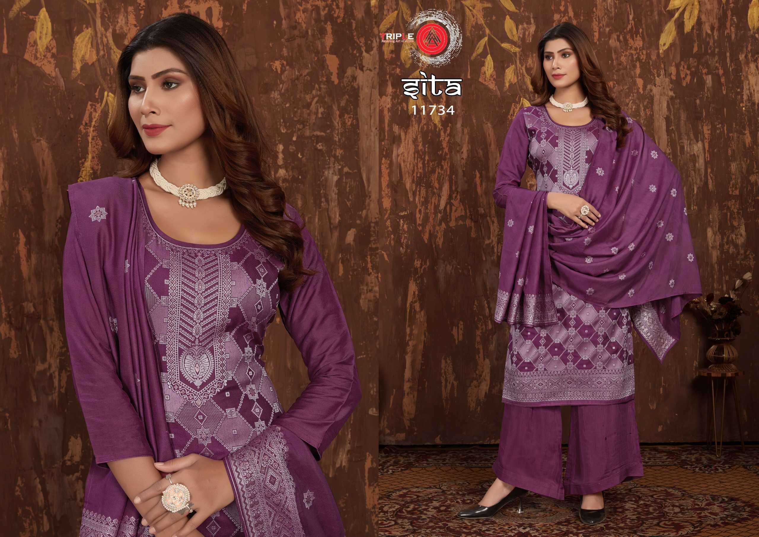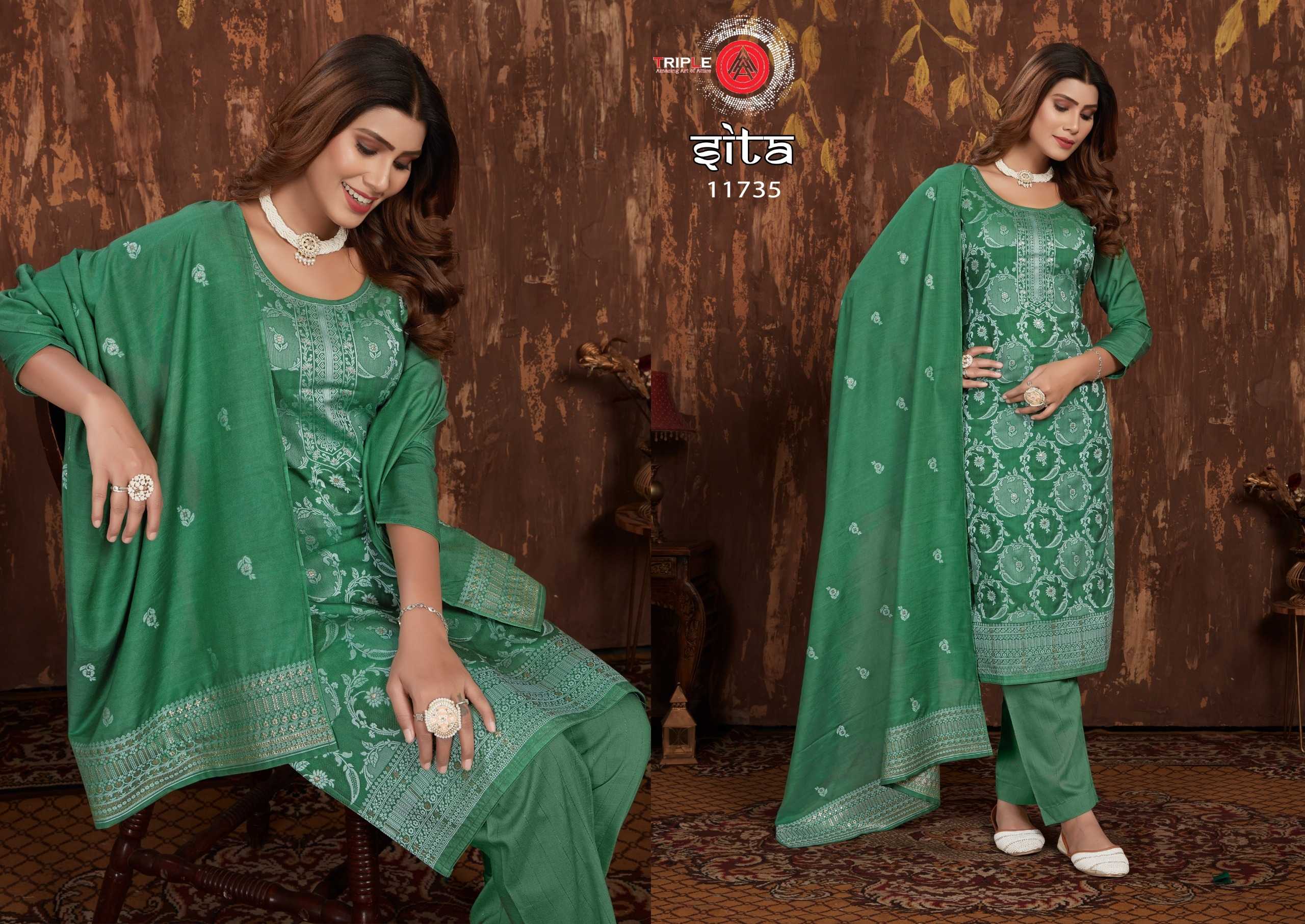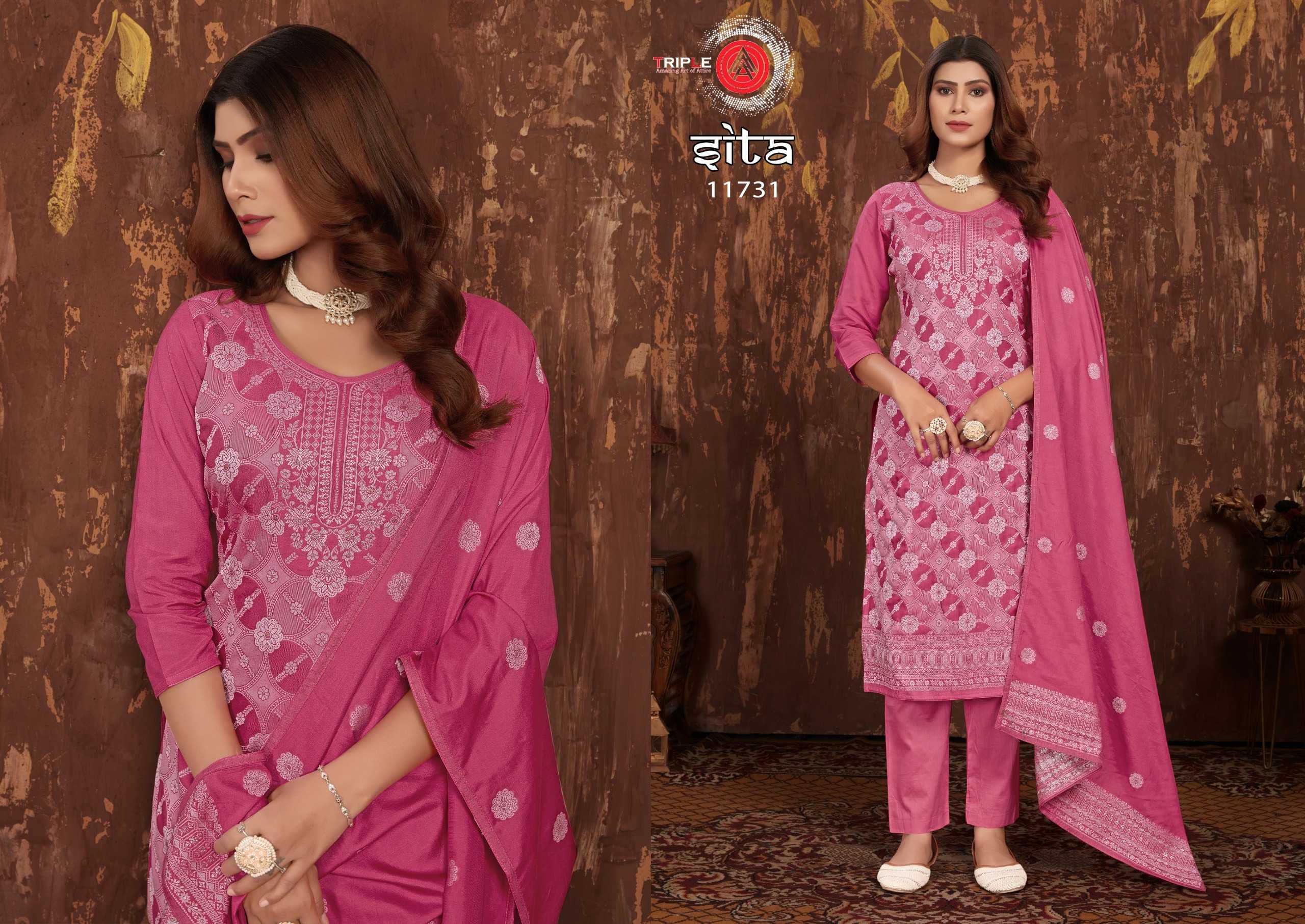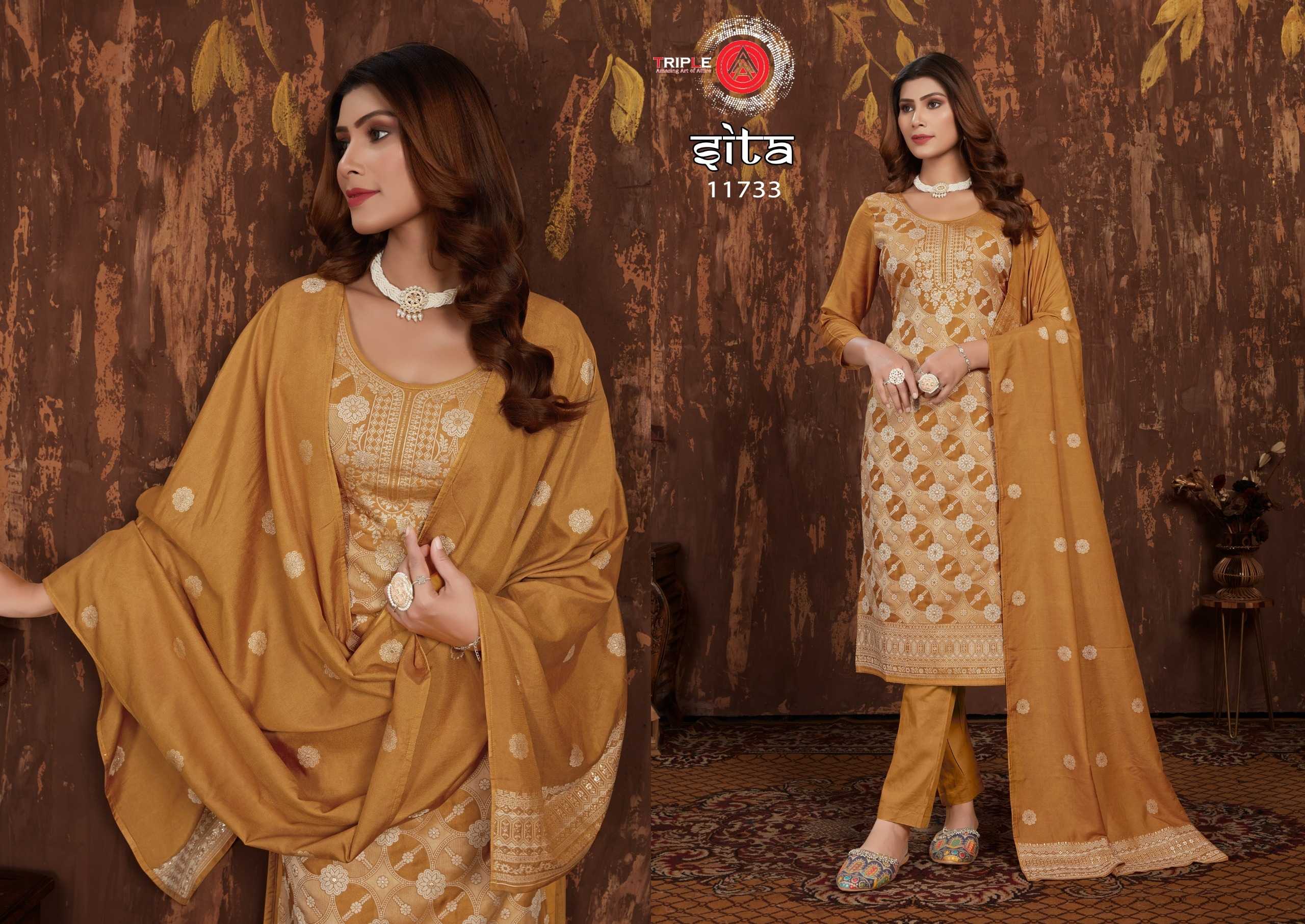 Looking for triple a sita trendy design muslin lakhnavi jacquard salwar kameez traditional collection Full Catalouge at Best Price? Buy Now triple a sita trendy design muslin lakhnavi jacquard salwar kameez traditional collection at Wholesale Rate of Rs 4194 with Total 6 Pcs from authroized dealer and supplier of Triple A Brand. Cost of Each piece is just only Rs 699 which is very low and affordable price to resale the product in your retail store. rrgandhi is Surat based Wholesale Supplier & Dealer of Triple A Brand. Click on Brand name to Know more about Brand's products.