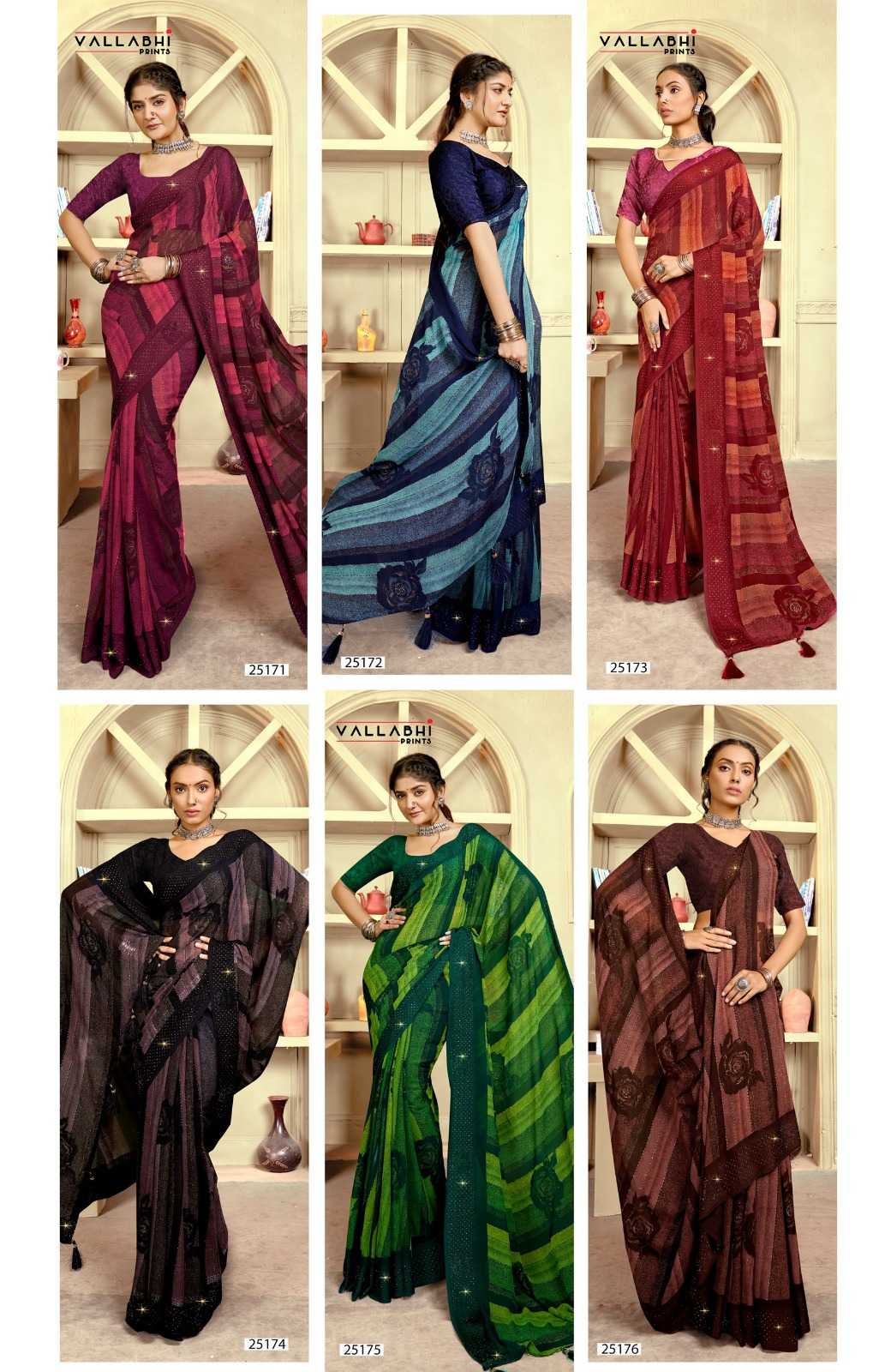 Looking for vallabhi prints jasleen vol 3 festive wear georgette saree Full Catalouge at Best Price? Buy Now vallabhi prints jasleen vol 3 festive wear georgette saree at Wholesale Rate of Rs 6270 with Total 6 Pcs from authroized dealer and supplier of Vallabhi Prints Brand. Cost of Each piece is just only Rs 1045 which is very low and affordable price to resale the product in your retail store. rrgandhi is Surat based Wholesale Supplier & Dealer of Vallabhi Prints Brand. Click on Brand name to Know more about Brand's products.
