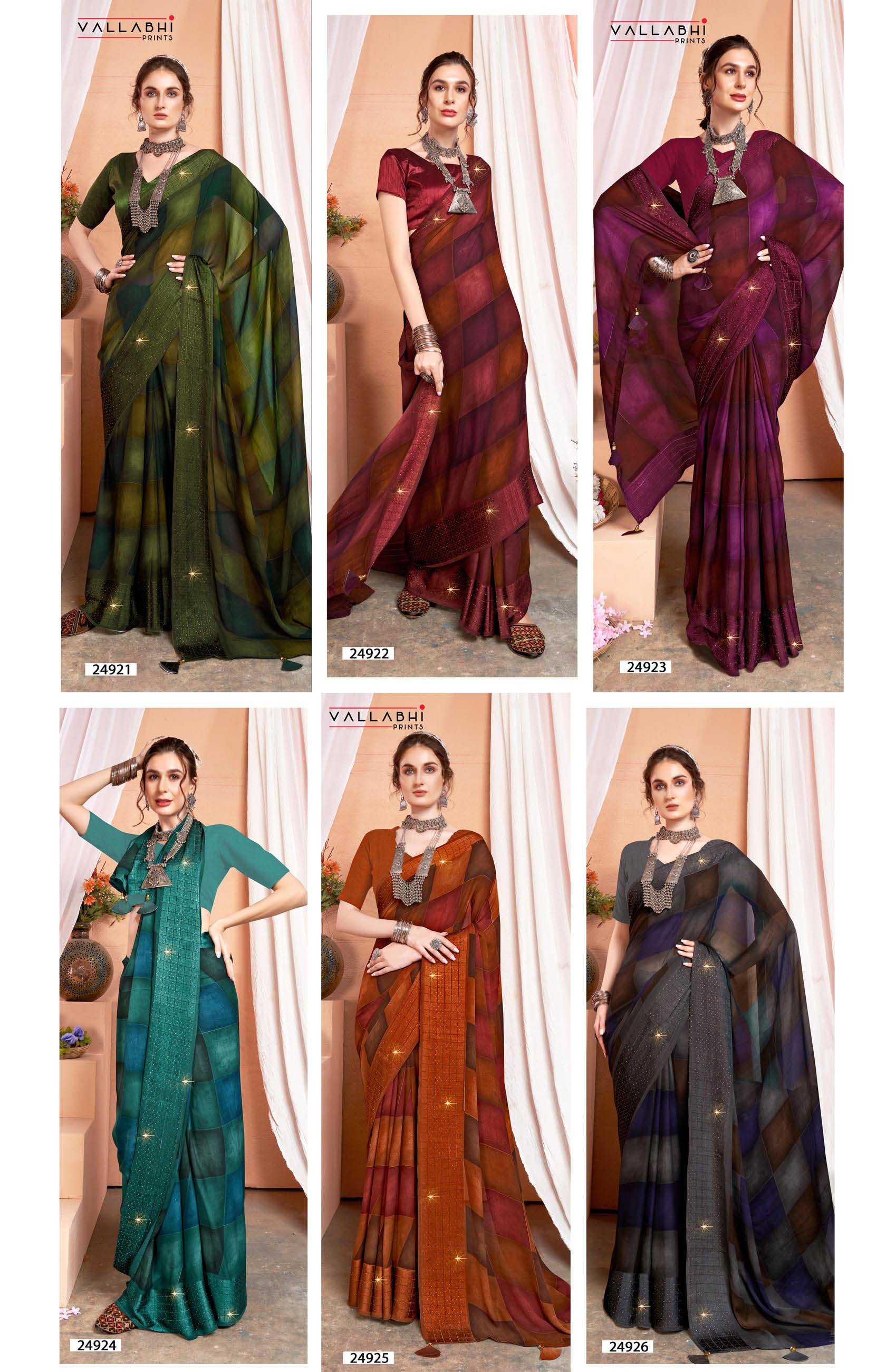 Looking for vallabhi prints patang vol 6 fancy classy look georgette saree wholesaler Full Catalouge at Best Price? Buy Now vallabhi prints patang vol 6 fancy classy look georgette saree wholesaler at Wholesale Rate of Rs 5280 with Total 6 Pcs from authroized dealer and supplier of Vallabhi Prints Brand. Cost of Each piece is just only Rs 880 which is very low and affordable price to resale the product in your retail store. rrgandhi is Surat based Wholesale Supplier & Dealer of Vallabhi Prints Brand. Click on Brand name to Know more about Brand's products.