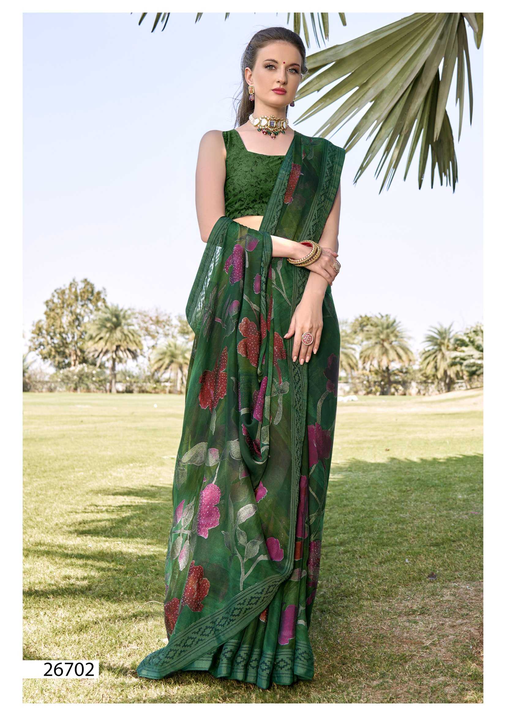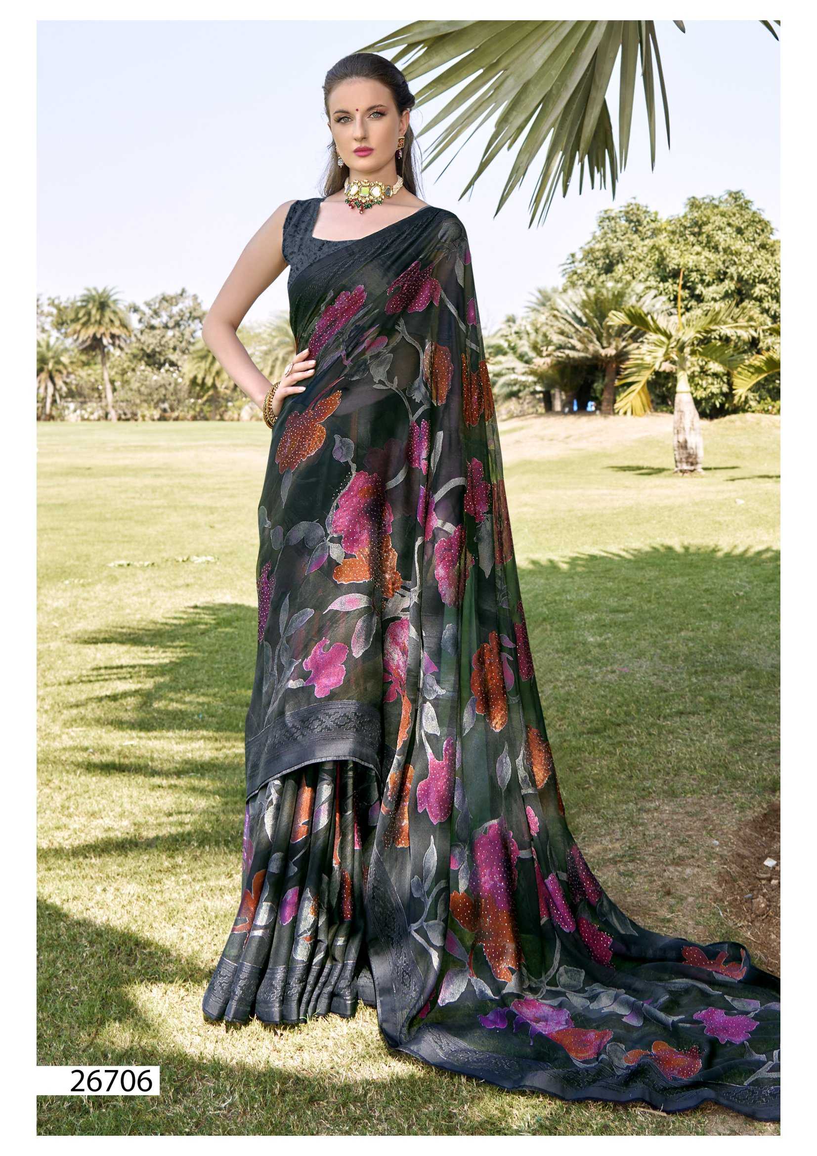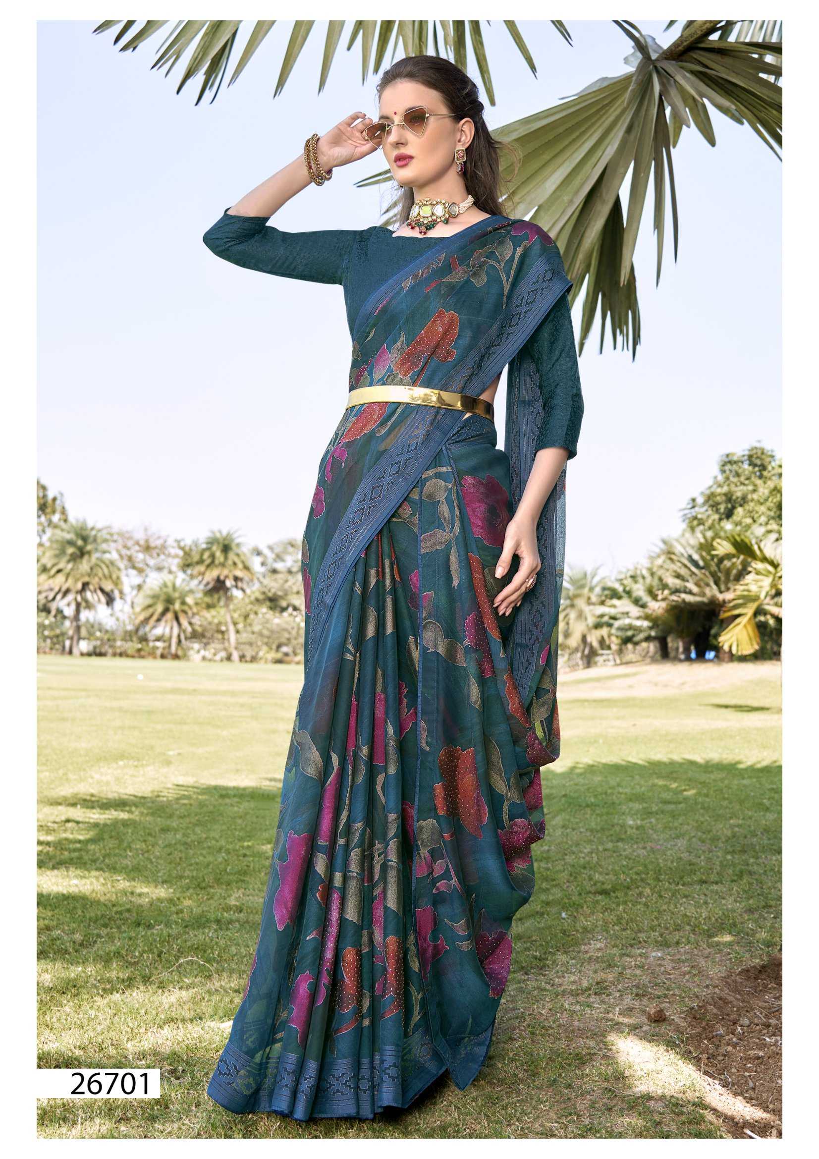 Looking for vallabhi prints rupal 26701-26706 series party wear brasso saree exports Full Catalouge at Best Price? Buy Now vallabhi prints rupal 26701-26706 series party wear brasso saree exports at Wholesale Rate of Rs 7602 with Total 6 Pcs from authroized dealer and supplier of Vallabhi Prints Brand. Cost of Each piece is just only Rs 1267 which is very low and affordable price to resale the product in your retail store. rrgandhi is Surat based Wholesale Supplier & Dealer of Vallabhi Prints Brand. Click on Brand name to Know more about Brand's products.
