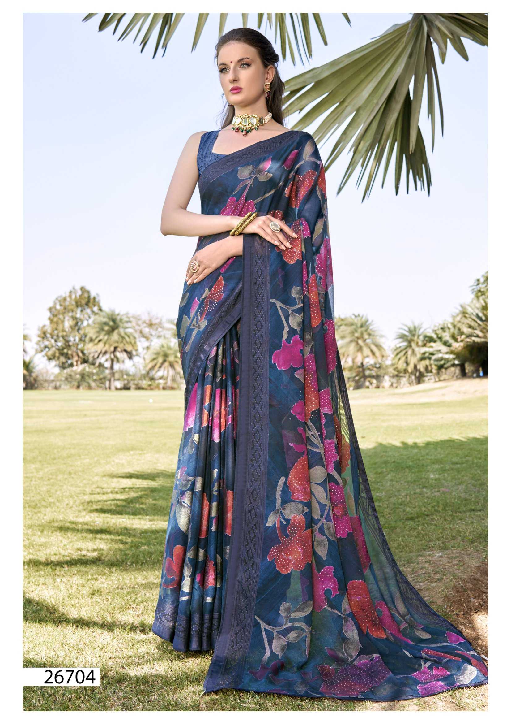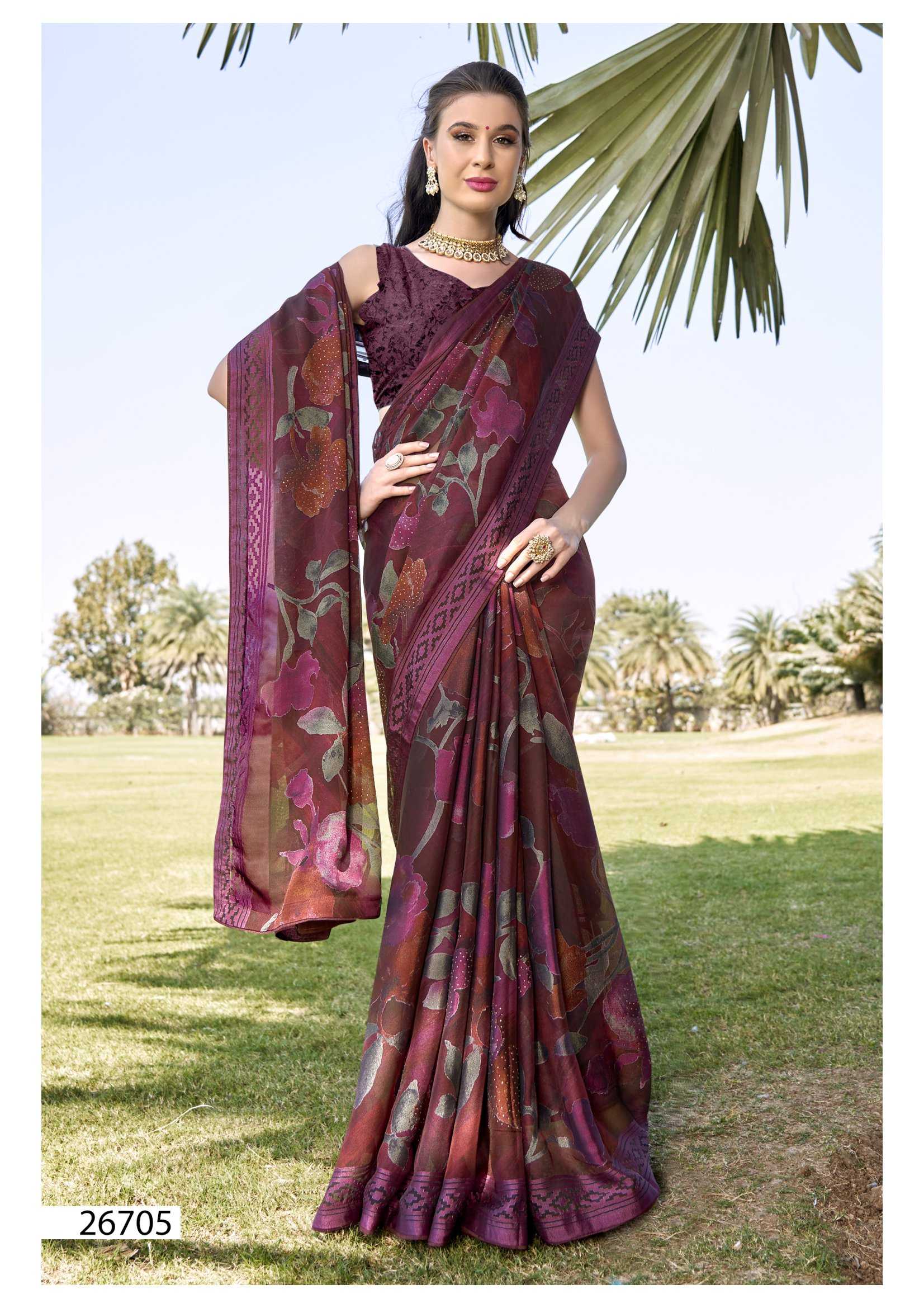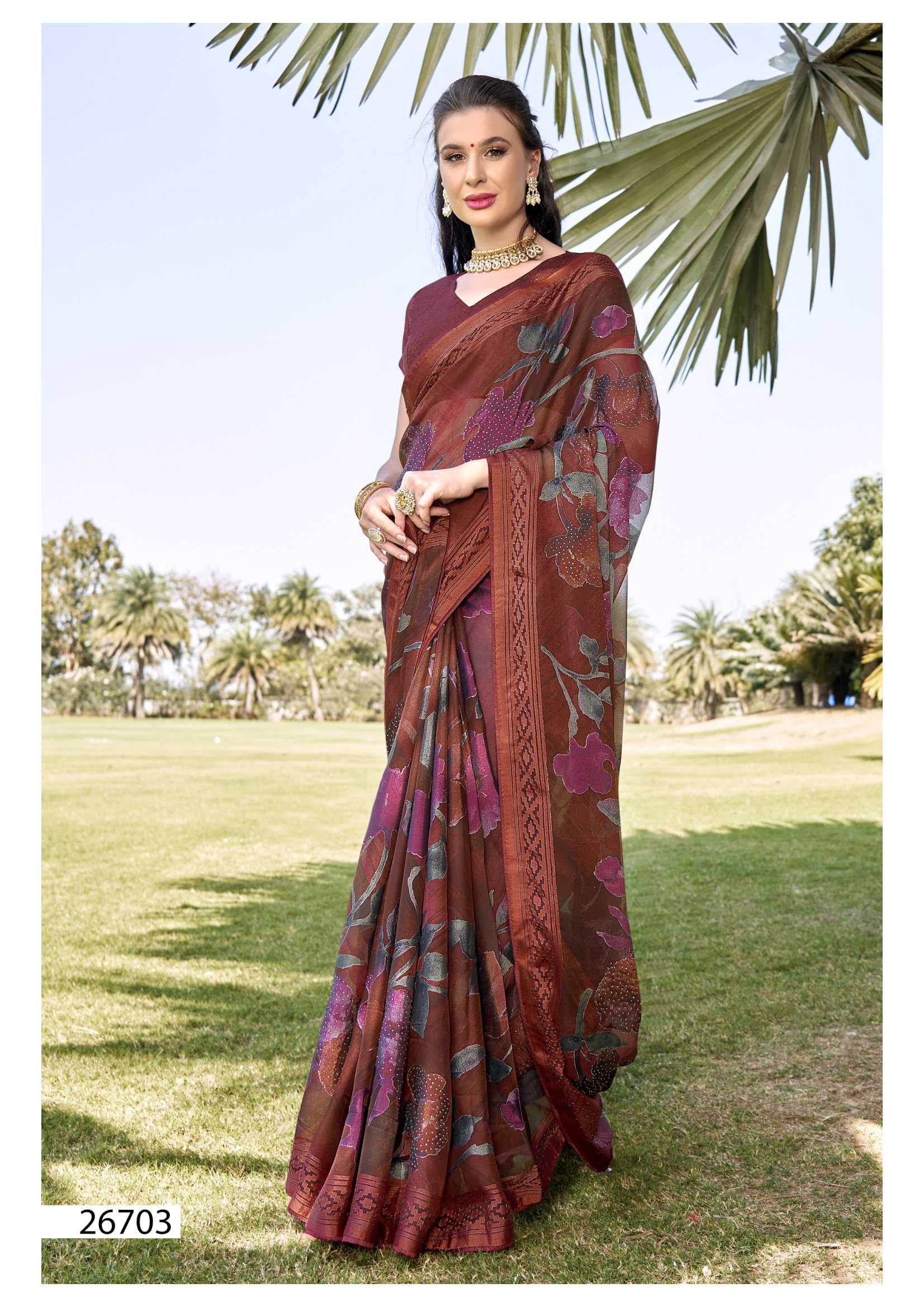 Looking for vallabhi prints rupal 26701-26706 series party wear brasso saree exports Full Catalouge at Best Price? Buy Now vallabhi prints rupal 26701-26706 series party wear brasso saree exports at Wholesale Rate of Rs 7602 with Total 6 Pcs from authroized dealer and supplier of Vallabhi Prints Brand. Cost of Each piece is just only Rs 1267 which is very low and affordable price to resale the product in your retail store. rrgandhi is Surat based Wholesale Supplier & Dealer of Vallabhi Prints Brand. Click on Brand name to Know more about Brand's products.