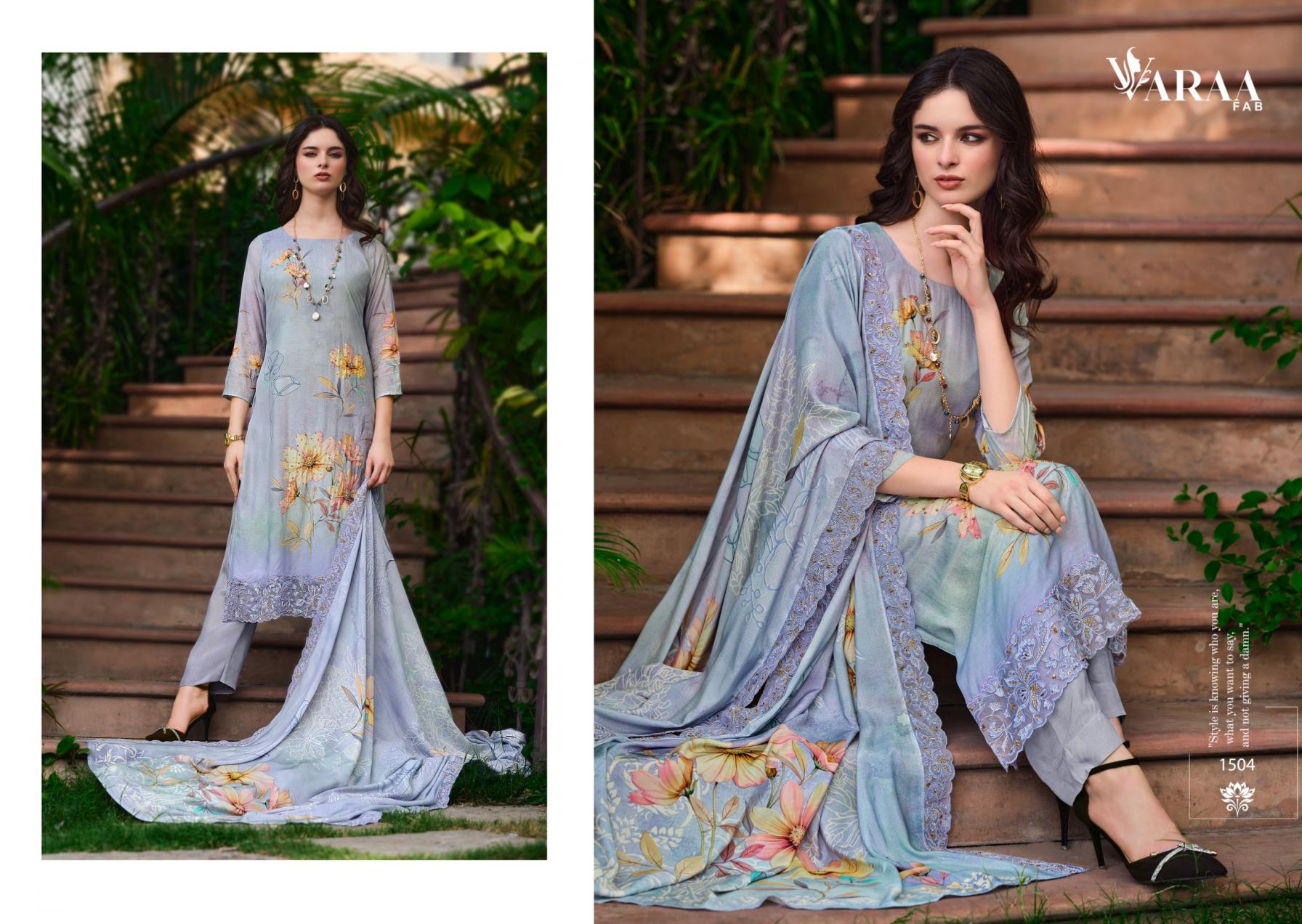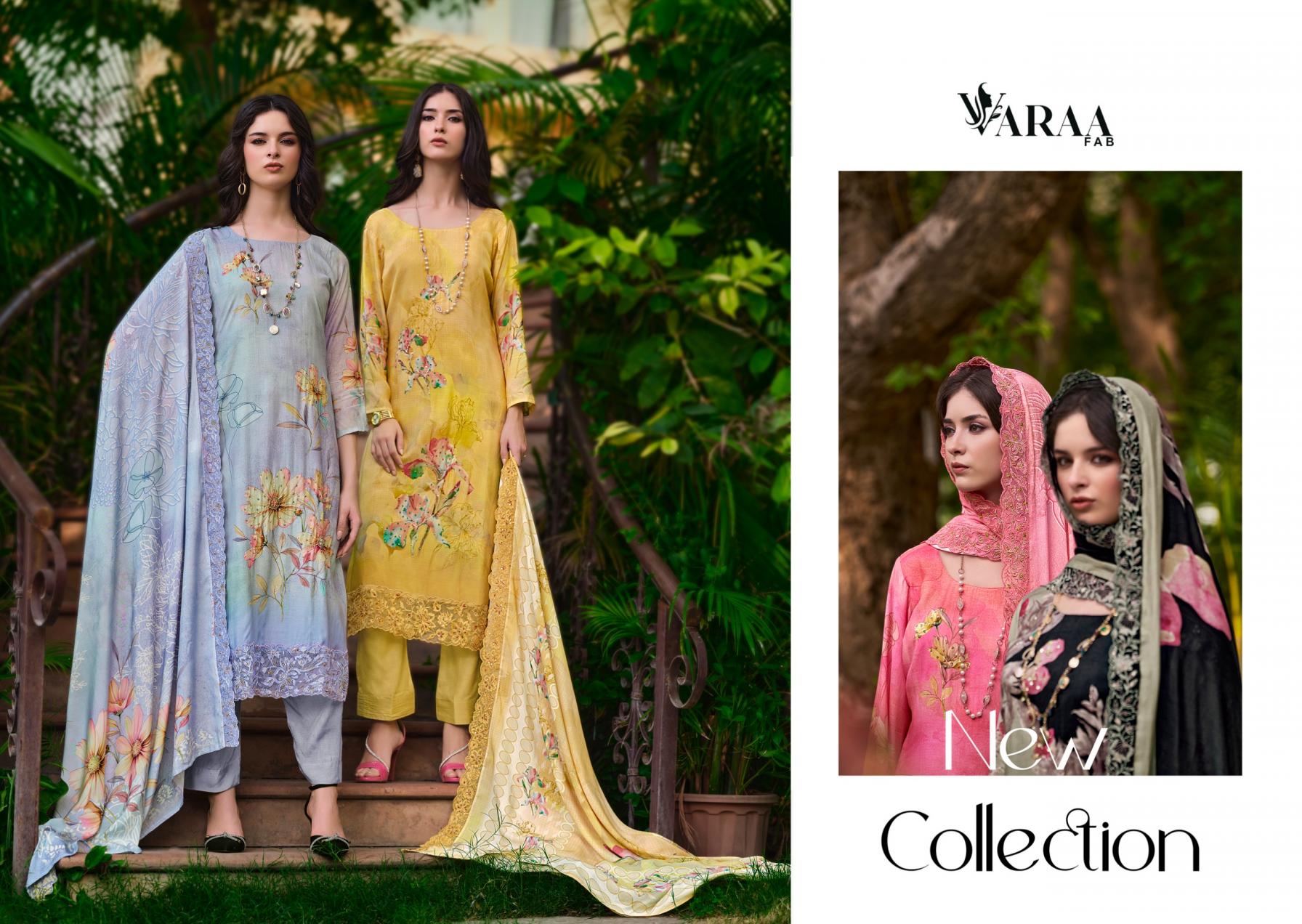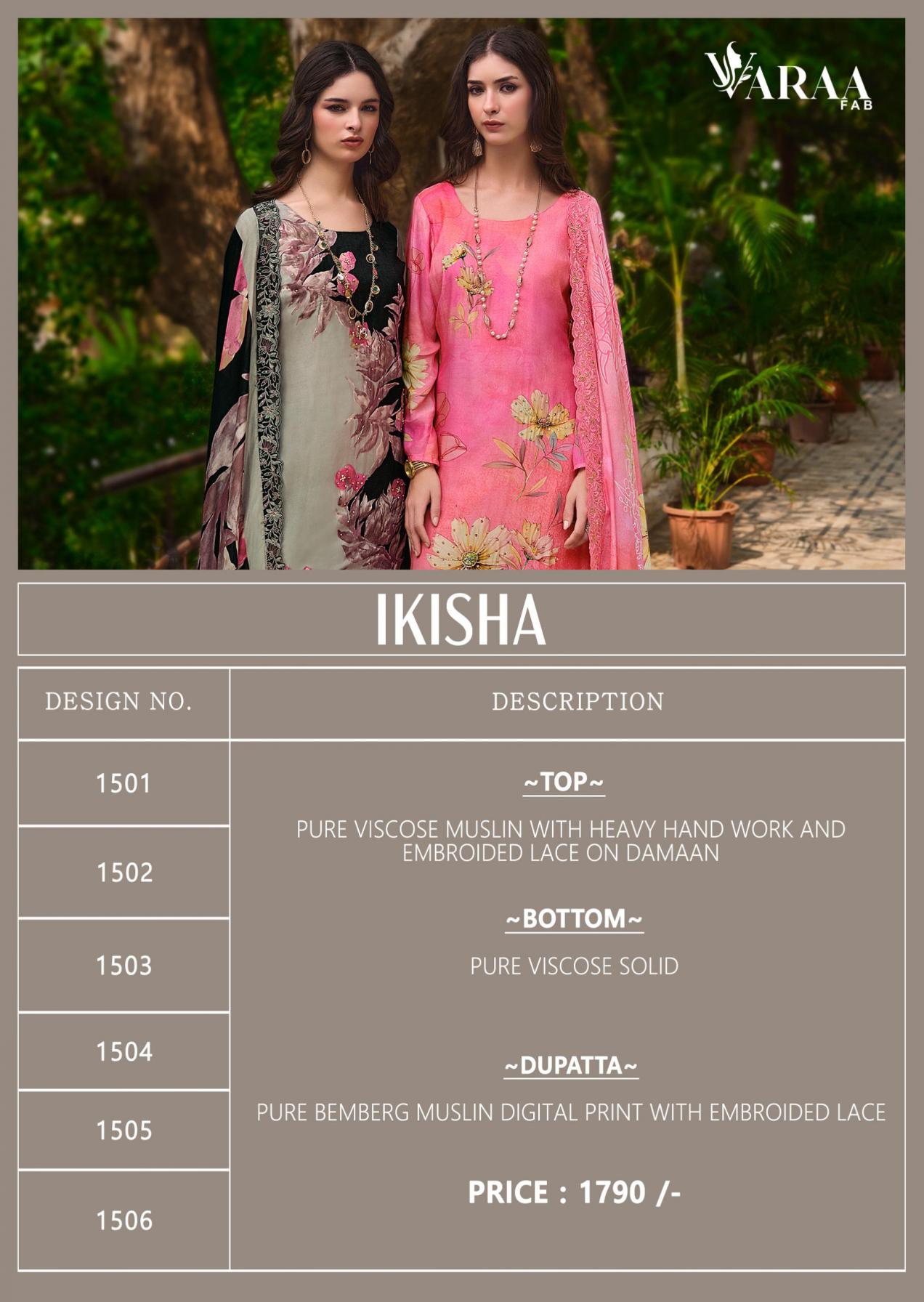 Looking for VARAA FAB IKISHA VISCOSE MUSLIN UNIQUE PAKISTANI SUITS Full Catalouge at Best Price? Buy Now VARAA FAB IKISHA VISCOSE MUSLIN UNIQUE PAKISTANI SUITS at Wholesale Rate of Rs 10740 with Total 6 Pcs from authroized dealer and supplier of Varaa Fab Brand. Cost of Each piece is just only Rs 1790 which is very low and affordable price to resale the product in your retail store. rrgandhi is Surat based Wholesale Supplier & Dealer of Varaa Fab Brand. Click on Brand name to Know more about Brand's products.