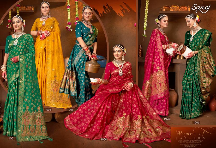 Looking for varuna dola swarovski saroj vol.5 soft dola silk saree Full Catalouge at Best Price? Buy Now varuna dola swarovski saroj vol.5 soft dola silk saree at Wholesale Rate of Rs 6930 with Total 6 Pcs from authroized dealer and supplier of Saroj Textiles Brand. Cost of Each piece is just only Rs 1155 which is very low and affordable price to resale the product in your retail store. rrgandhi is Surat based Wholesale Supplier & Dealer of Saroj Textiles Brand. Click on Brand name to Know more about Brand's products.
