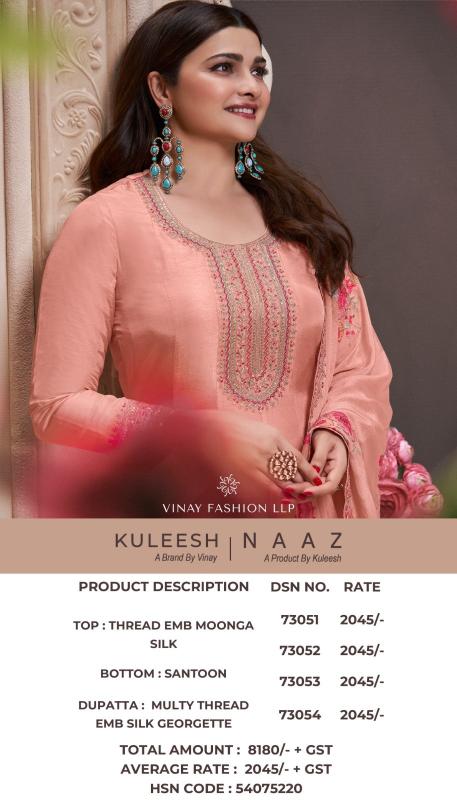 Looking for vinay kuleesh naaz moonga silk elegant style dress material online Full Catalouge at Best Price? Buy Now vinay kuleesh naaz moonga silk elegant style dress material online at Wholesale Rate of Rs 9780 with Total 4 Pcs from authroized dealer and supplier of Vinay Fashion Brand. Cost of Each piece is just only Rs 2445 which is very low and affordable price to resale the product in your retail store. rrgandhi is Surat based Wholesale Supplier & Dealer of Vinay Fashion Brand. Click on Brand name to Know more about Brand's products.