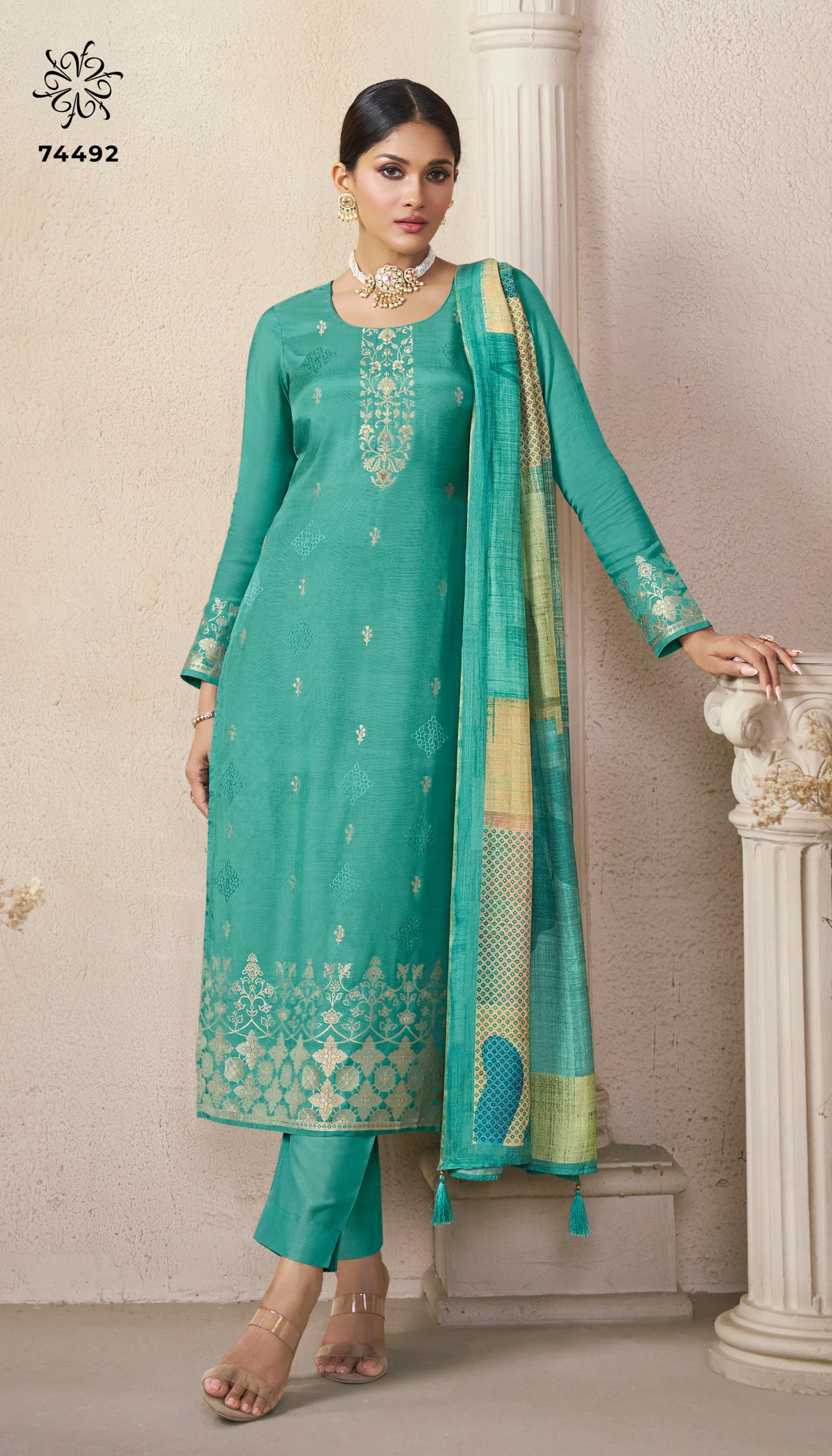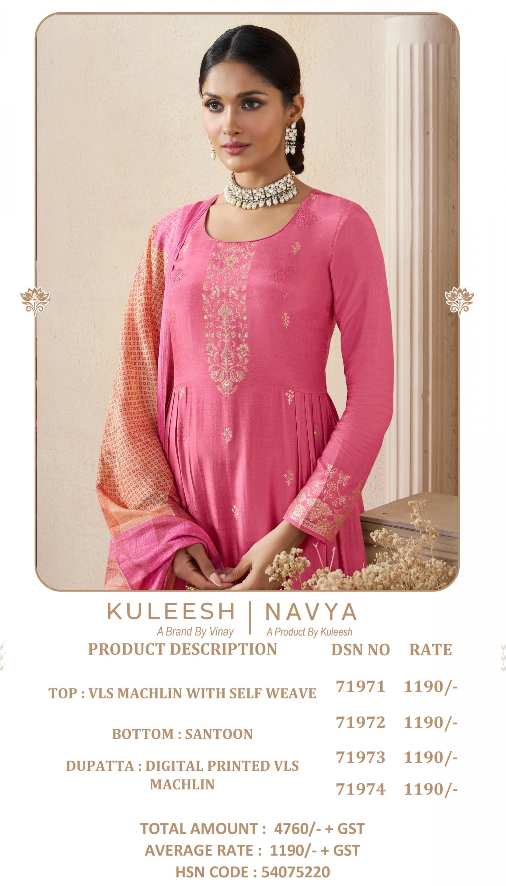 Looking for VINAY KULEESH NAVYA VISCOSE JACQUARD DESIGNER DRESS MATERIALS Full Catalouge at Best Price? Buy Now VINAY KULEESH NAVYA VISCOSE JACQUARD DESIGNER DRESS MATERIALS at Wholesale Rate of Rs 4760 with Total 4 Pcs from authroized dealer and supplier of Vinay Fashion Brand. Cost of Each piece is just only Rs 1190 which is very low and affordable price to resale the product in your retail store. rrgandhi is Surat based Wholesale Supplier & Dealer of Vinay Fashion Brand. Click on Brand name to Know more about Brand's products.