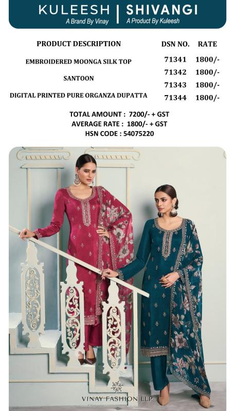 Looking for vinay kuleesh shivangi moonga silk traditional wear unstitch suit Full Catalouge at Best Price? Buy Now vinay kuleesh shivangi moonga silk traditional wear unstitch suit at Wholesale Rate of Rs 7200 with Total 4 Pcs from authroized dealer and supplier of Vinay Fashion Brand. Cost of Each piece is just only Rs 1800 which is very low and affordable price to resale the product in your retail store. rrgandhi is Surat based Wholesale Supplier & Dealer of Vinay Fashion Brand. Click on Brand name to Know more about Brand's products.