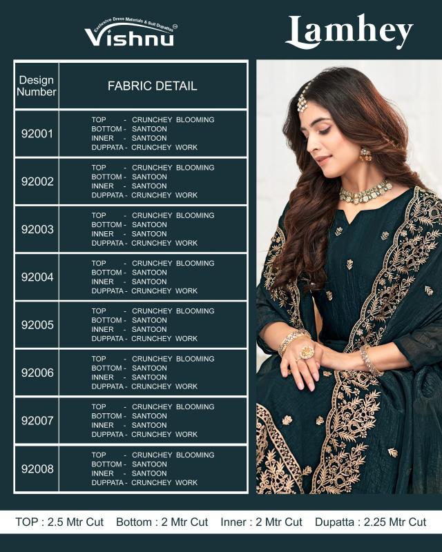Looking for vishnu lamhey crunchey blooming designer salwar kameez sets Full Catalouge at Best Price? Buy Now vishnu lamhey crunchey blooming designer salwar kameez sets at Wholesale Rate of Rs 7160 with Total 8 Pcs from authroized dealer and supplier of Vishnu Brand. Cost of Each piece is just only Rs 895 which is very low and affordable price to resale the product in your retail store. rrgandhi is Surat based Wholesale Supplier & Dealer of Vishnu Brand. Click on Brand name to Know more about Brand's products.