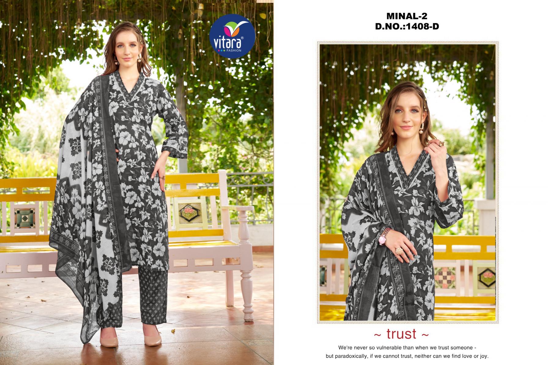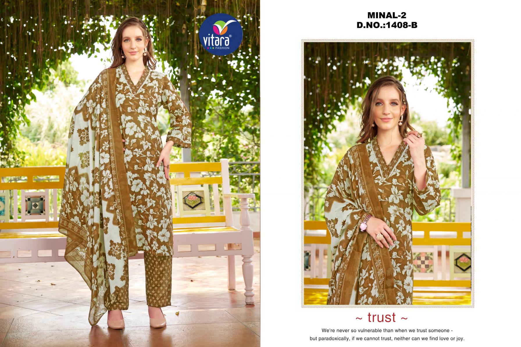 Looking for VITARA FASHION MINAL VOL 2 COTTON CLASSIC COMBO FULL STITCH 3PCS DRESS Full Catalouge at Best Price? Buy Now VITARA FASHION MINAL VOL 2 COTTON CLASSIC COMBO FULL STITCH 3PCS DRESS at Wholesale Rate of Rs 8960 with Total 16 Pcs from authroized dealer and supplier of Vitara Fashion Brand. Cost of Each piece is just only Rs 560 which is very low and affordable price to resale the product in your retail store. rrgandhi is Surat based Wholesale Supplier & Dealer of Vitara Fashion Brand. Click on Brand name to Know more about Brand's products.
