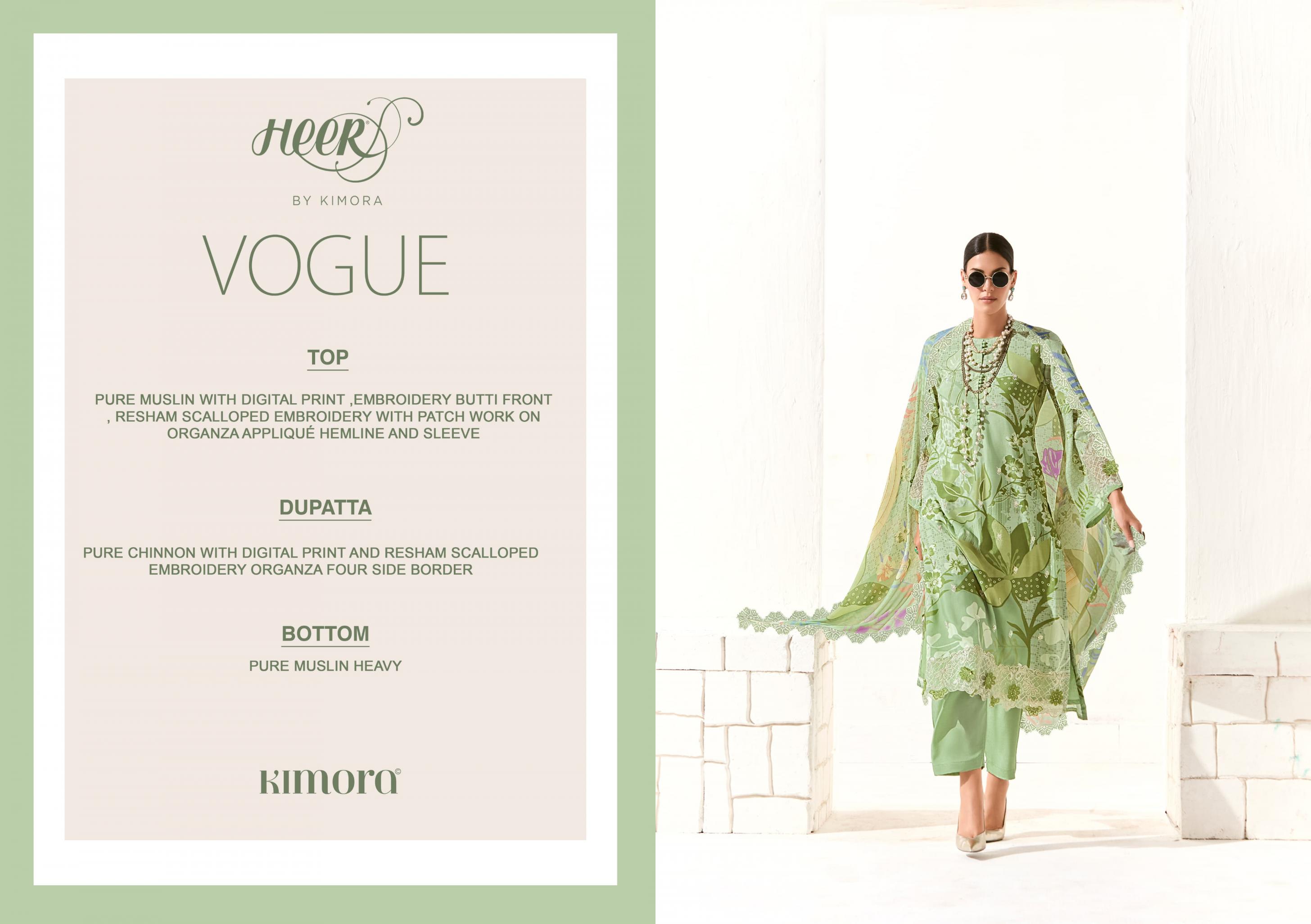 Looking for VOGUE VOL 218 BY HEER KIMORA MUSLIN UNIQUE UNSTITCH 3PCS DRESS Full Catalouge at Best Price? Buy Now VOGUE VOL 218 BY HEER KIMORA MUSLIN UNIQUE UNSTITCH 3PCS DRESS at Wholesale Rate of Rs 12540 with Total 6 Pcs from authroized dealer and supplier of KIMORA Brand. Cost of Each piece is just only Rs 2090 which is very low and affordable price to resale the product in your retail store. rrgandhi is Surat based Wholesale Supplier & Dealer of KIMORA Brand. Click on Brand name to Know more about Brand's products.