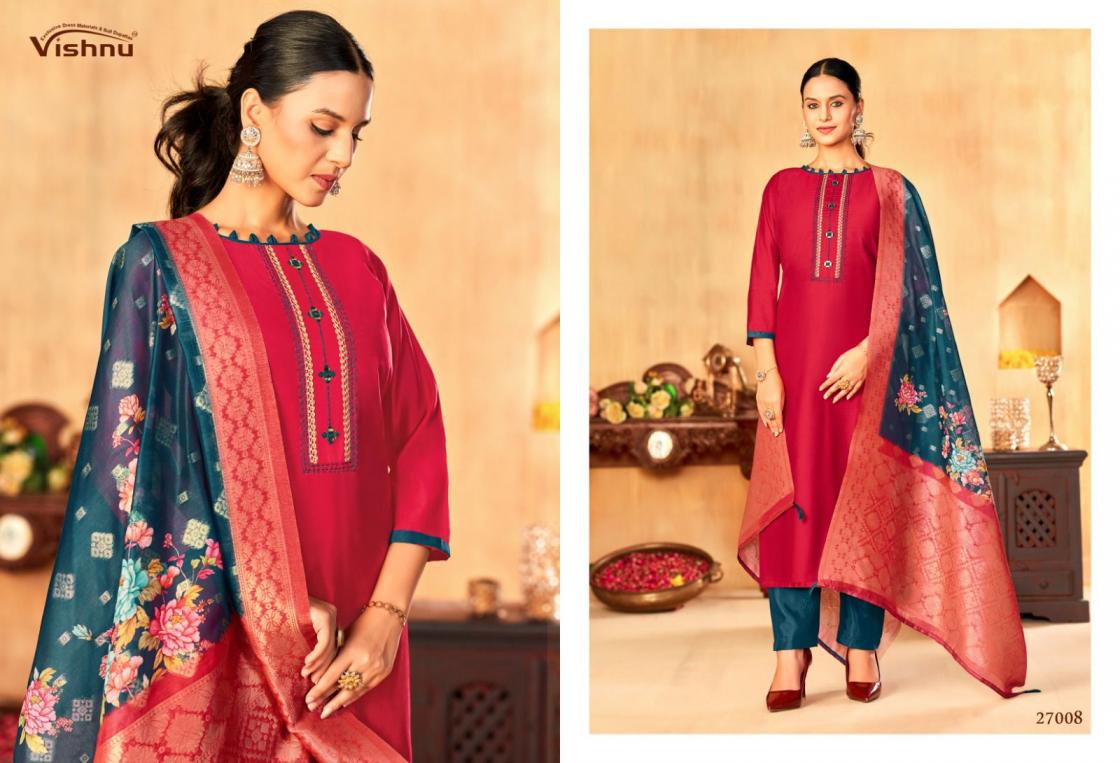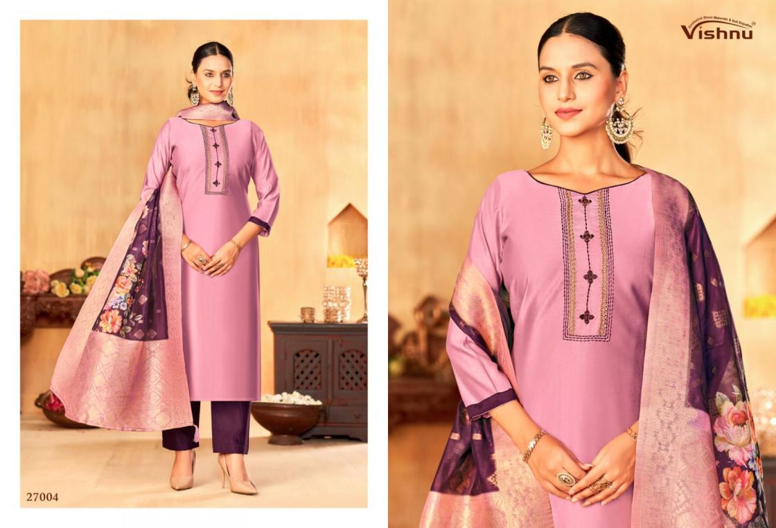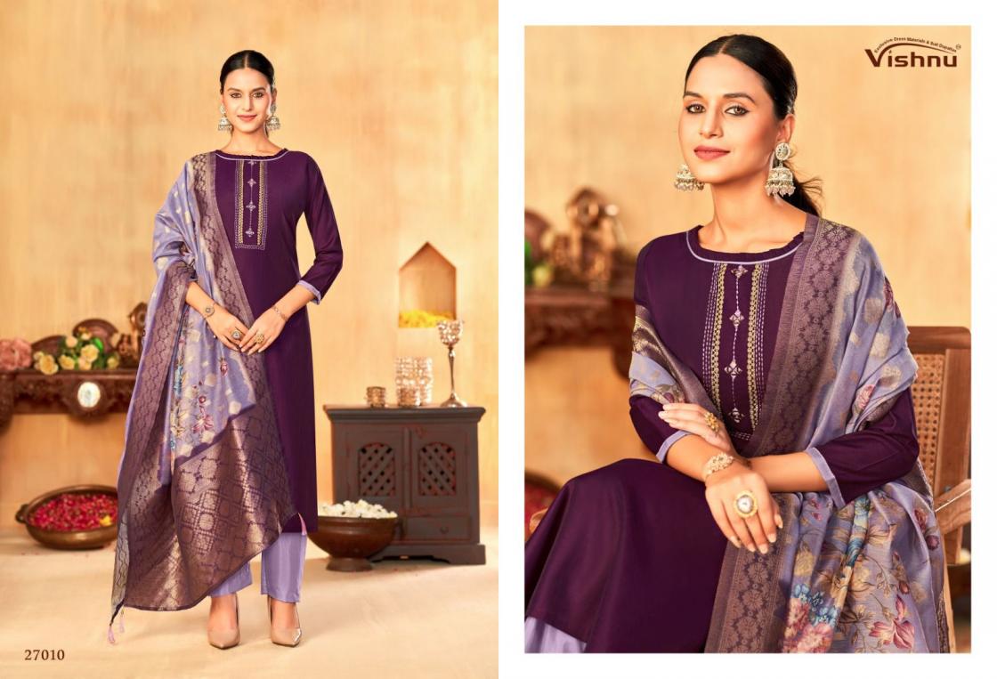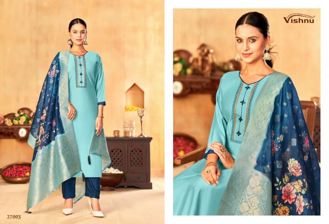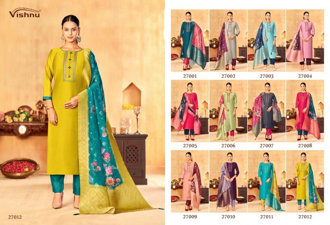 Looking for VYOMIKA BY VISHNU IMPEX GADWAL SILK HIT DESIGN FULL STITCH SUITS ONLINE Full Catalouge at Best Price? Buy Now VYOMIKA BY VISHNU IMPEX GADWAL SILK HIT DESIGN FULL STITCH SUITS ONLINE at Wholesale Rate of Rs 13200 with Total 12 Pcs from authroized dealer and supplier of Vishnu Brand. Cost of Each piece is just only Rs 1100 which is very low and affordable price to resale the product in your retail store. rrgandhi is Surat based Wholesale Supplier & Dealer of Vishnu Brand. Click on Brand name to Know more about Brand's products.