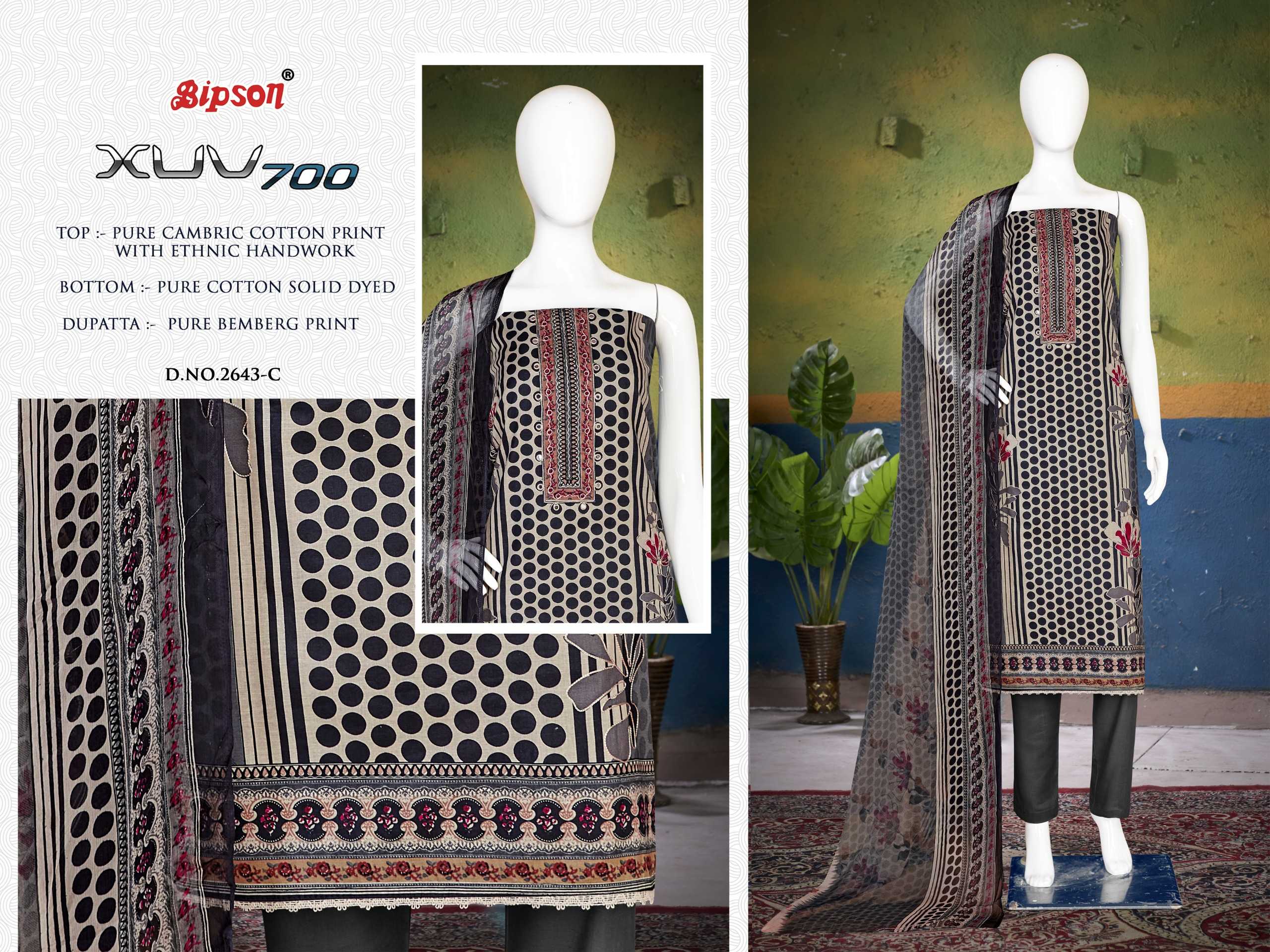 Looking for XUV 700 2643 BY BIPSON PRINT PURE CAMBRIC COTTON BEAUTIFUL TOP BOTTOM WITH DUPATTA Full Catalouge at Best Price? Buy Now XUV 700 2643 BY BIPSON PRINT PURE CAMBRIC COTTON BEAUTIFUL TOP BOTTOM WITH DUPATTA at Wholesale Rate of Rs 2900 with Total 4 Pcs from authroized dealer and supplier of Bipson Fashion Brand. Cost of Each piece is just only Rs 725 which is very low and affordable price to resale the product in your retail store. rrgandhi is Surat based Wholesale Supplier & Dealer of Bipson Fashion Brand. Click on Brand name to Know more about Brand's products.
