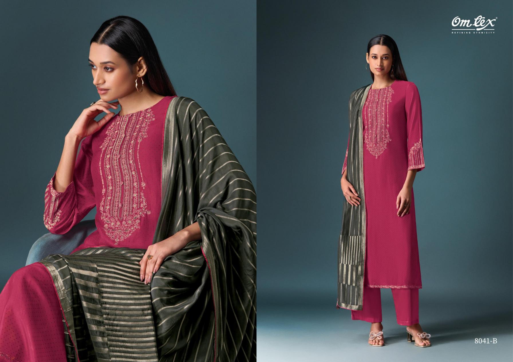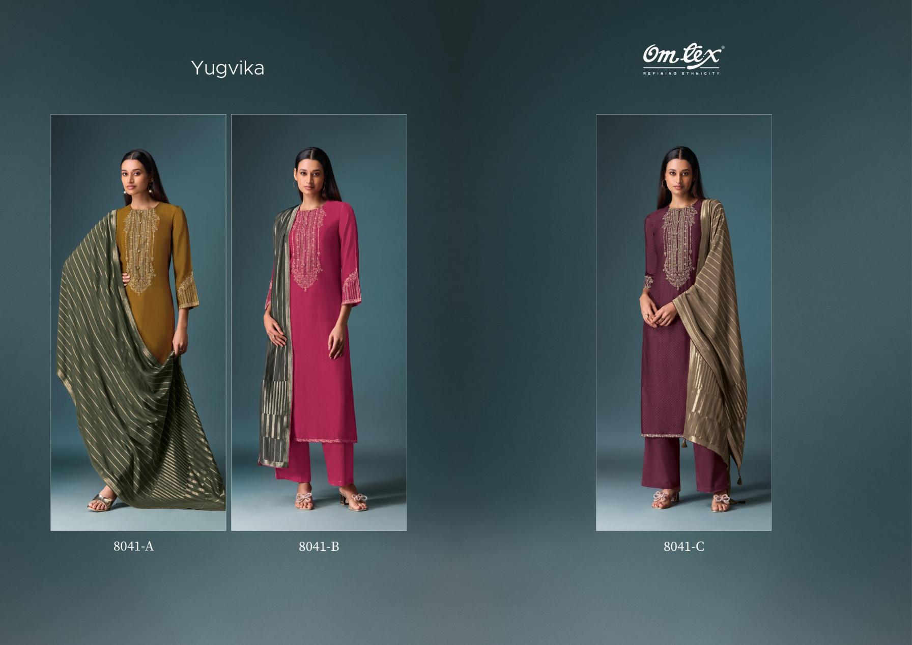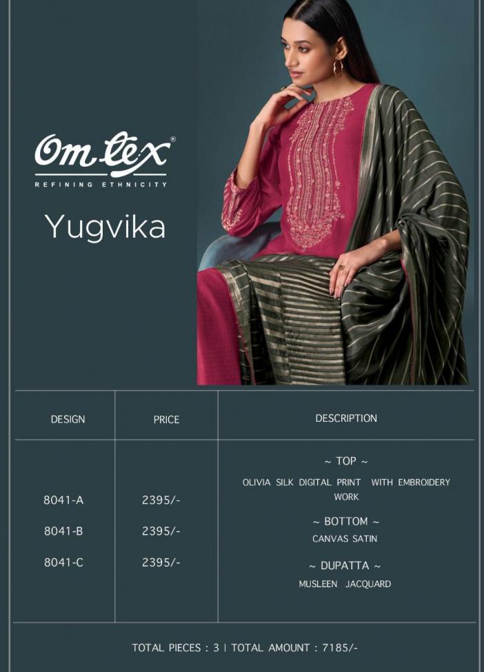 Looking for YUGVIKA BY OMTEX OLIVIA SILK BEST RATE SALWAR KAMEEZ Full Catalouge at Best Price? Buy Now YUGVIKA BY OMTEX OLIVIA SILK BEST RATE SALWAR KAMEEZ at Wholesale Rate of Rs 7185 with Total 3 Pcs from authroized dealer and supplier of Om Tex Brand. Cost of Each piece is just only Rs 2395 which is very low and affordable price to resale the product in your retail store. rrgandhi is Surat based Wholesale Supplier & Dealer of Om Tex Brand. Click on Brand name to Know more about Brand's products.
